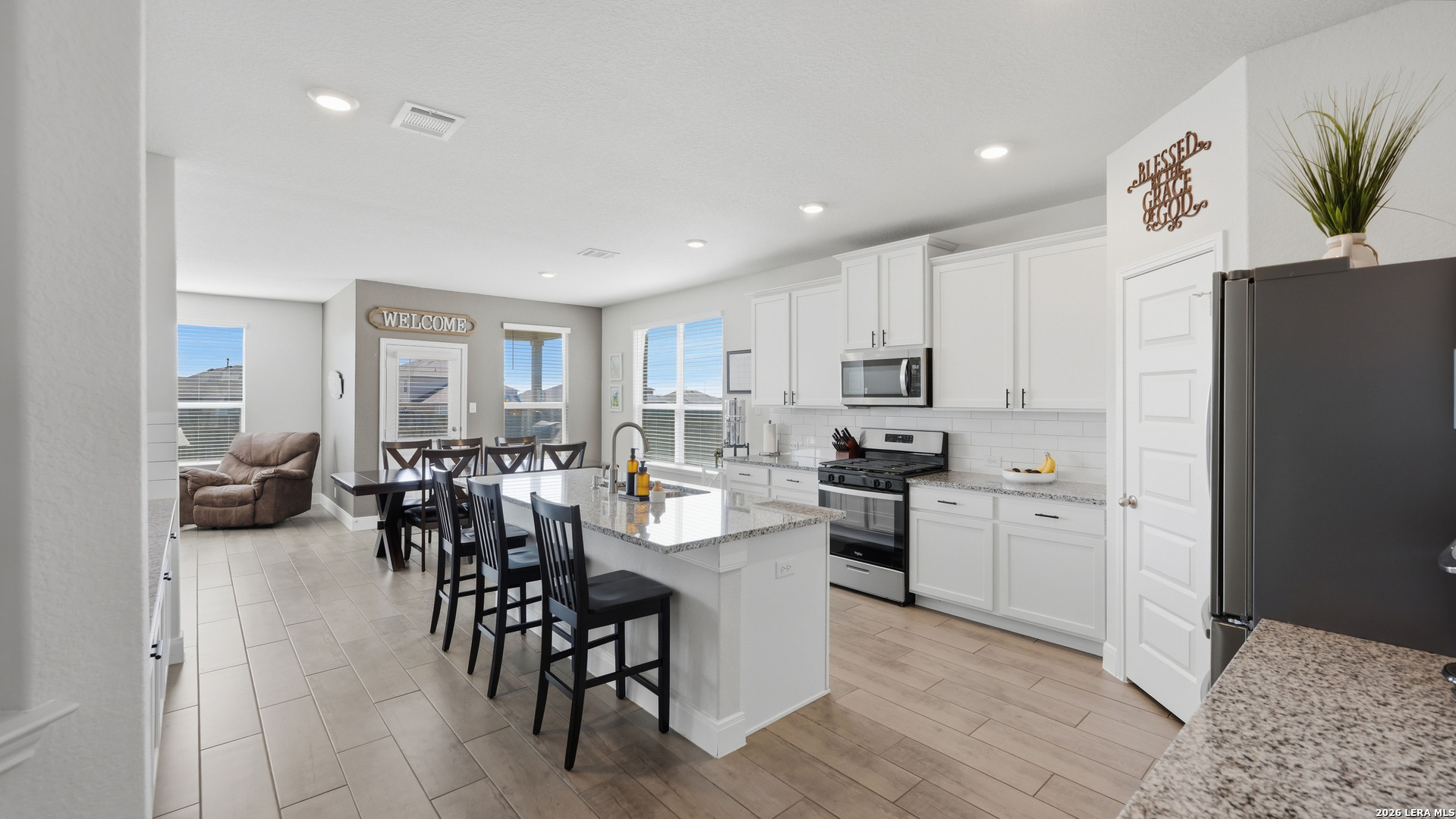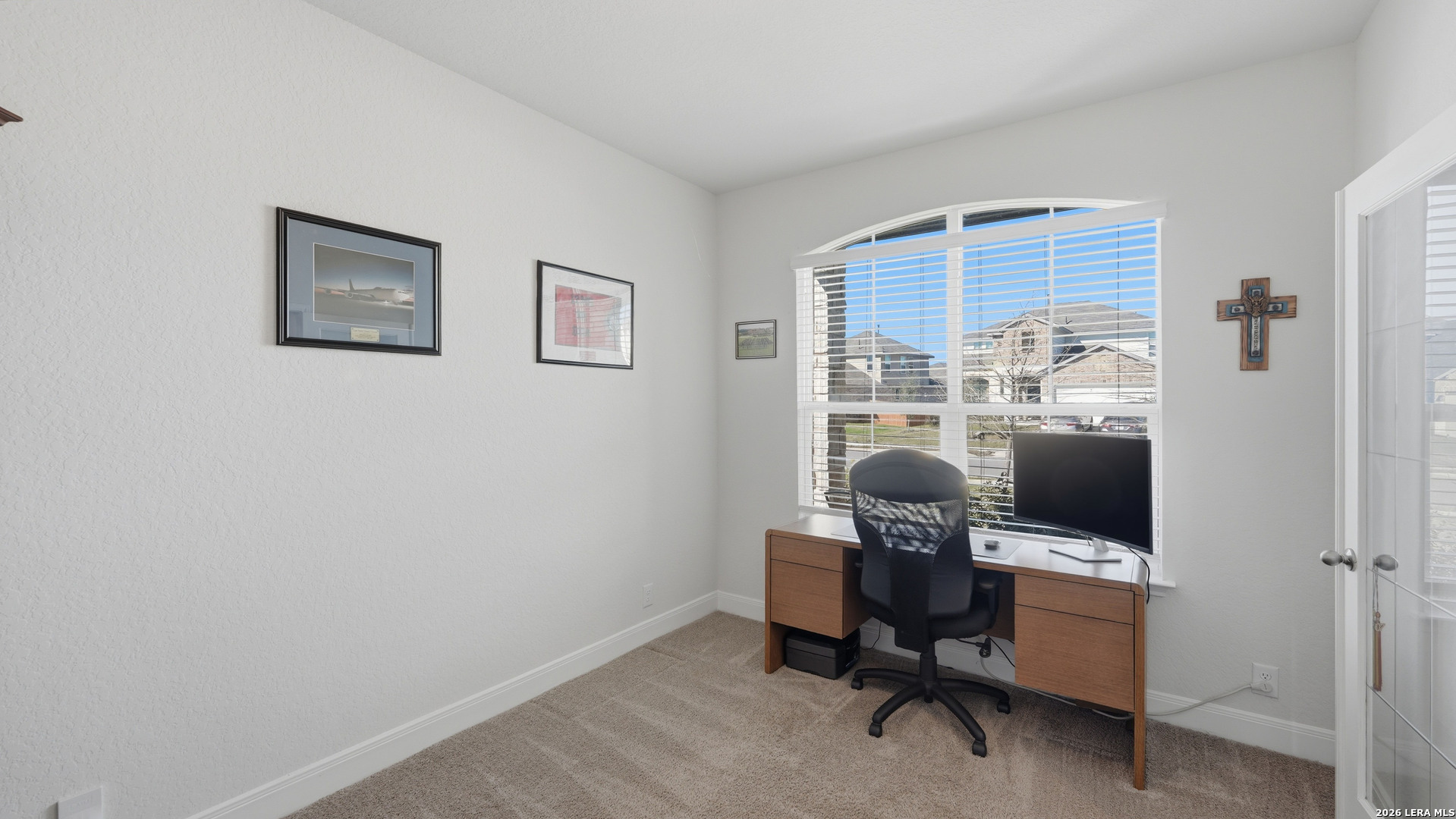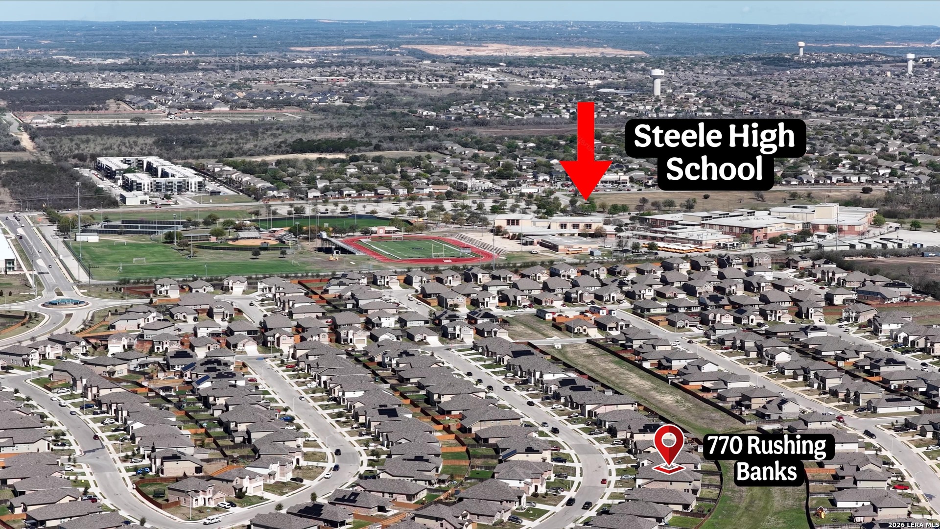 Welcome to this spacious home in the desirable Steele Creek community. The main level offers a functional layout with a dedicated office featuring double glass doors, a formal dining area, and an open-concept living space designed for comfortable everyday living. The kitchen features a large island, granite countertops, gas stove, plenty of cabinet storage, and generous countertop space, making it perfect for both cooking and entertaining. Additional storage can be found throughout the home, including a convenient closet located in the living area. High ceilings create a bright and open feel, while a practical mud area adds everyday convenience. The primary suite is privately located on the main level and features dual closets, a double vanity, and a separate soaking tub and shower for a relaxing retreat. Upstairs you'll find the additional bedrooms along with a massive loft that provides excellent flexibility for a second living area, game room, or study space. One of the upstairs bedrooms includes its own en-suite bathroom, making it ideal for guests or added privacy. The media room, wired for surround sound, can also function as a fifth bedroom depending on your needs. The backyard offers added privacy with no rear neighbors, creating a peaceful setting to relax or entertain. Located within walking distance to the local high school and close to community amenities including a pool, basketball court, playground, and walking trails. One of the larger floor plans in the Steele Creek community, this home offers the space, layout, storage, and flexibility buyers are looking for. Conveniently located near grocery stores, local coffee shops, dining, and entertainment, while still offering an easy commute of approximately 20 minutes to Randolph Air Force Base.