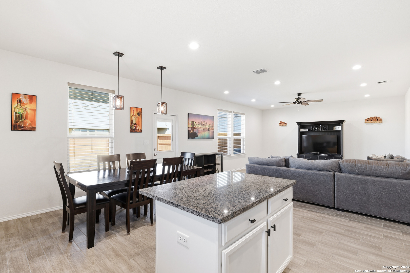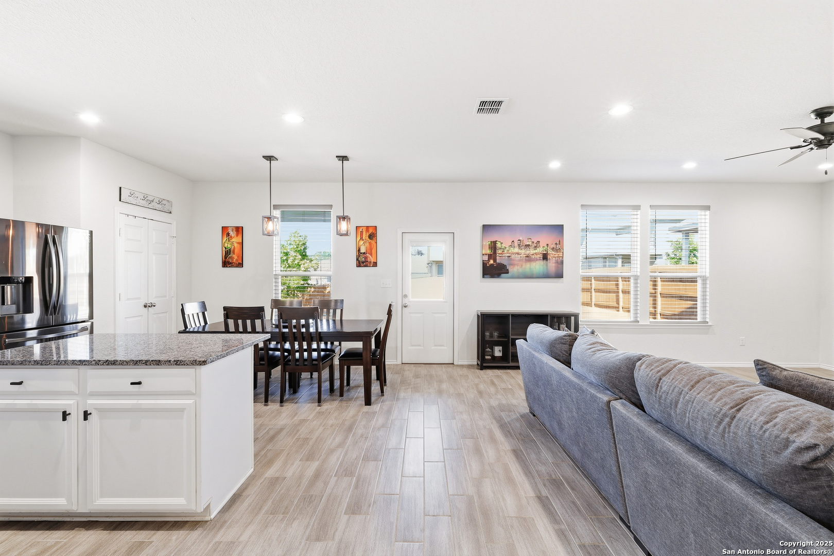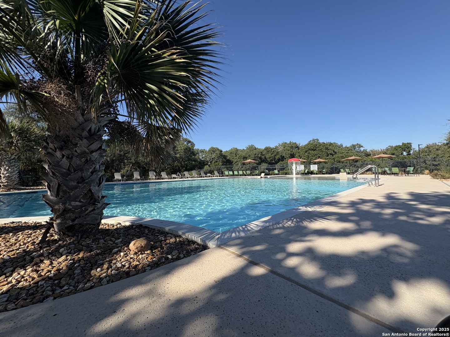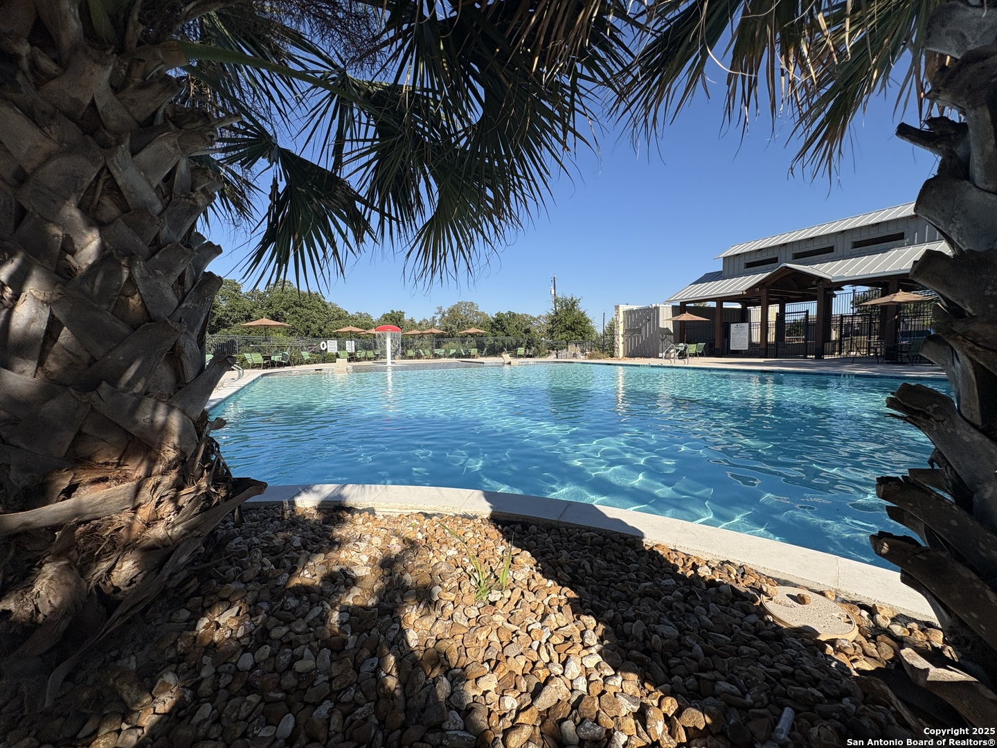 Corner Lot Alert! Nestled in desirable Boerne and surrounded by the stunning Texas Hill Country, this home truly checks all the boxes. The curb appeal has a light stone exterior accented by a vibrant front door and matching shutters that give the home a fresh, inviting look. Step inside to an ideal floor plan featuring a first-floor full bath and an open layout perfect for everyday living or entertaining. The island kitchen is a standout, offering stainless steel appliances, built-in microwave, tile backsplash, granite counters, and beautifully molded cabinetry-all overlooking the breakfast area and living room. Neutral, easy-to-maintain tile flooring flows seamlessly throughout the main level. Upstairs, you're greeted by a huge second living area-perfect for a game room, media space, or additional lounge area. The spacious primary suite includes a double vanity with quartz countertop, walk-in shower, and separate soaking tub. Two generously sized secondary bedrooms share a well-appointed full bath with quartz vanity, linen closet, and added wall cabinetry for extra storage. The oversized backyard features a covered patio and privacy fence, ideal for outdoor gatherings or quiet evenings. Additional upgrades include a sprinkler system, water softener, kitchen sink/refrigerator reverse osmosis system, upgraded recessed lighting throughout, and ceiling fans in much of the upstairs. Conveniently located near shopping and just a short drive to San Antonio or the Hill Country, this home offers both comfort and accessibility. Plus, the neighborhood pool is perfect for cooling off on warm Texas summer days.
