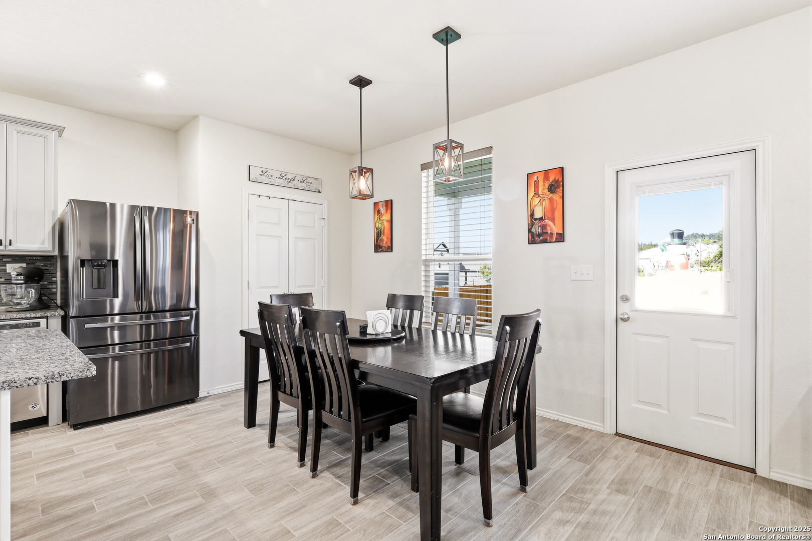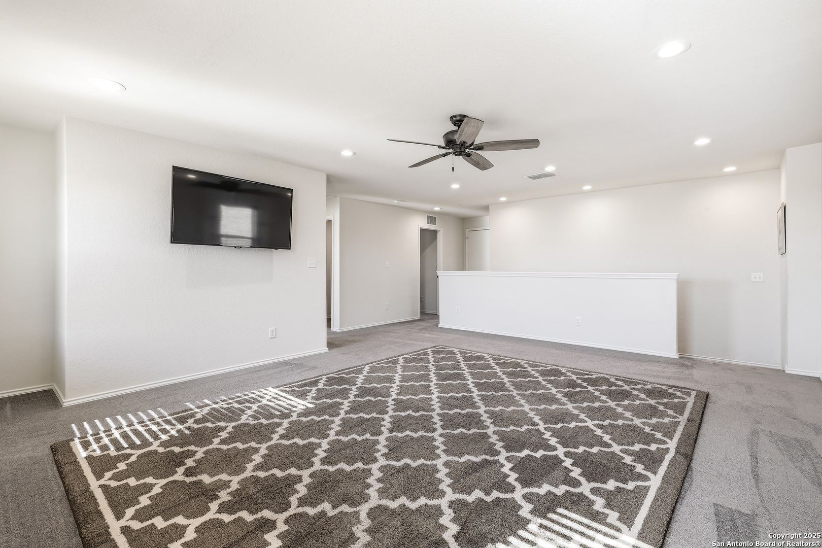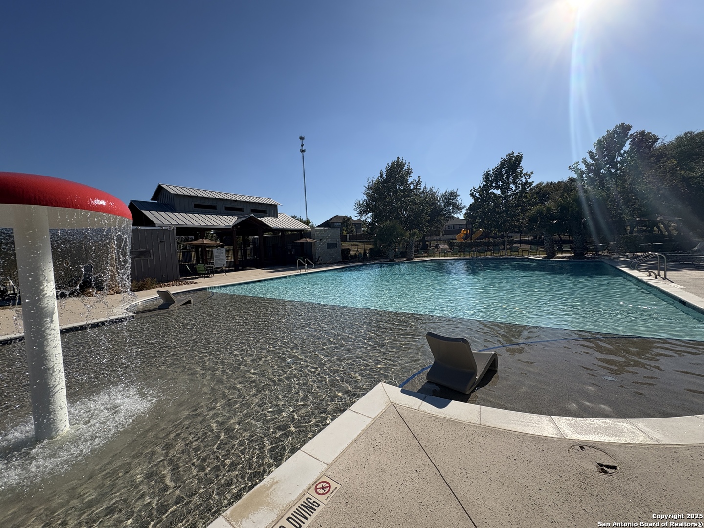 Corner Lot Alert! Nestled in desirable Boerne and surrounded by the stunning Texas Hill Country, this home truly checks all the boxes. The curb appeal has a light stone exterior accented by a vibrant front door and matching shutters that give the home a fresh, inviting look. Step inside to an ideal floor plan featuring a first-floor full bath and an open layout perfect for everyday living or entertaining. The island kitchen is a standout, offering stainless steel appliances, built-in microwave, tile backsplash, granite counters, and beautifully molded cabinetry-all overlooking the breakfast area and living room. Neutral, easy-to-maintain tile flooring flows seamlessly throughout the main level. Upstairs, you're greeted by a huge second living area-perfect for a game room, media space, or additional lounge area. The spacious primary suite includes a double vanity with quartz countertop, walk-in shower, and separate soaking tub. Two generously sized secondary bedrooms share a well-appointed full bath with quartz vanity, linen closet, and added wall cabinetry for extra storage. The oversized backyard features a covered patio and privacy fence, ideal for outdoor gatherings or quiet evenings. Additional upgrades include a sprinkler system, water softener, kitchen sink/refrigerator reverse osmosis system, upgraded recessed lighting throughout, and ceiling fans in much of the upstairs. Conveniently located near shopping and just a short drive to San Antonio or the Hill Country, this home offers both comfort and accessibility. Plus, the neighborhood pool is perfect for cooling off on warm Texas summer days.
