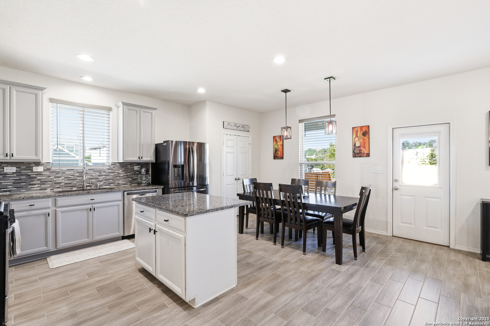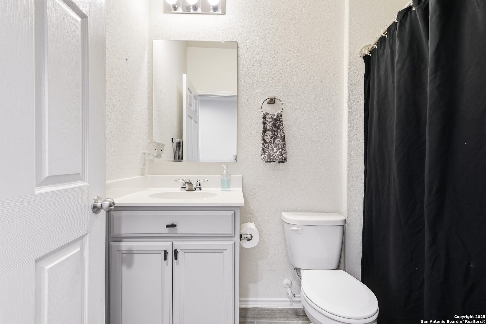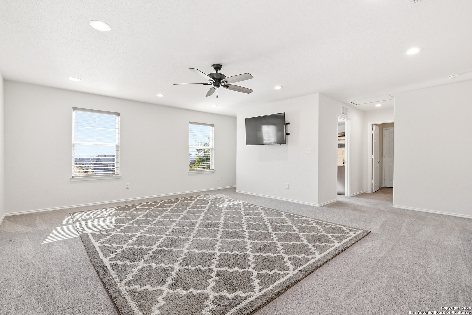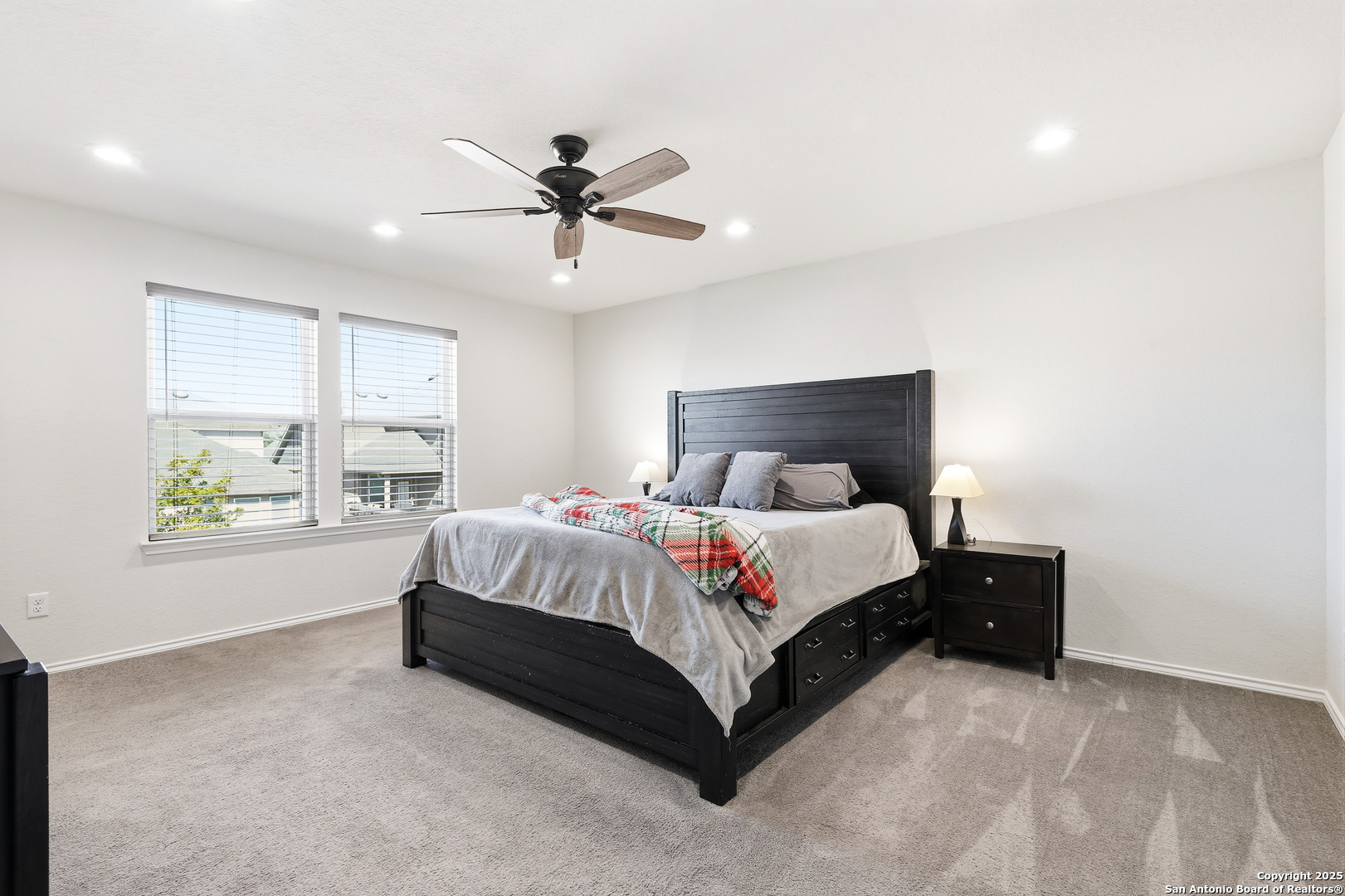 Corner Lot Alert! Nestled in desirable Boerne and surrounded by the stunning Texas Hill Country, this home truly checks all the boxes. The curb appeal has a light stone exterior accented by a vibrant front door and matching shutters that give the home a fresh, inviting look. Step inside to an ideal floor plan featuring a first-floor full bath and an open layout perfect for everyday living or entertaining. The island kitchen is a standout, offering stainless steel appliances, built-in microwave, tile backsplash, granite counters, and beautifully molded cabinetry-all overlooking the breakfast area and living room. Neutral, easy-to-maintain tile flooring flows seamlessly throughout the main level. Upstairs, you're greeted by a huge second living area-perfect for a game room, media space, or additional lounge area. The spacious primary suite includes a double vanity with quartz countertop, walk-in shower, and separate soaking tub. Two generously sized secondary bedrooms share a well-appointed full bath with quartz vanity, linen closet, and added wall cabinetry for extra storage. The oversized backyard features a covered patio and privacy fence, ideal for outdoor gatherings or quiet evenings. Additional upgrades include a sprinkler system, water softener, kitchen sink/refrigerator reverse osmosis system, upgraded recessed lighting throughout, and ceiling fans in much of the upstairs. Conveniently located near shopping and just a short drive to San Antonio or the Hill Country, this home offers both comfort and accessibility. Plus, the neighborhood pool is perfect for cooling off on warm Texas summer days.