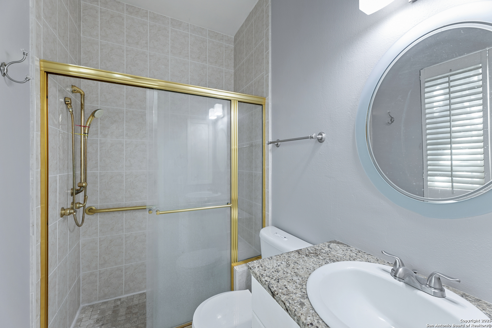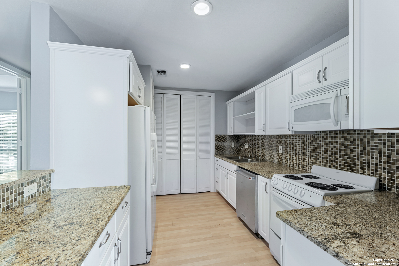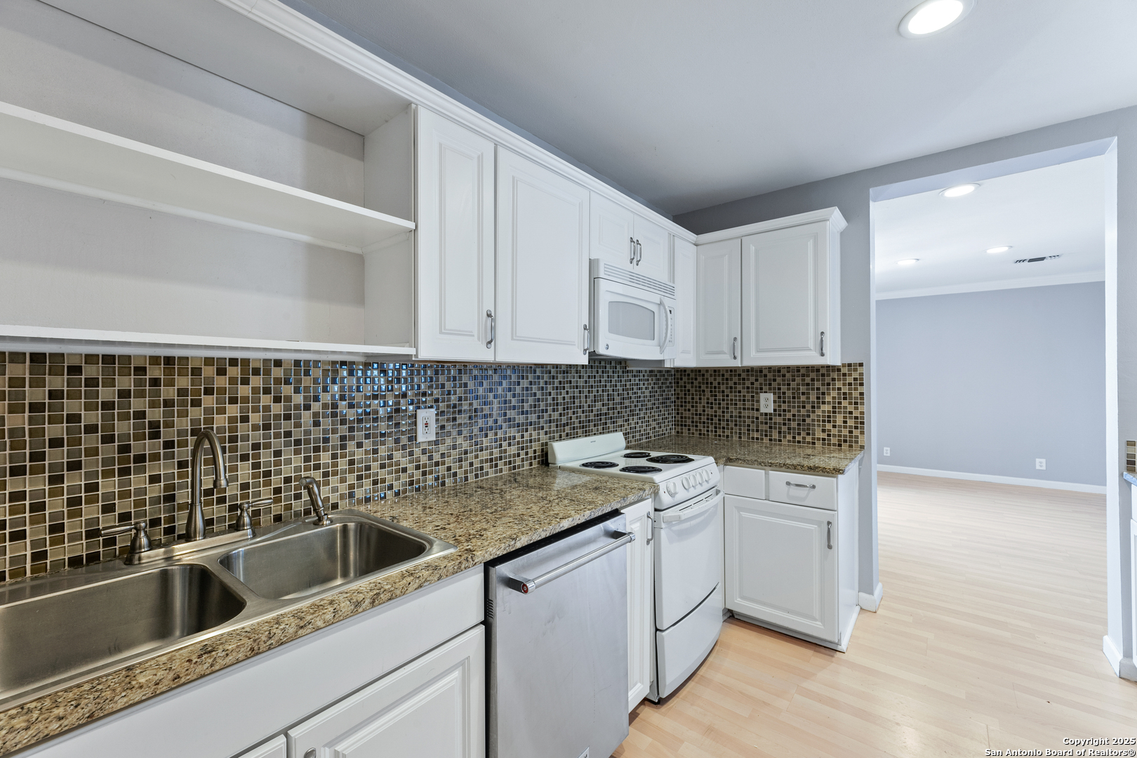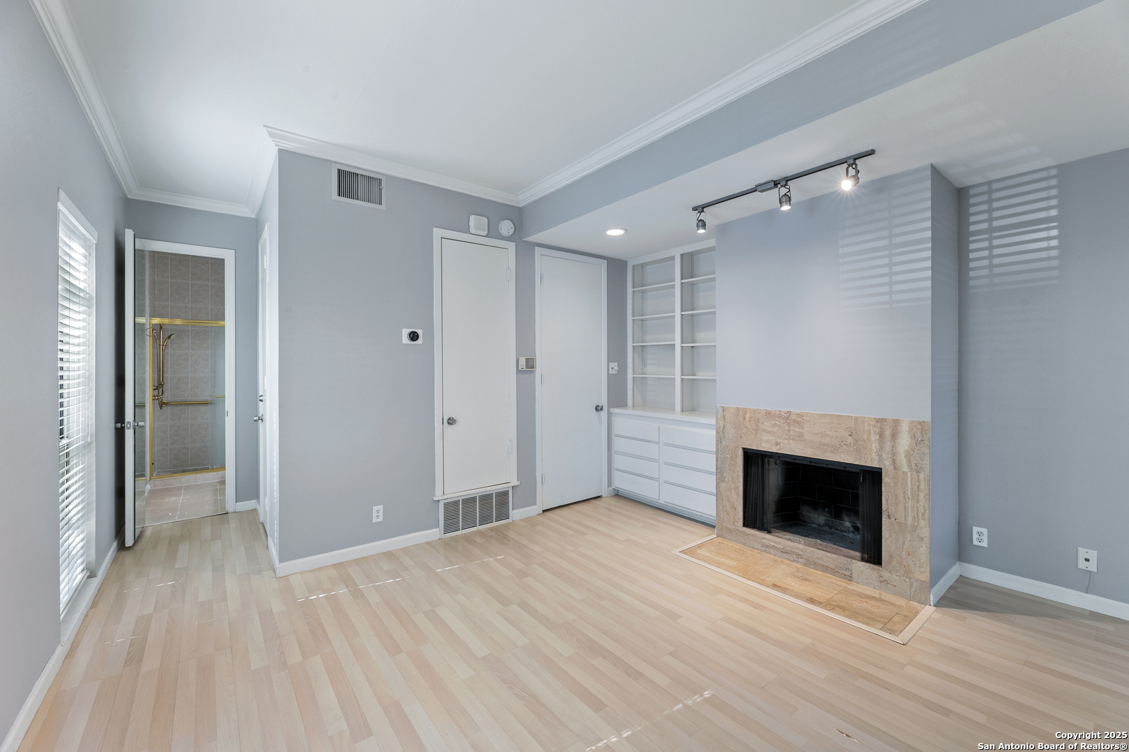 This charming 2 bedroom, 2 bath condo is nestled in one of the most desirable school districts and neighborhoods in San Antonio, offering a perfect blend of comfort, style and convenience. Desirable floorplan with living area separating the two bedrooms each with their own bath. Floorplan is perfect for a child or a roommate situation. Master bedroom has it's own fireplace and bookshelves. Located just steps from upscale shopping and proximity to renowned museums, and fine dining, this residence places you at the heart of culture and sophistication. Enjoy the beautiful landscaping and grounds complete with pickeball courts, dog park and swimming pools.