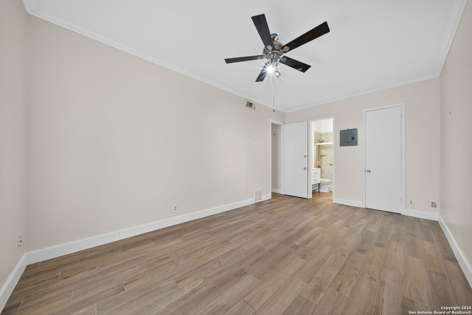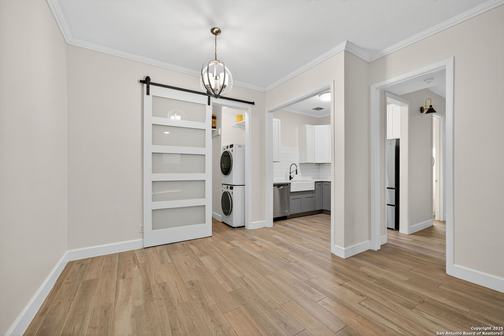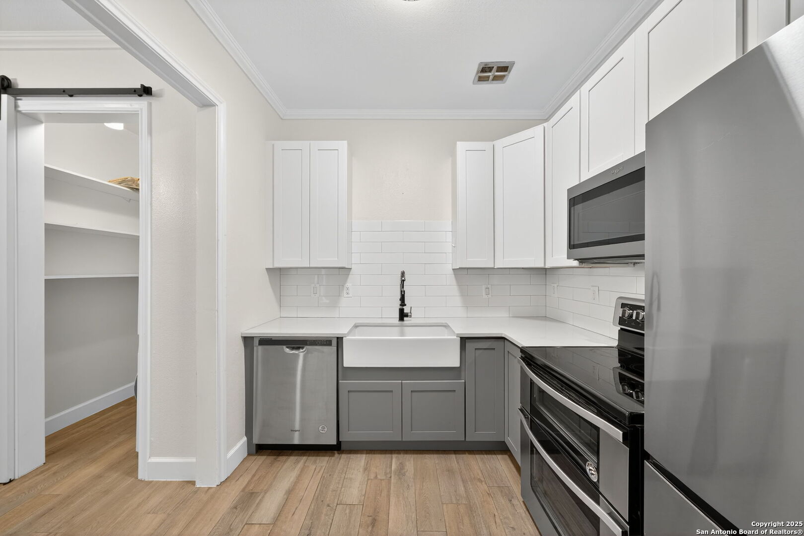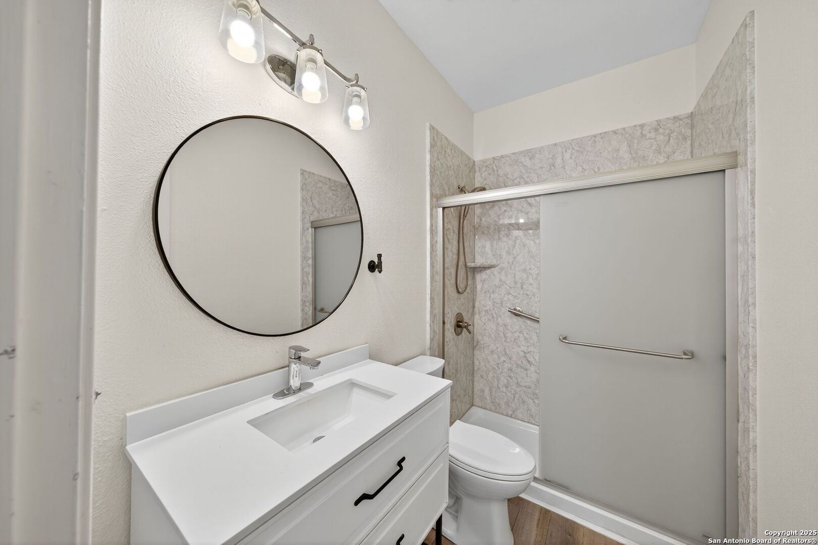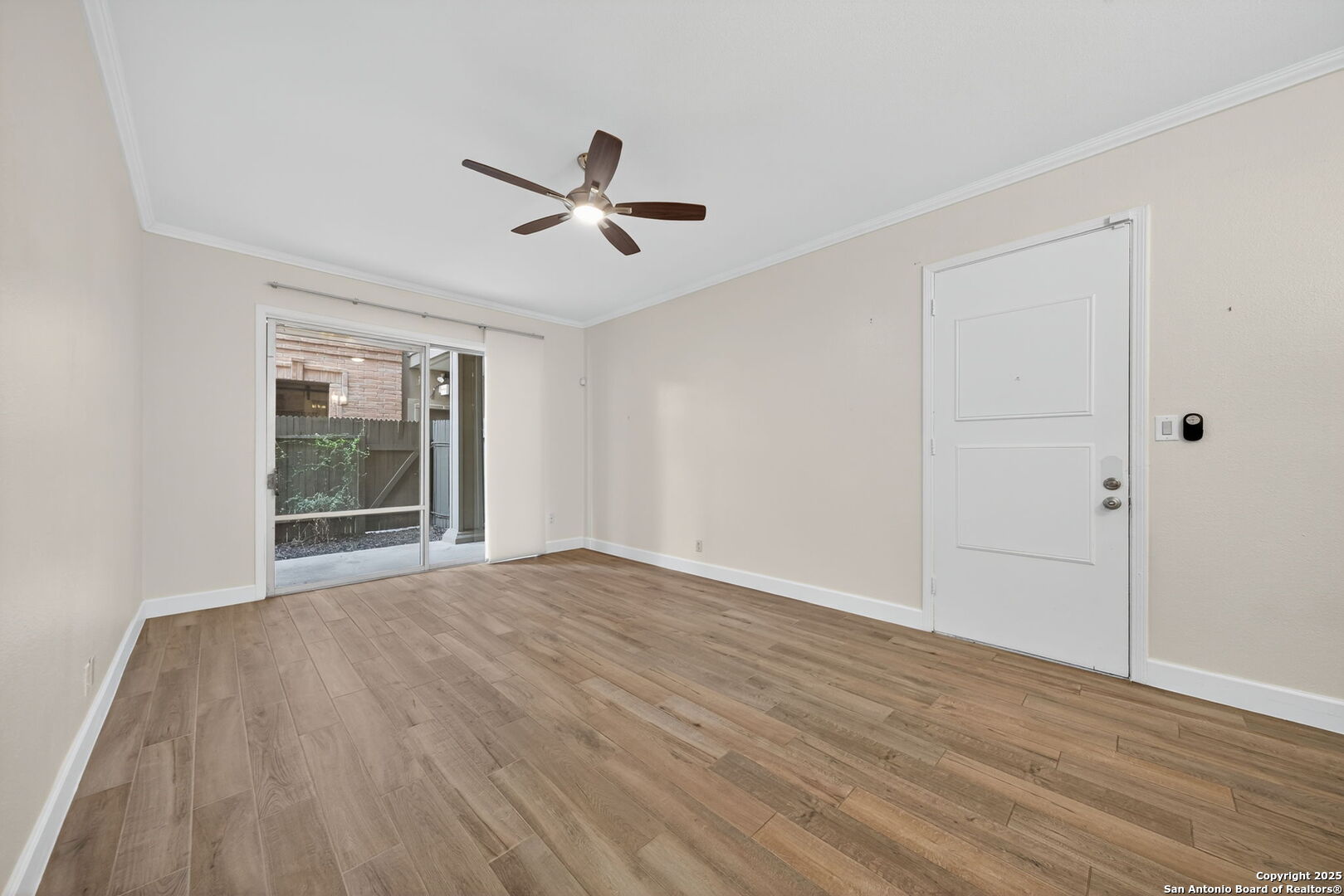 Beautifully remodeled ground-floor condo in the Chateau Dijon of Alamo Heights. Recently updated, featuring wood-look plank flooring throughout, 5" baseboards, a fully renovated kitchen with stainless steel appliance package, and stylishly remodeled bathrooms. A set of barn doors opens to the newly added laundry room, complete with washer and dryer. Generous closet space offers plenty of storage, while a spacious private patio extends your living space outdoors. This home is ideally located near The Quarry with convenient access to 410 and 281, just minutes from Downtown, the San Antonio Airport, Trinity, Incarnate Word, and Fort Sam Houston. Nestled in Alamo Heights ISD, the community is surrounded by a park-like setting with beautiful heritage oaks. Additional highlights include one assigned carport (243), ample guest parking, and new windows to be installed per the HOA. Don't miss this move-in ready gem-schedule your showing today!