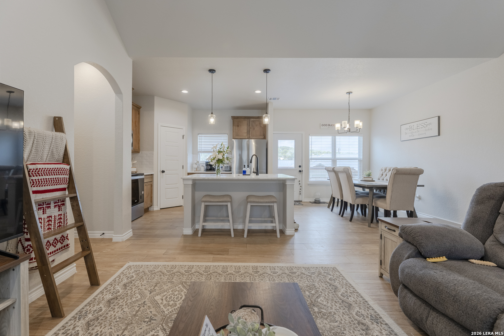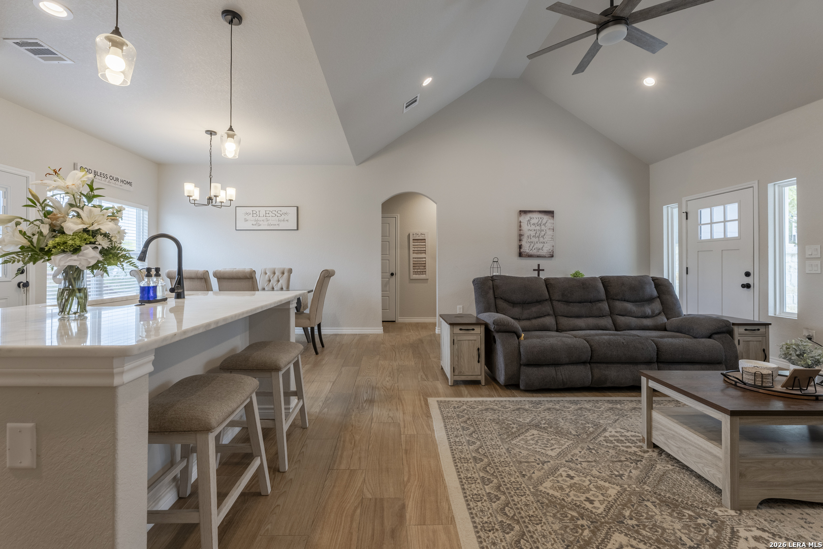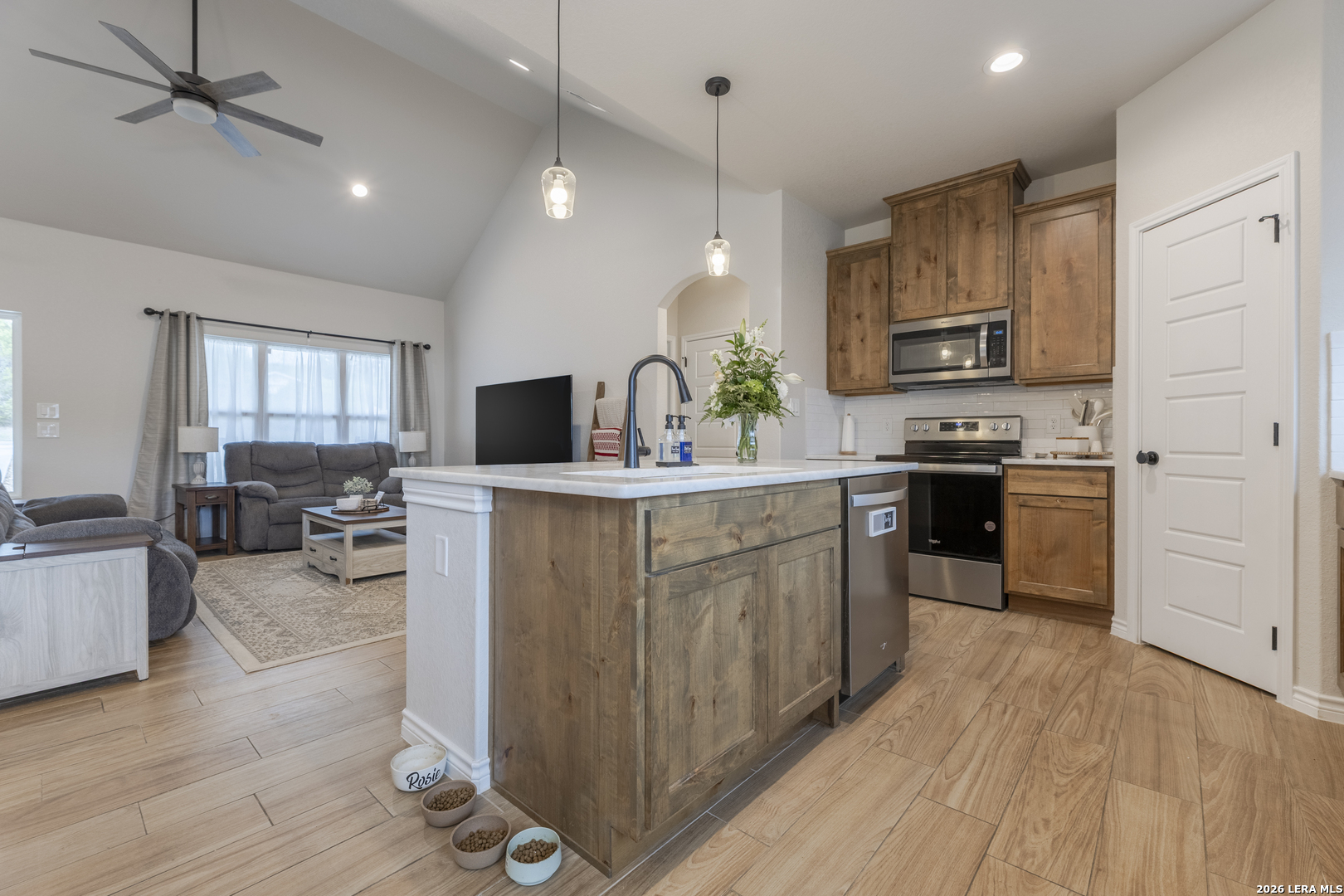 Step into this beautifully designed home featuring soaring 9+ ft ceilings and an abundance of natural light that fills every corner. The heart of the home is the spacious kitchen, complete with a generous pantry, stunning granite countertops, and premium appliances-all included-making it as functional as it is stylish. Built just two years ago, this home offers peace of mind with all major components-roof, HVAC, and more-being the same age and well maintained. You'll also appreciate the no-carpet design throughout, providing a clean, modern feel and easy upkeep. Start your mornings on the inviting front porch with a cup of coffee, and unwind in the evenings on the back porch as you take in breathtaking sunset views. The expansive driveway offers plenty of room for vehicles, boats, or weekend toys-perfect for an active lifestyle. A small outdoor storage shed adds extra space for tools and equipment. Located in a peaceful, well-kept community, you'll enjoy access to a neighborhood pool and scenic trails that lead directly to the lake-bringing nature right to your doorstep. While this home has never been used as a short-term rental, the option is available for added flexibility or investment potential.