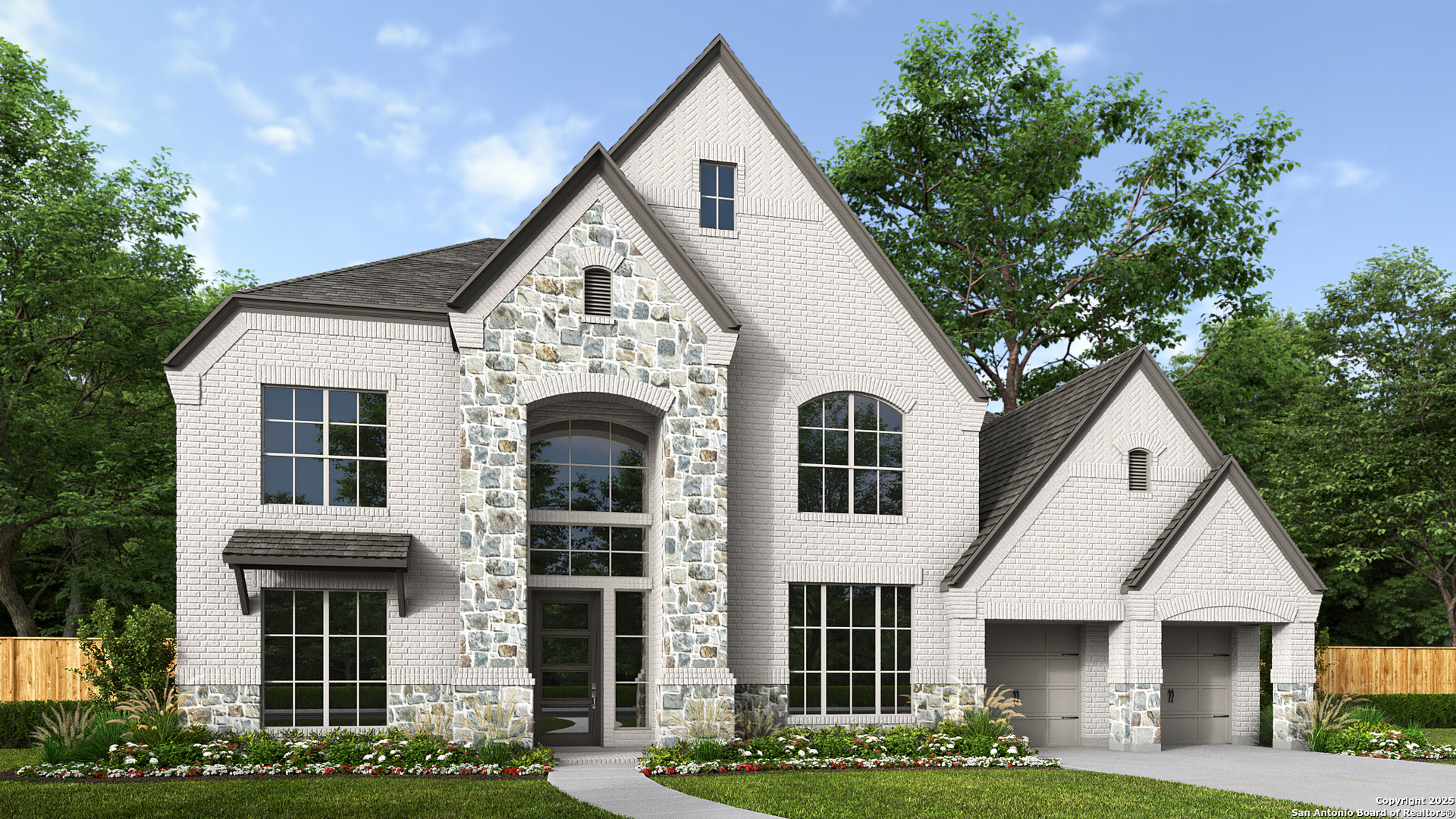 Home office with French doors and dining room frame the two-story entry. Two-story family room with wall of windows opens to kitchen and morning area. Kitchen features island with built-in seating space and Butler's pantry. Upstairs media room, game room, secondary bedrooms with a Hollywood bath. Downstairs guest suite with full bath and walk-in closet. Garden tub, separate shower and two walk-in closets in the primary suite. Additional staircase just off morning area. Covered backyard patio. Three-car garage.