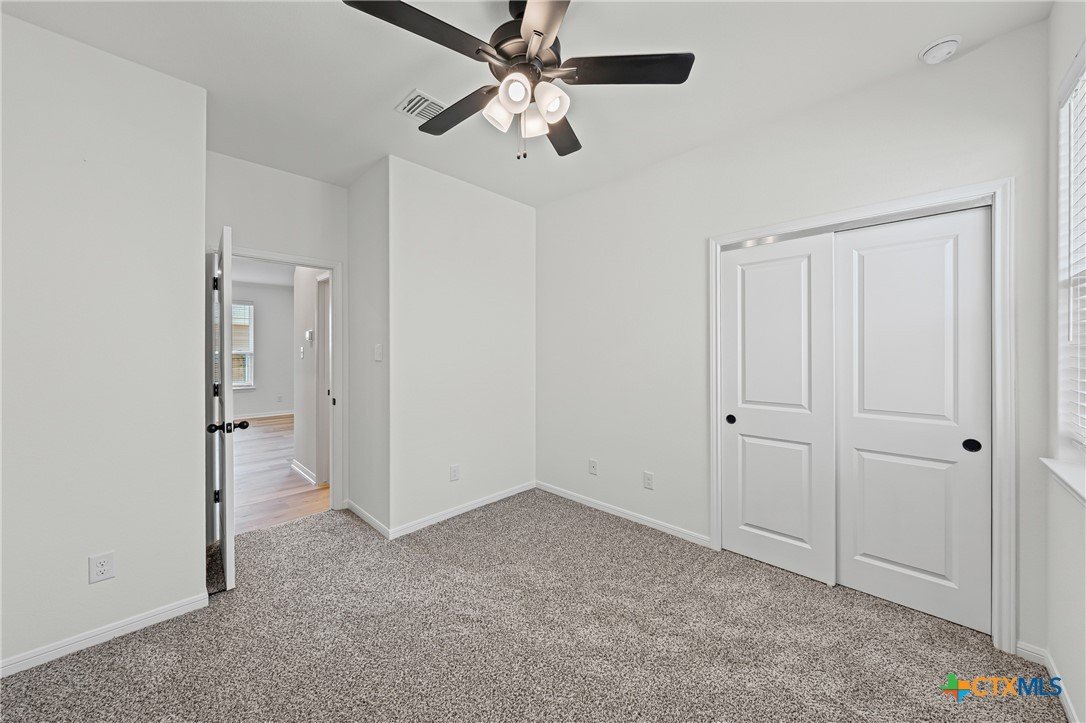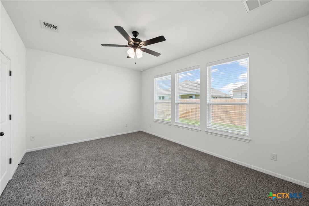 The Montgomery is our Hartrick Ranch Model Home's featured floor plan. This plan features a four-bed, two-bath layout across 1,700 square feet with an open-concept family room, dining area, and kitchen. The secondary bath includes two entries from the bedroom or the main living area. The kitchen includes stainless steel appliances with a large island that provides additional seating, counter space, and cabinet storage. The primary bath has dual vanity sinks, a private water closet, and a walk-in closet. Plan variations include a shower at the primary bath or a shower and tub combo, sliding pocket doors in the water closet, and a study in place of the fourth bedroom.
