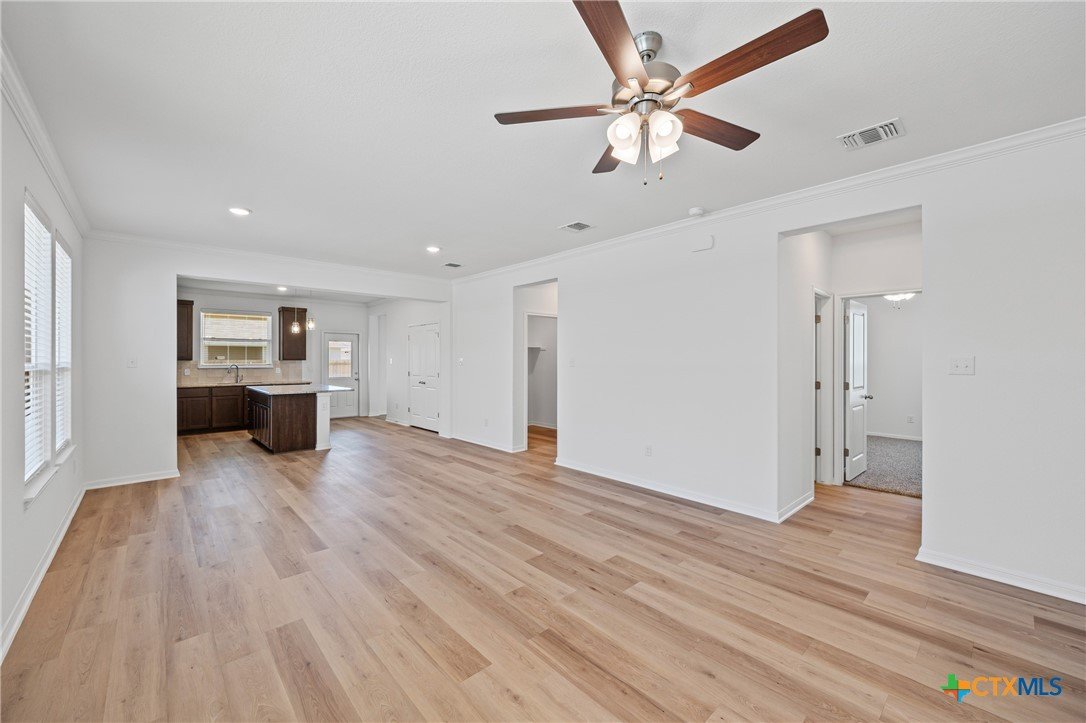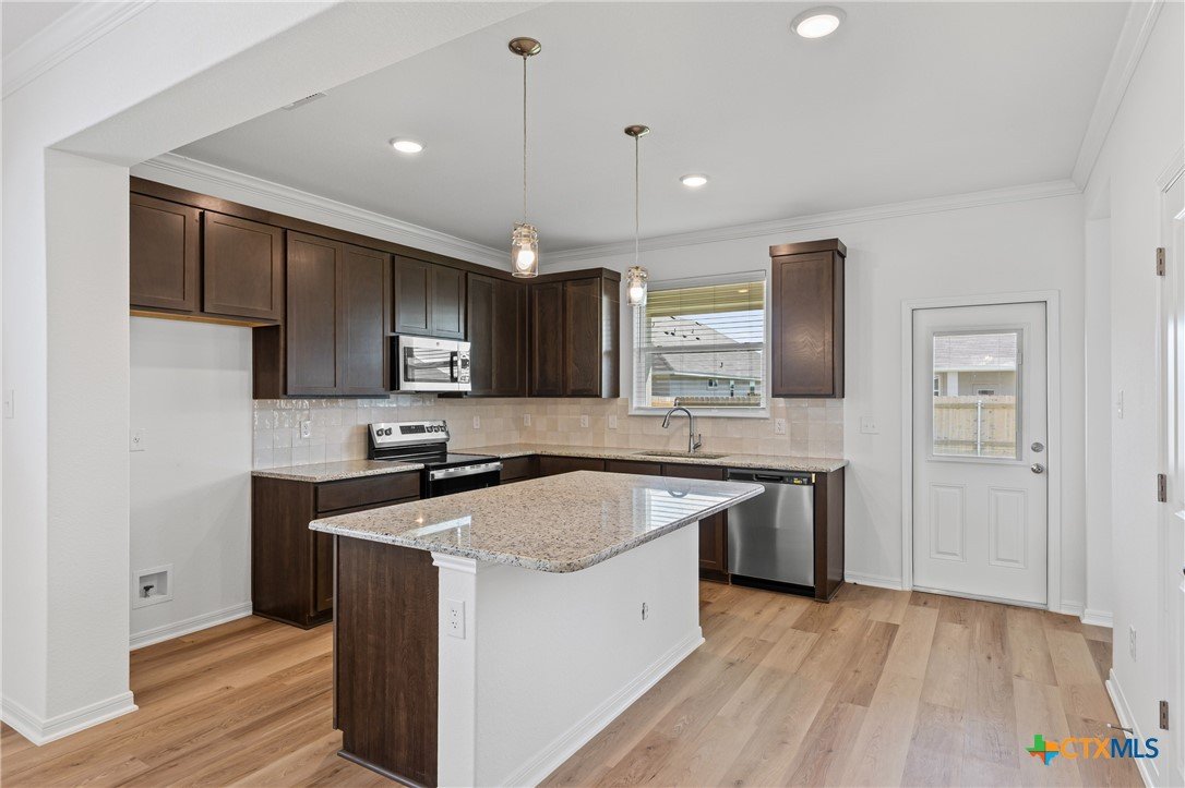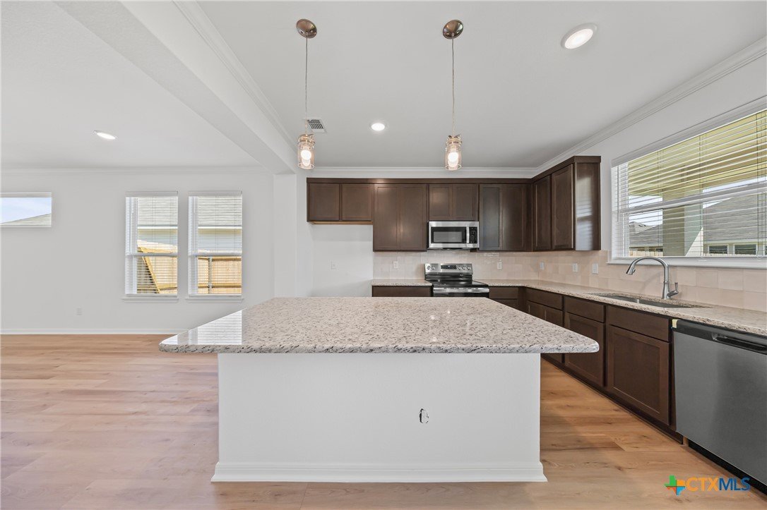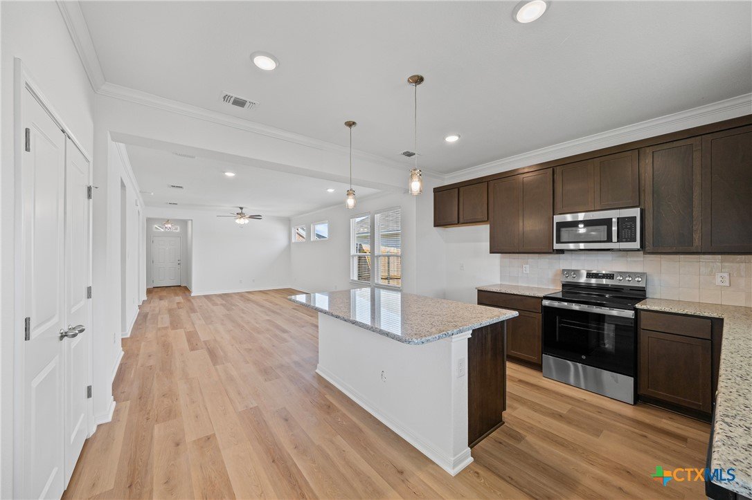 The Alamo floor plan offers a versatile and functional layout across 1,580 square feet. This three-bedroom, two-bath home comes with a study and is ideal for young professionals, families, or downsizers! This plan features an open-concept living area, breakfast, and kitchen with plenty of natural light to complement the space, making it perfect for entertaining. The kitchen includes stainless steel appliances with a large island that provides additional seating, storage, and cabinet space, while the primary bath has dual vanity sinks and a spacious closet. Plan variations include a fourth bedroom in place of the study.