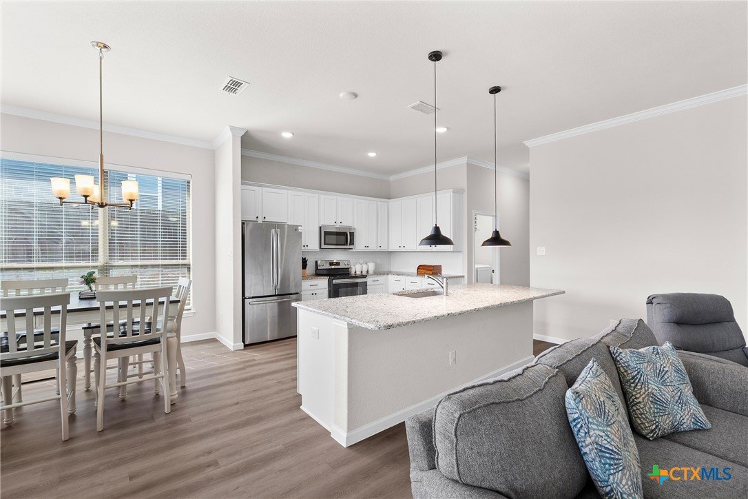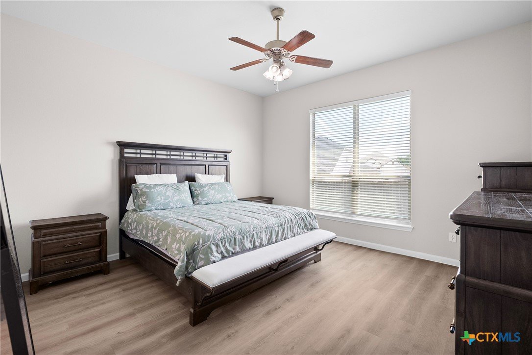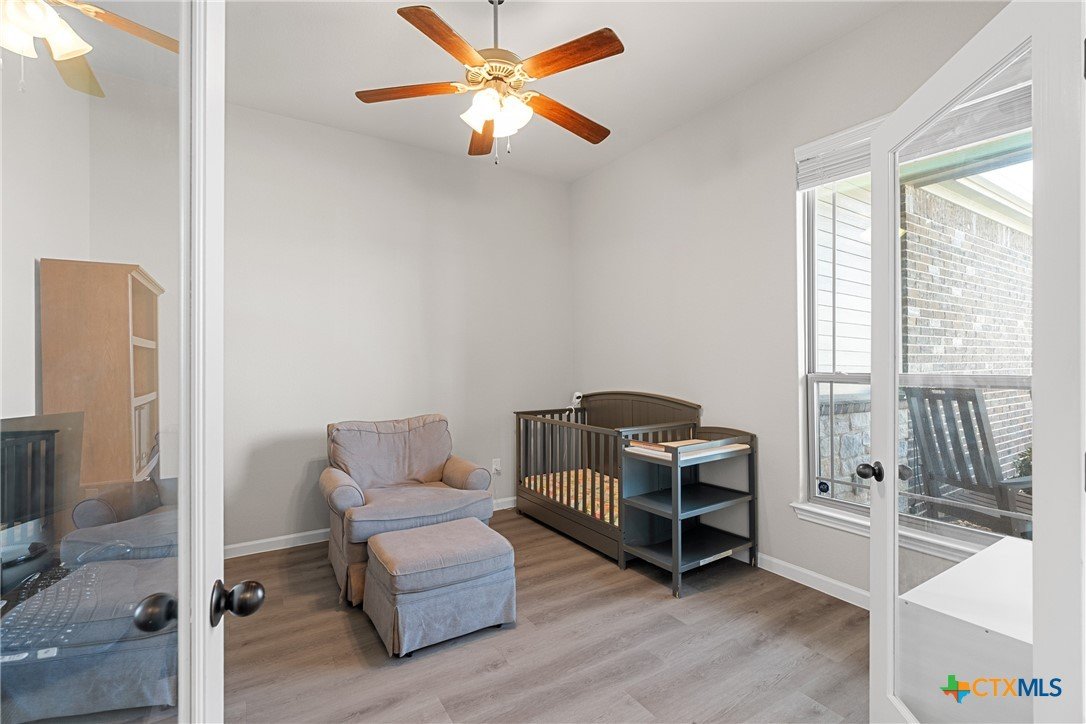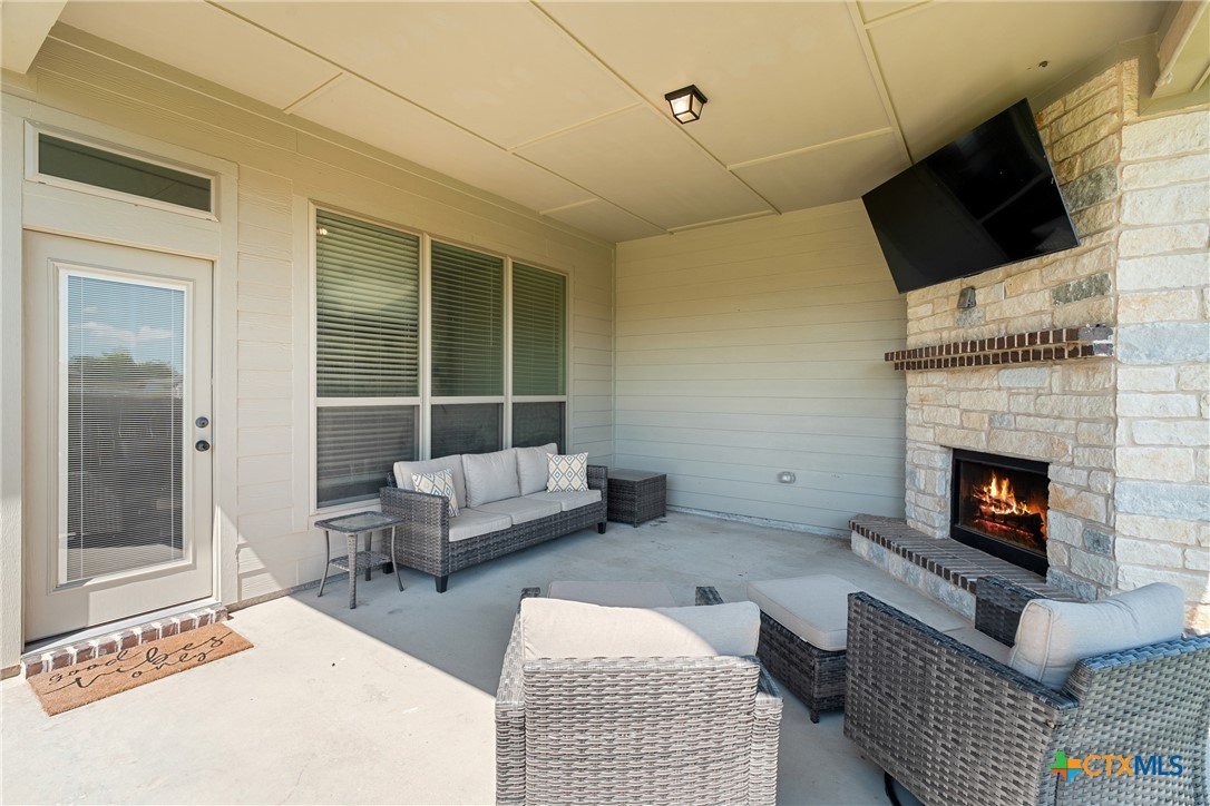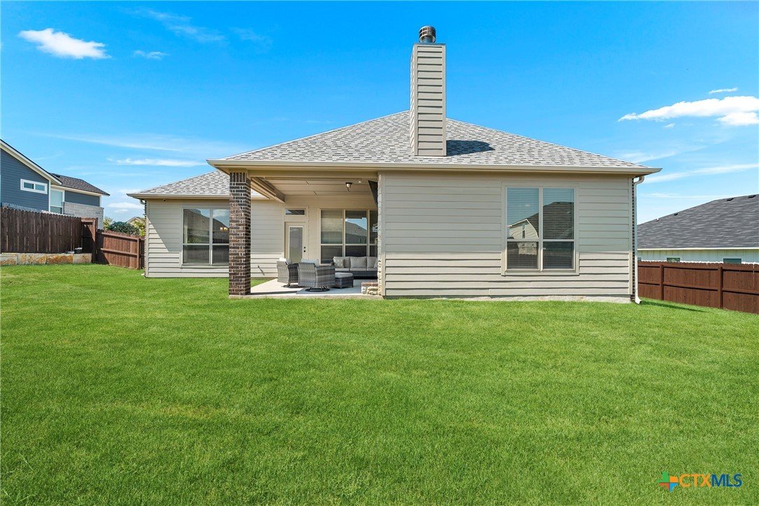 Nestled in the desirable Hills of Westwood neighborhood, this beautifully maintained contemporary home offers 3 bedrooms, 2 full baths, plus a dedicated study—spanning approximately 1,984 sq ft of thoughtfully designed living space. Built in 2019, the residence features an open split-floor plan, high ceilings, recessed lighting, and crown molding, creating an airy and modern ambiance. The stylish kitchen showcases granite countertops and seamlessly connects to the spacious family room, perfect for hosting or everyday family living. Throughout, durable vinyl and tile flooring offers both elegance and ease of maintenance, while the cozy outdoor fireplace and smart thermostat add comfort and energy efficiency. A functional laundry room and large closets enhance daily convenience. Step outside to enjoy the fenced backyard, where a covered patio and outdoor fireplace invite relaxing gatherings and barbecues—backed by no rear neighbors for added privacy. Included is a convenient 2-car attached garage and access to community amenities such as a pool, gated entry, and playground. With an HOA fee under $20/month, this home balances affordability with charm. Ideally located near West Adams, shopping, dining, and within a short drive to Scott & White, it embodies modern living in Temple.