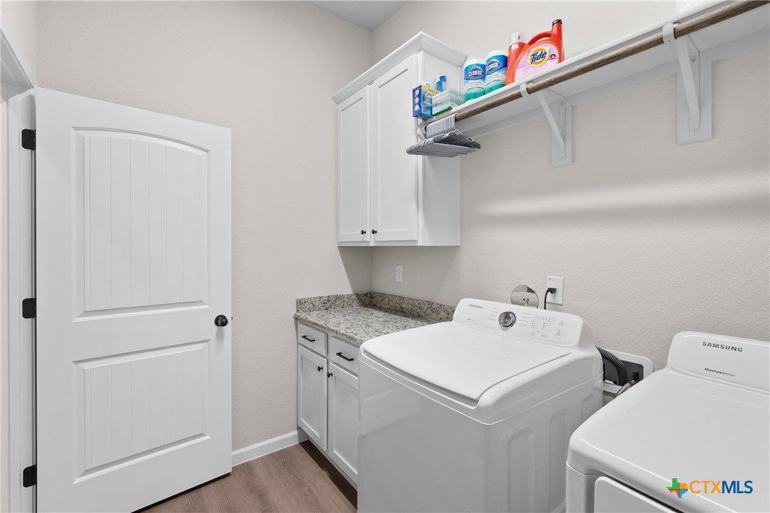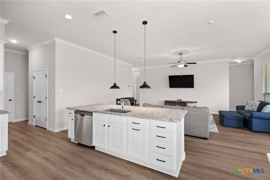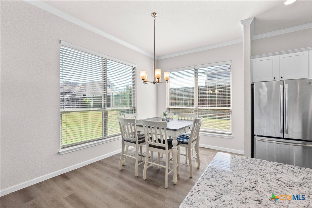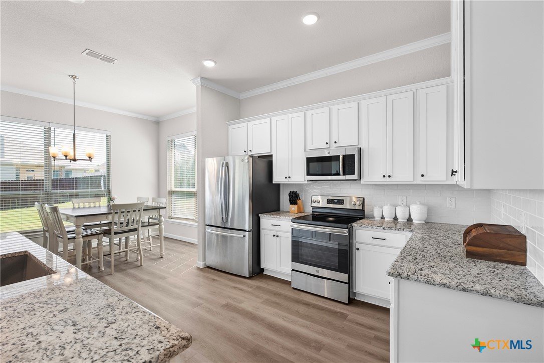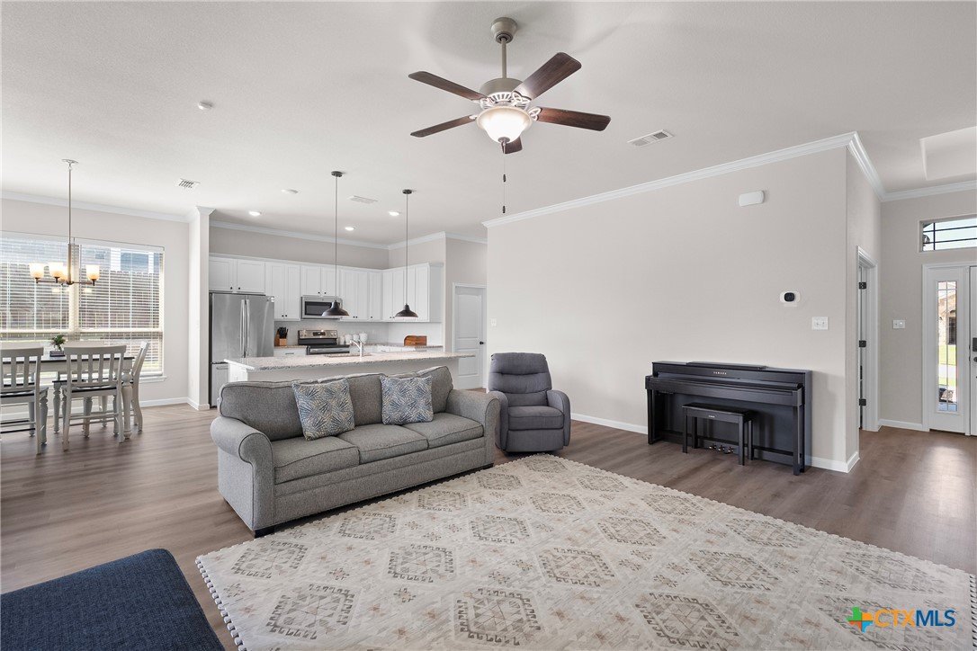 Nestled in the desirable Hills of Westwood neighborhood, this beautifully maintained contemporary home offers 3 bedrooms, 2 full baths, plus a dedicated study—spanning approximately 1,984 sq ft of thoughtfully designed living space. Built in 2019, the residence features an open split-floor plan, high ceilings, recessed lighting, and crown molding, creating an airy and modern ambiance. The stylish kitchen showcases granite countertops and seamlessly connects to the spacious family room, perfect for hosting or everyday family living. Throughout, durable vinyl and tile flooring offers both elegance and ease of maintenance, while the cozy outdoor fireplace and smart thermostat add comfort and energy efficiency. A functional laundry room and large closets enhance daily convenience. Step outside to enjoy the fenced backyard, where a covered patio and outdoor fireplace invite relaxing gatherings and barbecues—backed by no rear neighbors for added privacy. Included is a convenient 2-car attached garage and access to community amenities such as a pool, gated entry, and playground. With an HOA fee under $20/month, this home balances affordability with charm. Ideally located near West Adams, shopping, dining, and within a short drive to Scott & White, it embodies modern living in Temple.