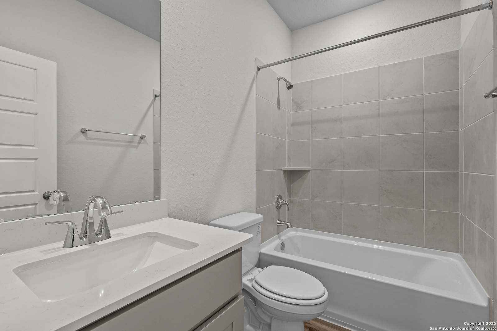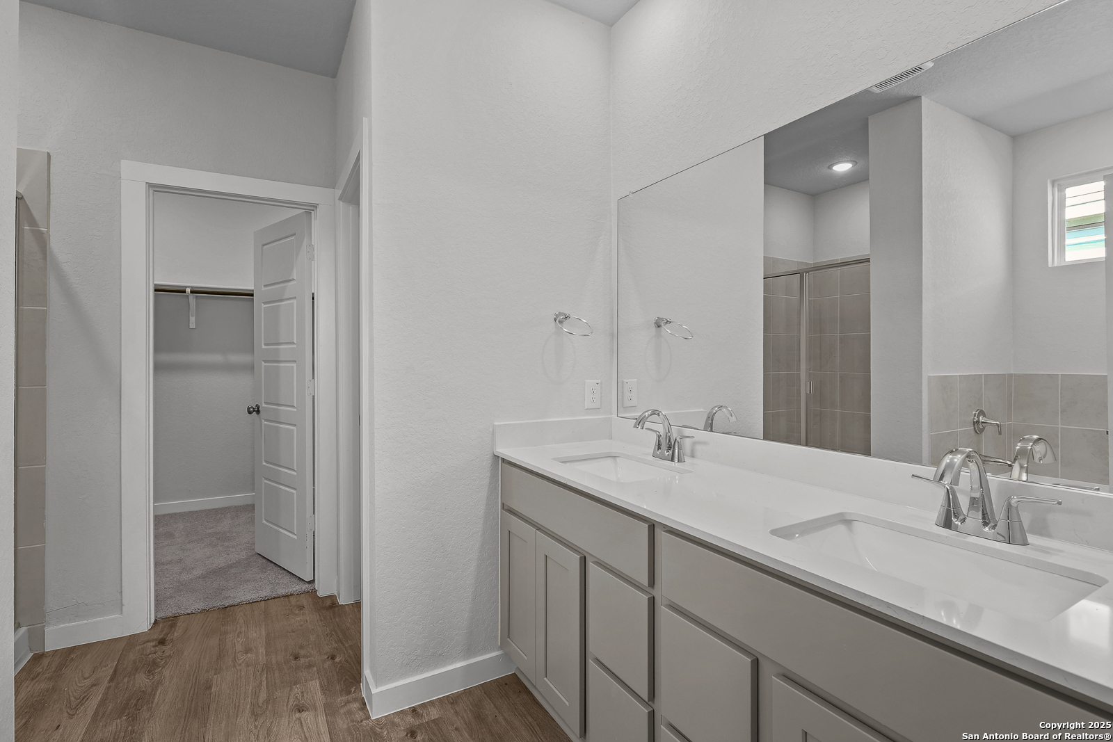 The Blanco at Cinco Lakes offers a seamless one-story layout, designed for comfort and convenience. Mingling comes easy in the open-concept great room, which integrates a dining area, living space, and a kitchen complete with an island and corner pantry. The room effortlessly extends to a covered patio for indoor-outdoor living. Two bedrooms, located at the front of the house, share a full bathroom, while the primary suite enjoys a private location towards the back of the home. The primary en-suite bathroom features a dual-sink vanity, dedicated linen closet, and spacious walk-in closet, creating a peaceful retreat. A full laundry room and large 2-bay garage complete this convenient, yet comfortable home. Additional home highlights and upgrades: Corner Lot White kitchen cabinets, quartz countertops and backsplash 4" baseboards throughout home Luxury "wood-look" vinyl plank flooring in common areas Stainless-steel appliances Soft water loop upgrade Primary garden tub and shower Quartz countertops and modern rectangular sinks in bathrooms Landscape package with fully sodded yard and irrigation system Keyless entry Exceptional included features, such as our Century Home Connect smart home package and more!
