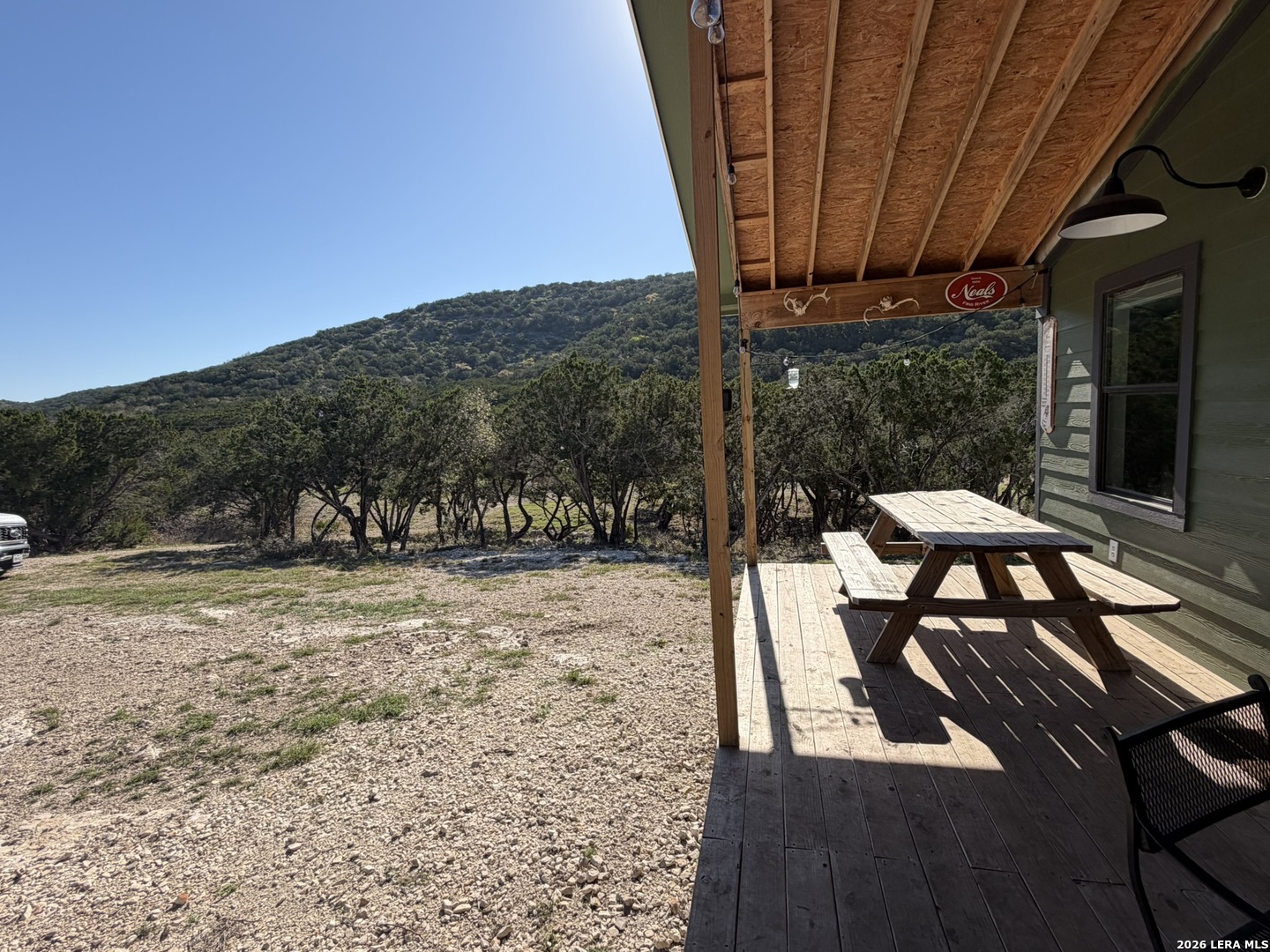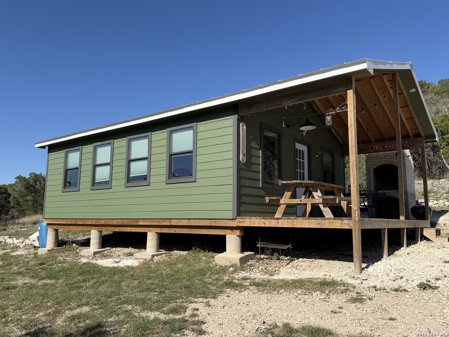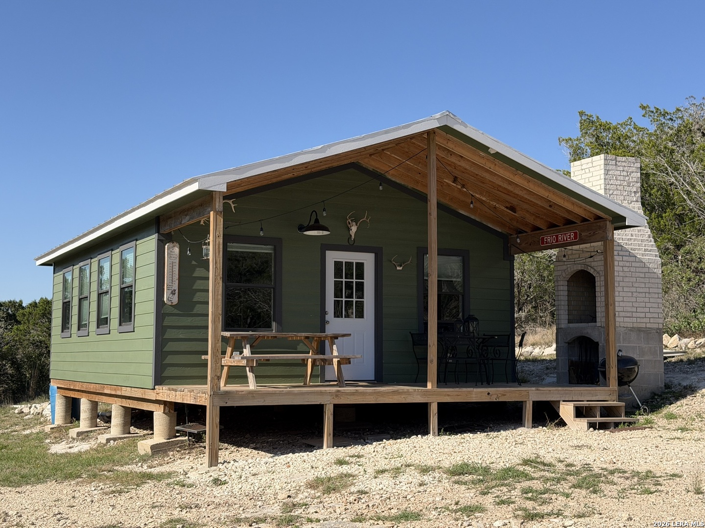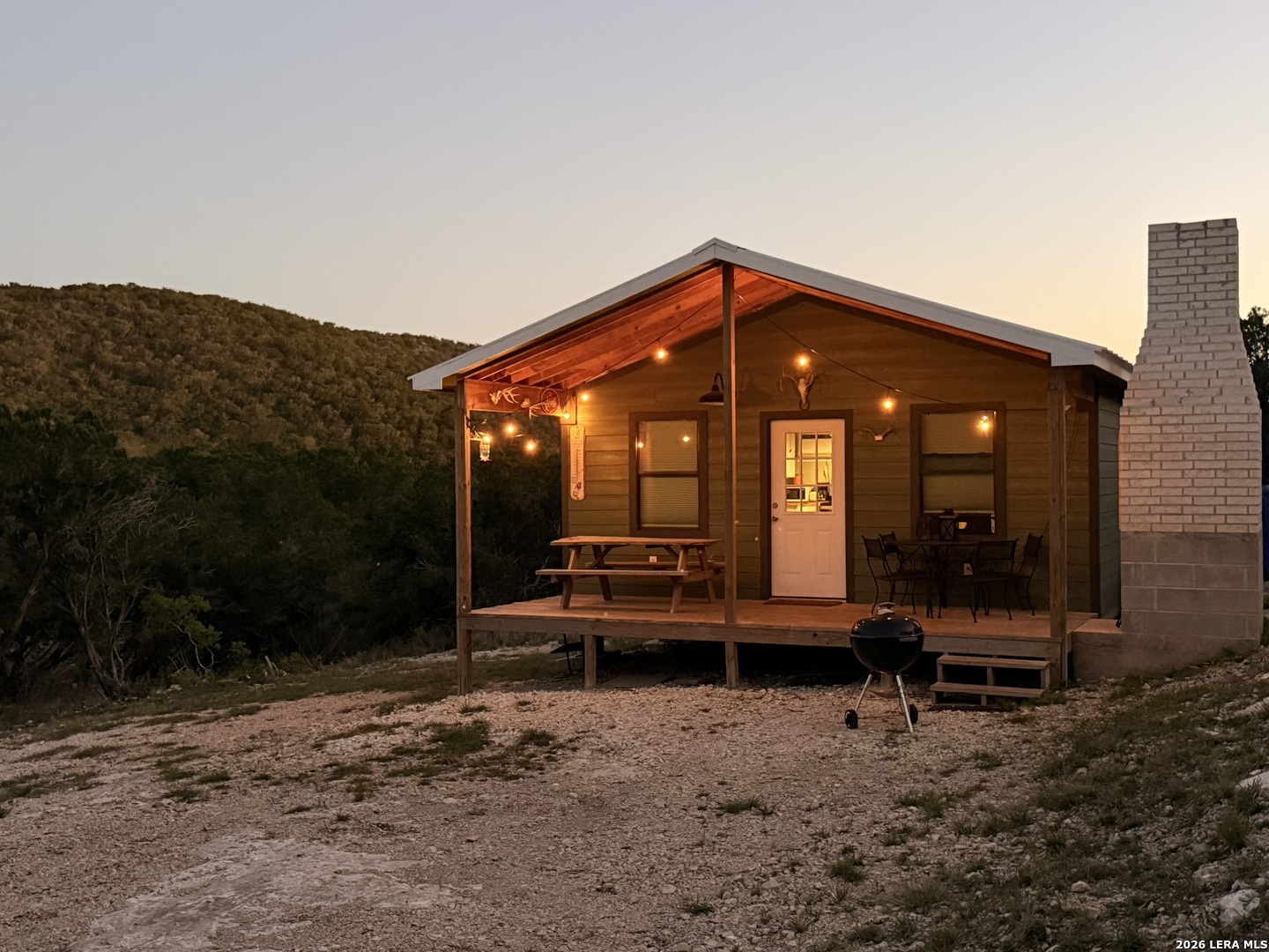 Discover your own secluded retreat on 5 acres just minutes from Concan and the cool clear waters of the Frio River! Built in 2023, this charming 1-bedroom, 1-bathroom cabin blends comfort and functionality. The modern kitchen comes fully equipped with a stove, sink, refrigerator, and ample cabinetry. Step onto the covered deck with its inviting rock fireplace-perfect for unwinding and soaking in breathtaking Hill Country views and peaceful Texas evenings. Enjoy hiking to the hilltop for incredible 360 panoramas. The property includes a spacious 20x20 metal shop, ideal for storing ATVs or river gear, plus an outdoor shower for cooling off on hot summer days. Appliances and select furnishings are included, along with a riding lawn mower and a Kawasaki mule. Electricity in place. Water is provided by a portable storage tank. 4x4 recommended during wet weather. Topography is sloping in the front, nicely terraced hillside where the cabin is situated, then sloping behind the cabin and up the hill. This is the ultimate getaway for outdoor lovers seeking stylish camping and adventure!