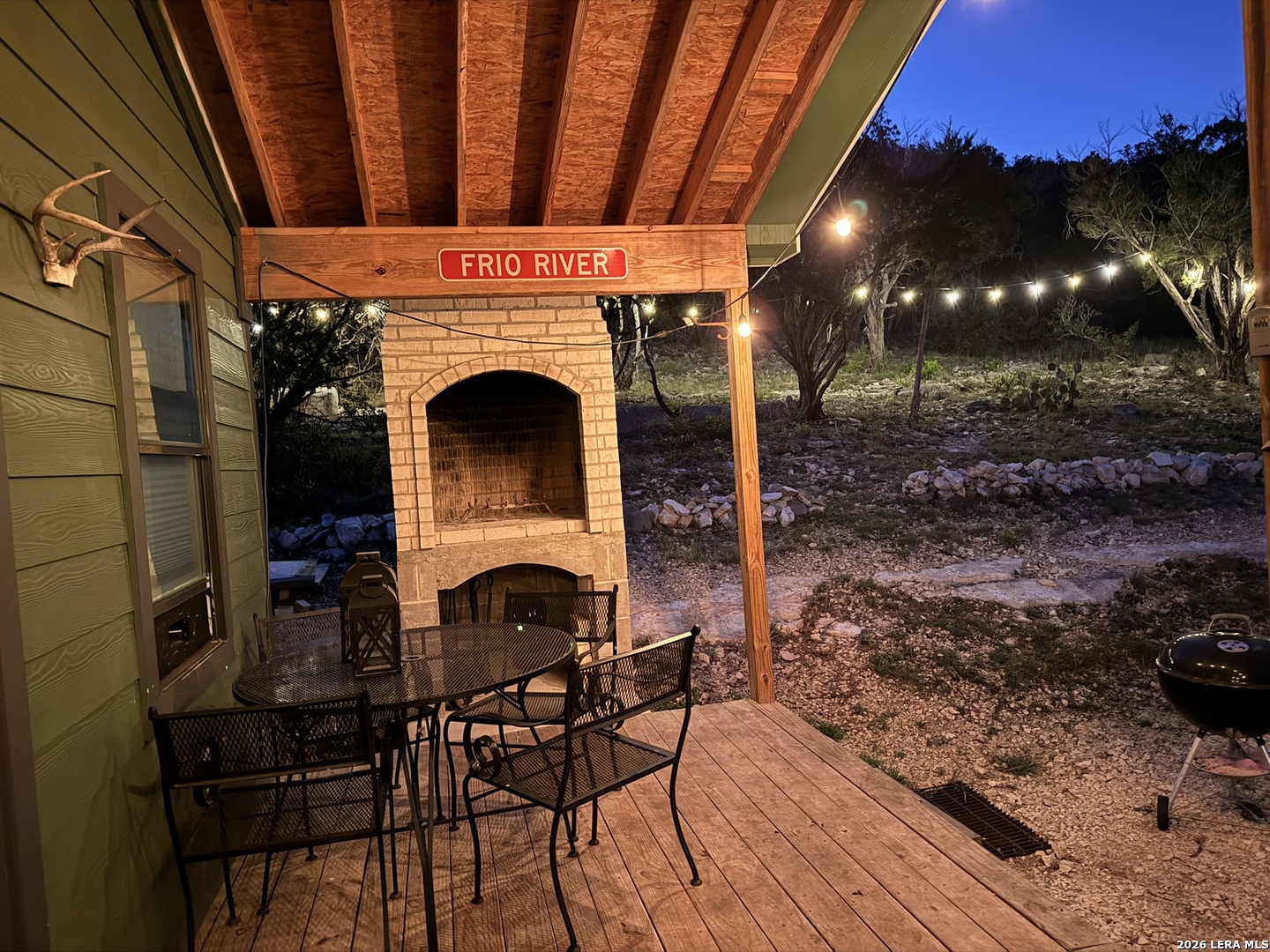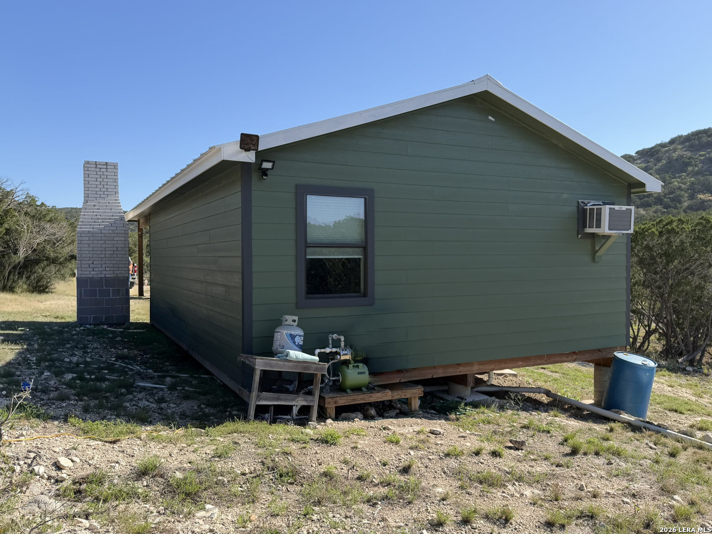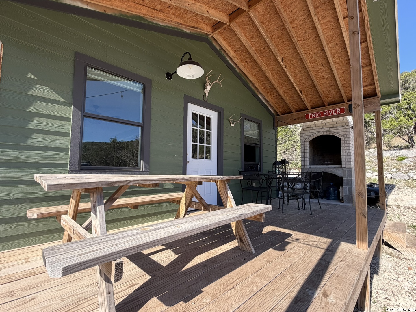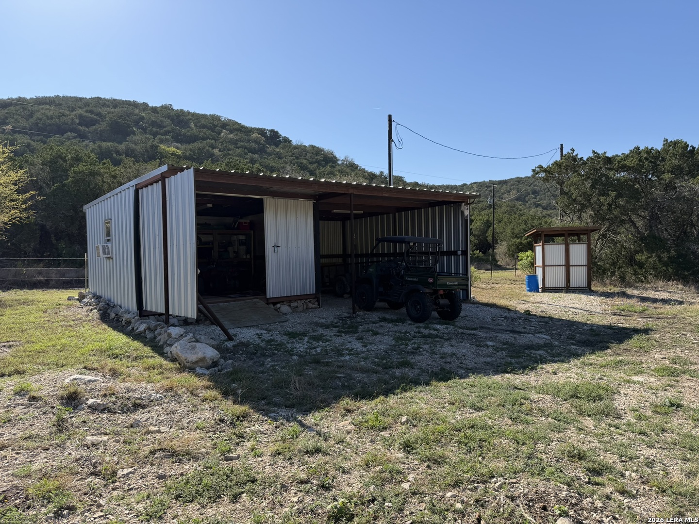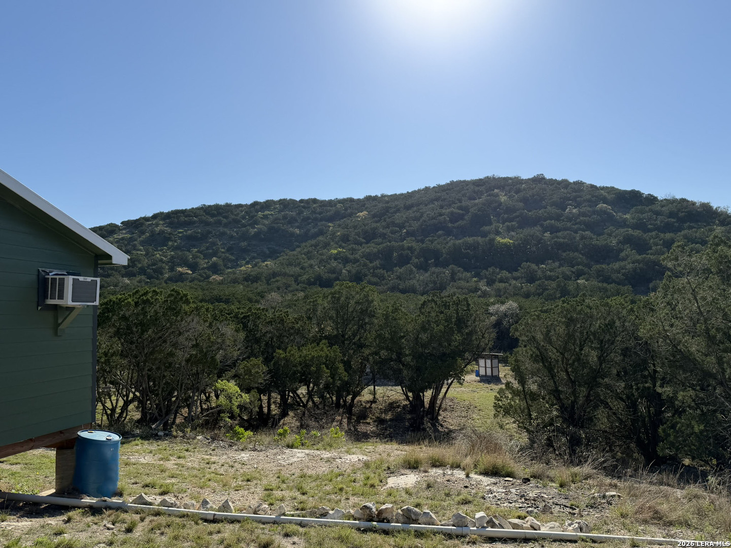 Discover your own secluded retreat on 5 acres just minutes from Concan and the cool clear waters of the Frio River! Built in 2023, this charming 1-bedroom, 1-bathroom cabin blends comfort and functionality. The modern kitchen comes fully equipped with a stove, sink, refrigerator, and ample cabinetry. Step onto the covered deck with its inviting rock fireplace-perfect for unwinding and soaking in breathtaking Hill Country views and peaceful Texas evenings. Enjoy hiking to the hilltop for incredible 360 panoramas. The property includes a spacious 20x20 metal shop, ideal for storing ATVs or river gear, plus an outdoor shower for cooling off on hot summer days. Appliances and select furnishings are included, along with a riding lawn mower and a Kawasaki mule. Electricity in place. Water is provided by a portable storage tank. 4x4 recommended during wet weather. Topography is sloping in the front, nicely terraced hillside where the cabin is situated, then sloping behind the cabin and up the hill. This is the ultimate getaway for outdoor lovers seeking stylish camping and adventure!