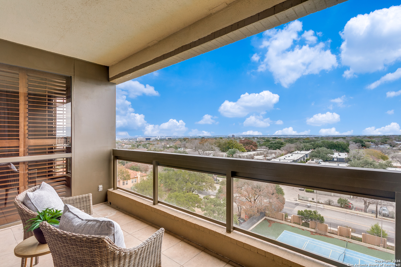 Enjoy beautiful, unobstructed views towards downtown and to the east from this luxurious high-rise condominium. The rich, wood flooring and wood paneling details provide a warm backdrop for this home. The spacious living room has access to a covered balcony and is open to the formal dining area. A charming study nook features a built-in desk, storage and bookcases for a handsome addition to the living area. The eat-in kitchen has ample storage, stainless appliances and the breakfast area has access to a second balcony. The primary suite has an suite bathroom with walk-in shower and double vanity plus a generous walk-in closet with storage solutions. Second bedroom and full bath. Louvered shutters, in-unit laundry room, and 2 parking spaces in garage are more amenities to enjoy in this condo. Building features tennis court, pool, spa, work-out room and more!