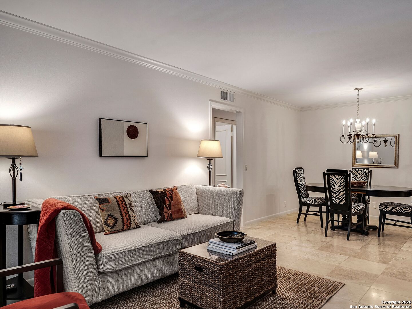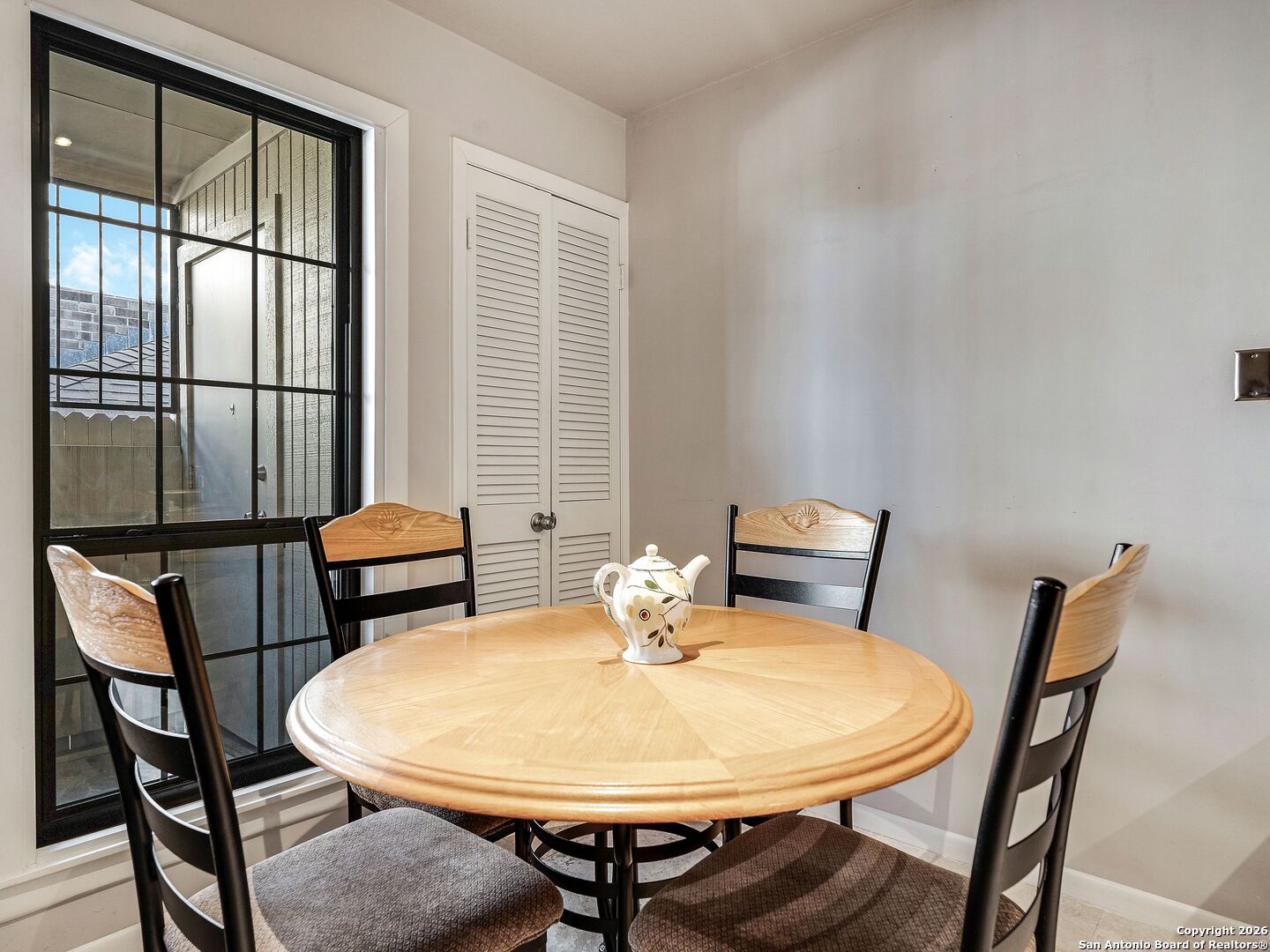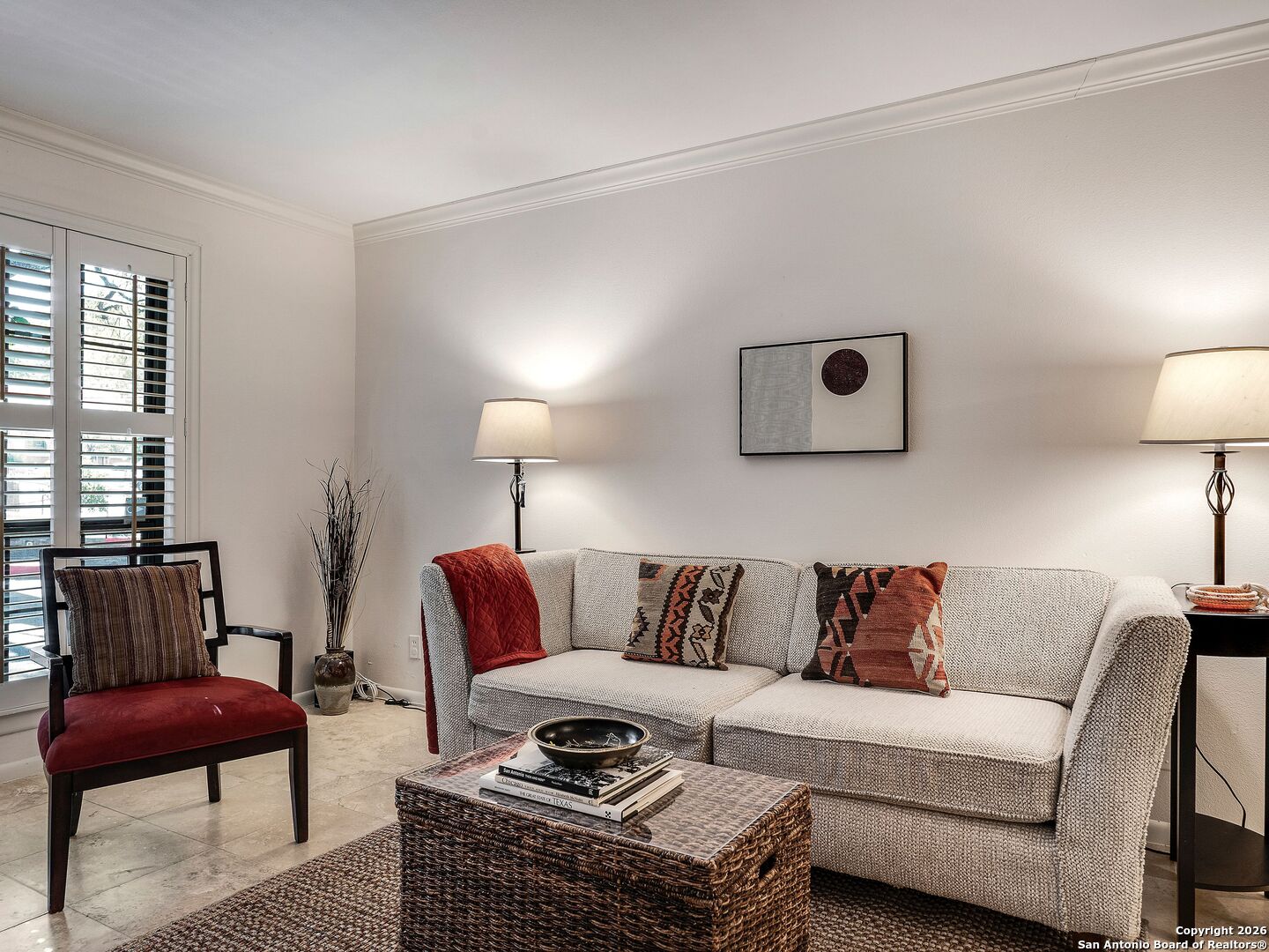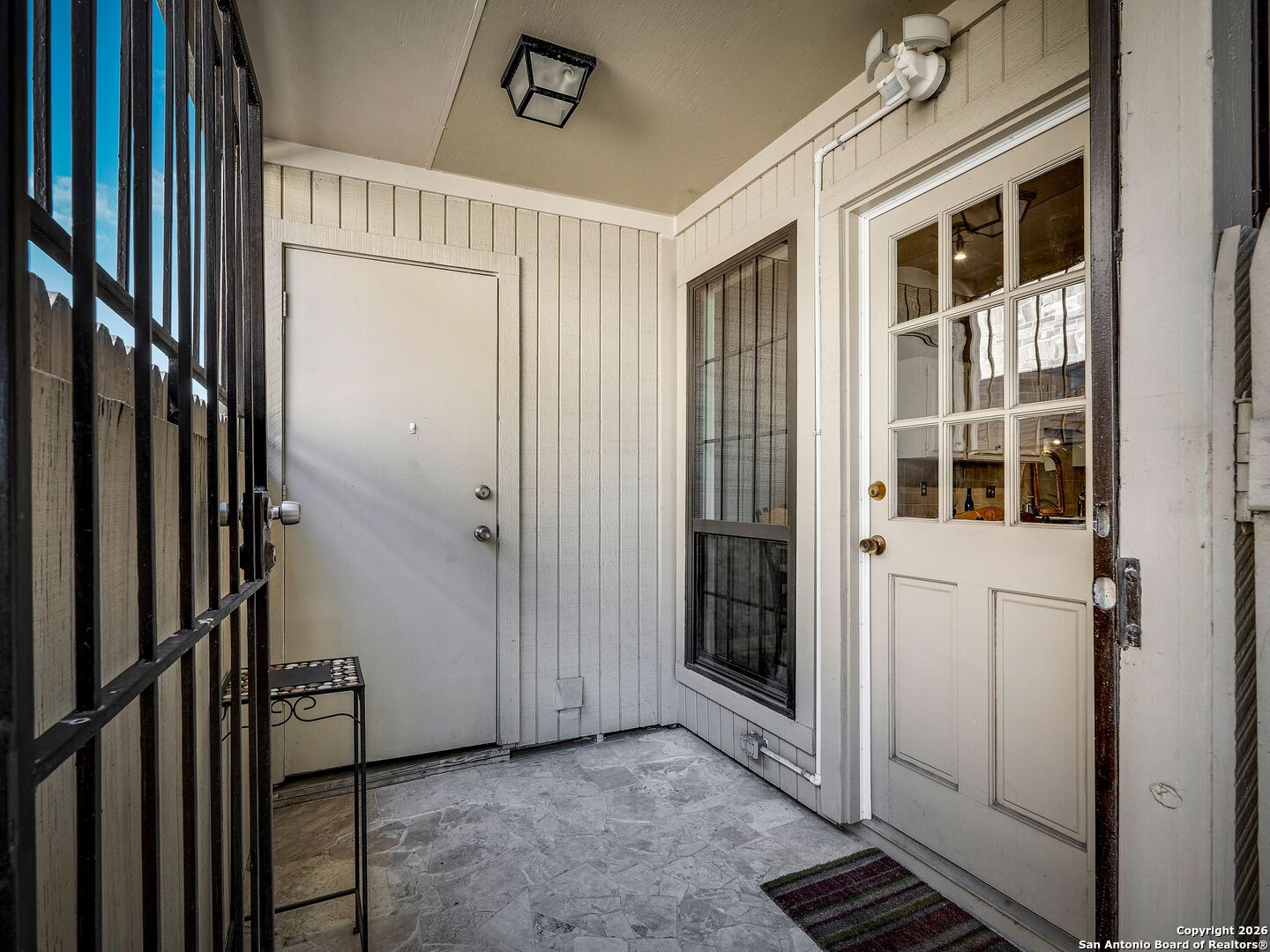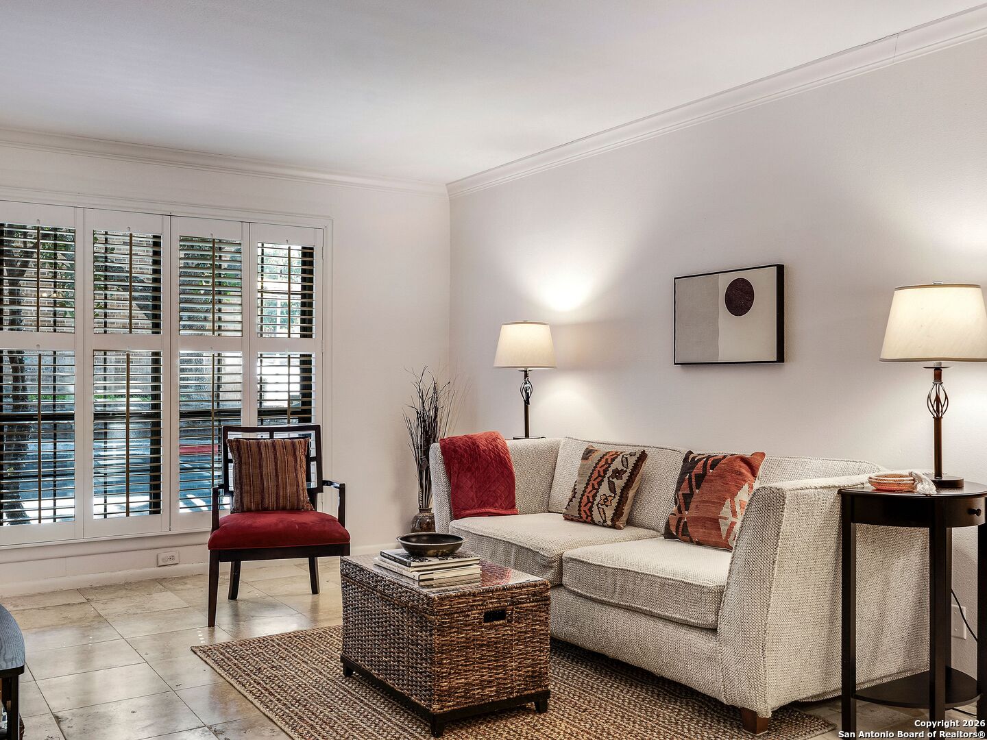 Nestled in the heart of Alamo Heights, this beautifully updated 2-bedroom, 2-bath single-story condo at Windsor Court offers both comfort and convenience. Positioned on the ground floor and as an end unit, it enjoys an abundance of natural light throughout. Step inside to find travertine tile floors flowing seamlessly through an open living area, framed by nearly floor-to-ceiling French windows that create a bright and inviting atmosphere. The updated kitchen features granite countertops, stainless steel appliances, two pantries, a travertine backsplash, and a charming breakfast nook-perfect for morning coffee or casual dining. The spacious primary suite includes two closets and an updated bath with a stone countertop, modern cabinetry, and a tub/shower combo. Off the dining room offers a flexible closet that includes a clever hideaway office, ideal for working from home. Enjoy a cozy enclosed porch, recently replaced windows, and the peace of mind that comes with a move-in ready home. Windsor Court's prime Alamo Heights location places you minutes from restaurants, coffee shops, shopping, the airport, Museum Reach, the Zoo, the Botanical Gardens, and The Pearl.