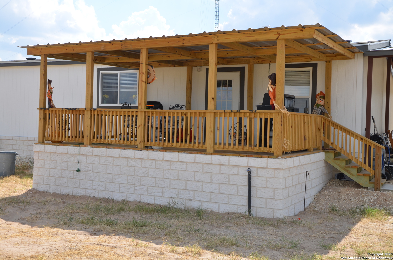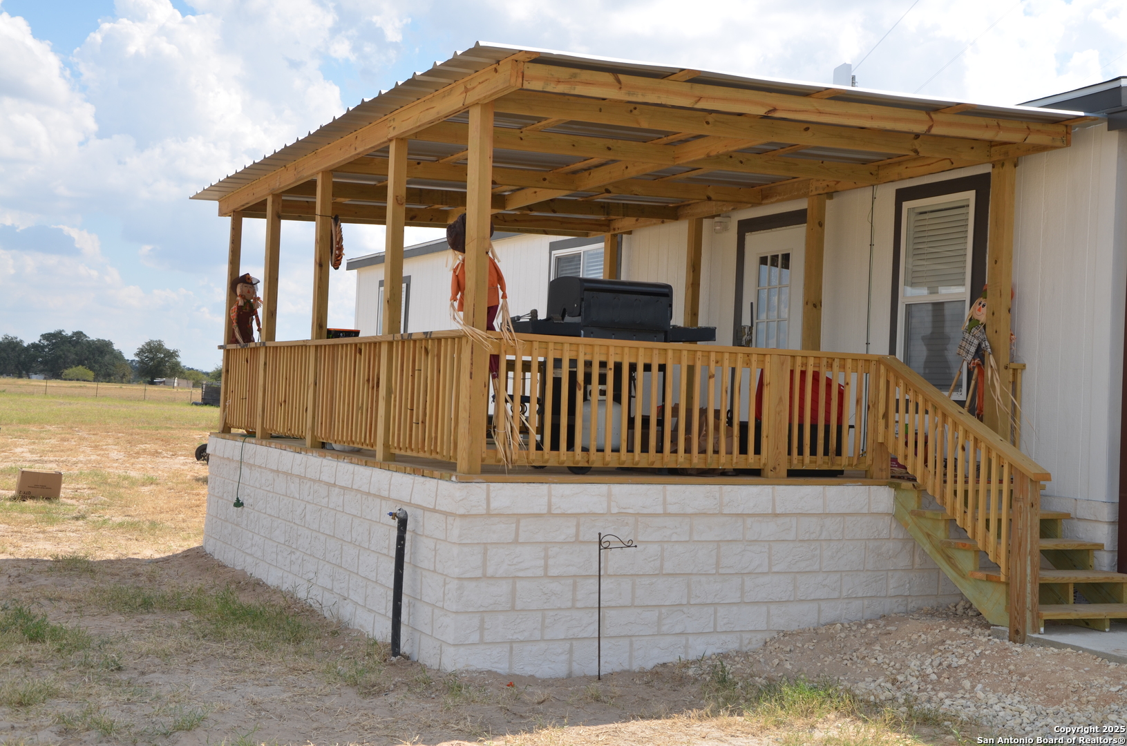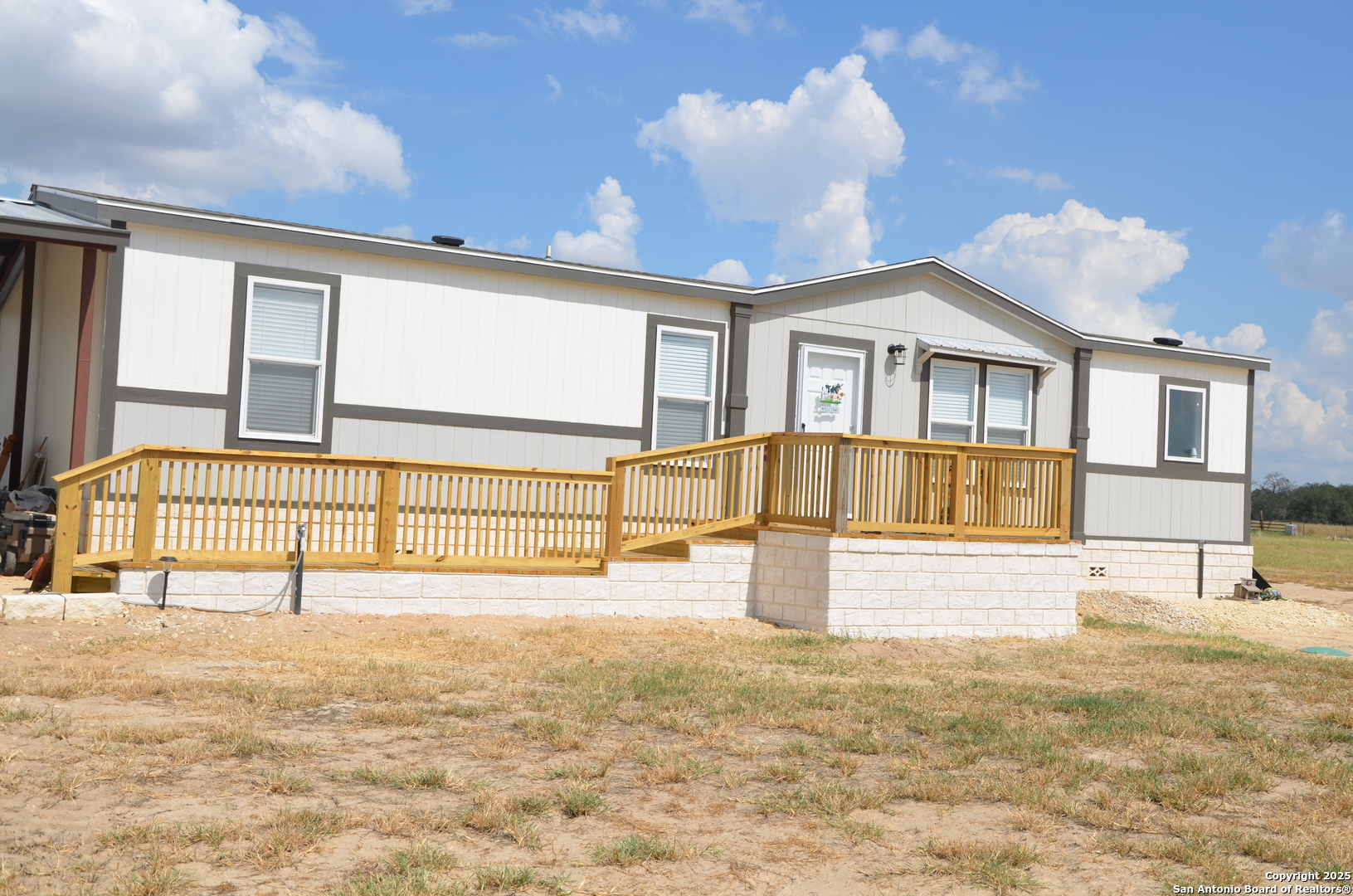 New Manufactured Home - offers over 1300 sq. feet - open floor plan - chef's kitchen with oversized island - perfect for entertaining - home has been retro-filled for a loan - sits on 11.683 acres - new survey - under current ag exemption for cattle grazing - new front and back decks just completed! - perfect for watching sunrise and sunsets - new two car carport - property is located close to IH 35 for commuting to San Antonio.