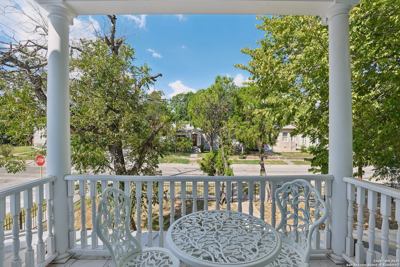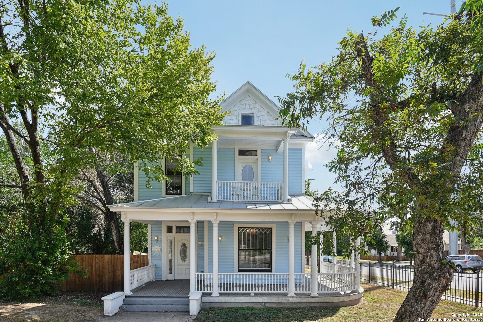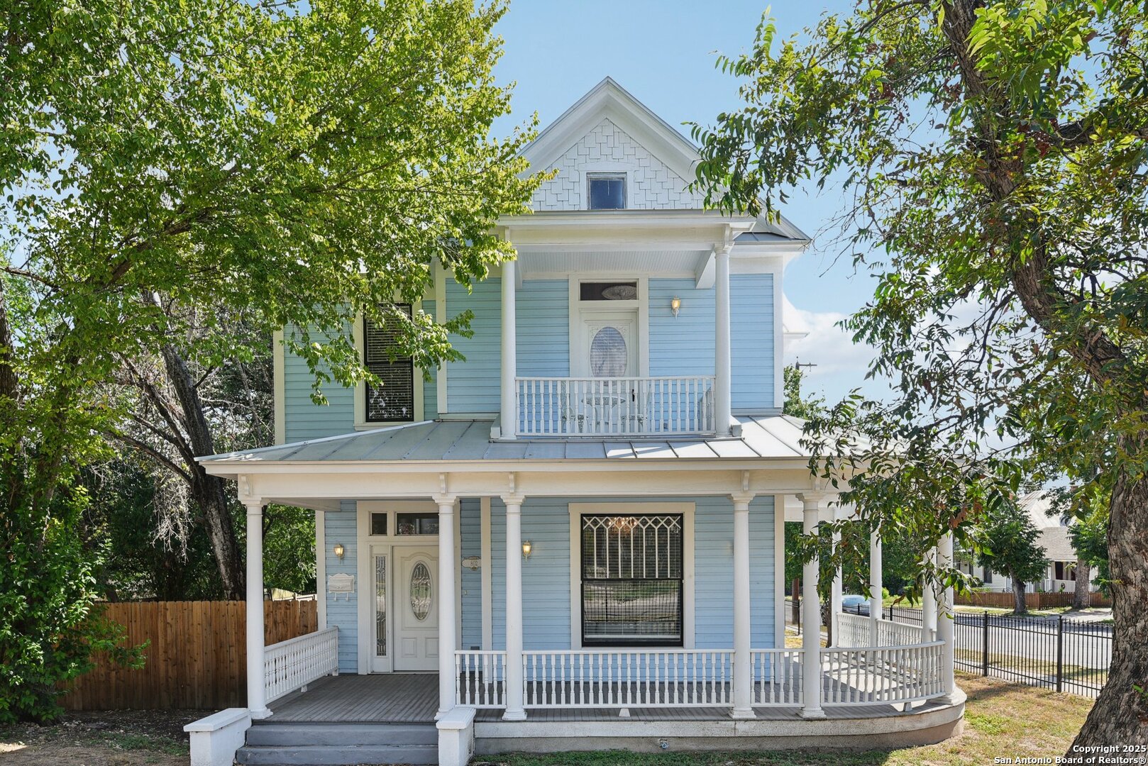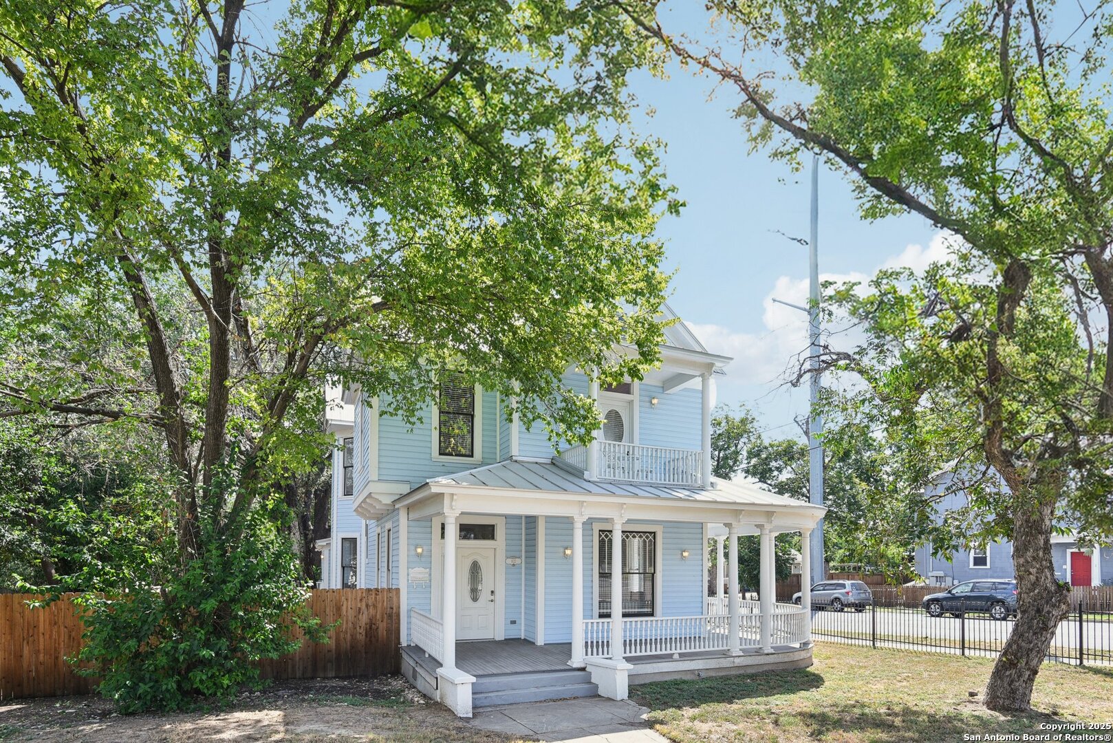 Built in 1894, this beautifully renovated Georgian-Inspired Victorian home in the Dignowity Hill Historic District blends original character with modern updates. A wrap-around porch stretches across the front of the home, inviting you to relax and enjoy the spacious fenced in yard on this large corner lot. Upon entering, you are welcomed by an elegant receiving room accented with a chandelier, custom-coffered ceilings; a classic design complemented by bespoke wallpaper and large windows that flood the room with natural light. With high ceilings accented by wood paneling, hardwood Pine flooring, this home features preserved historic charm while offering the comfort and functionality of contemporary living. The kitchen has quartz countertops, a ceramic farmhouse sink beneath a window overlooking the yard, new cabinetry throughout, stainless steel appliances and a breakfast bar. The downstairs primary suite has a beautifully updated bathroom with distinctive tilework, a double vanity and a spacious walk-in shower. All secondary bedrooms are upstairs, with one including its own 2nd story walk out balcony. The backyard is xeriscaped for low-maintenance living and fully enclosed by an iron fence, with on-premises parking . A newer metal roof adds to the longevity and value of this home. The second partially-finished out back house offers possibilities for a flexible space for guests or income potential through a long-term rental or Airbnb. This home is truly a gem in the heart of the historic East Side, only minutes away from downtown San Antonio, the Pearl Brewery, Blue Star Brewery, the Riverwalk, the Alamodome and with an easy commute to Fort Sam Houston. All furniture is negotiable with the sale.