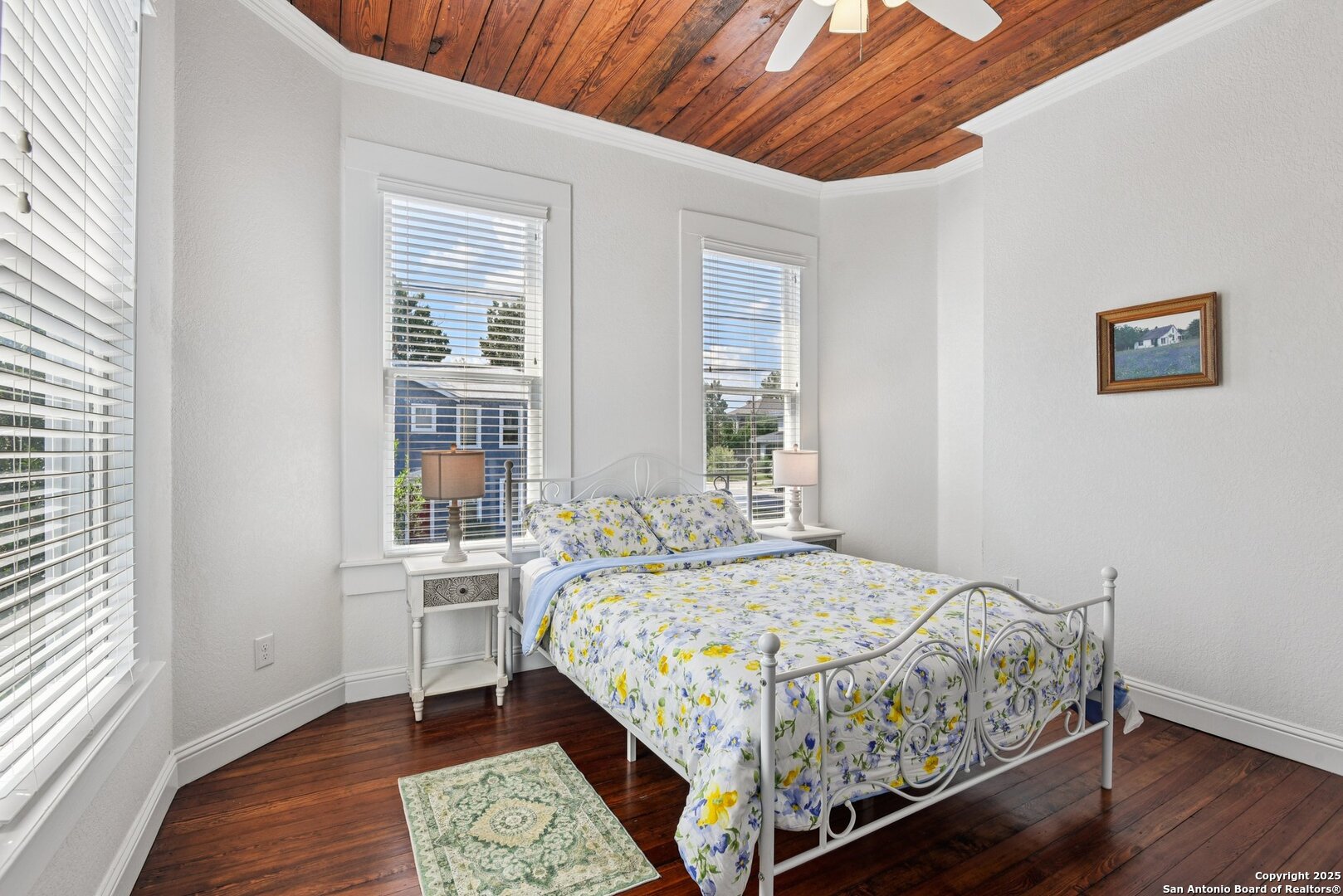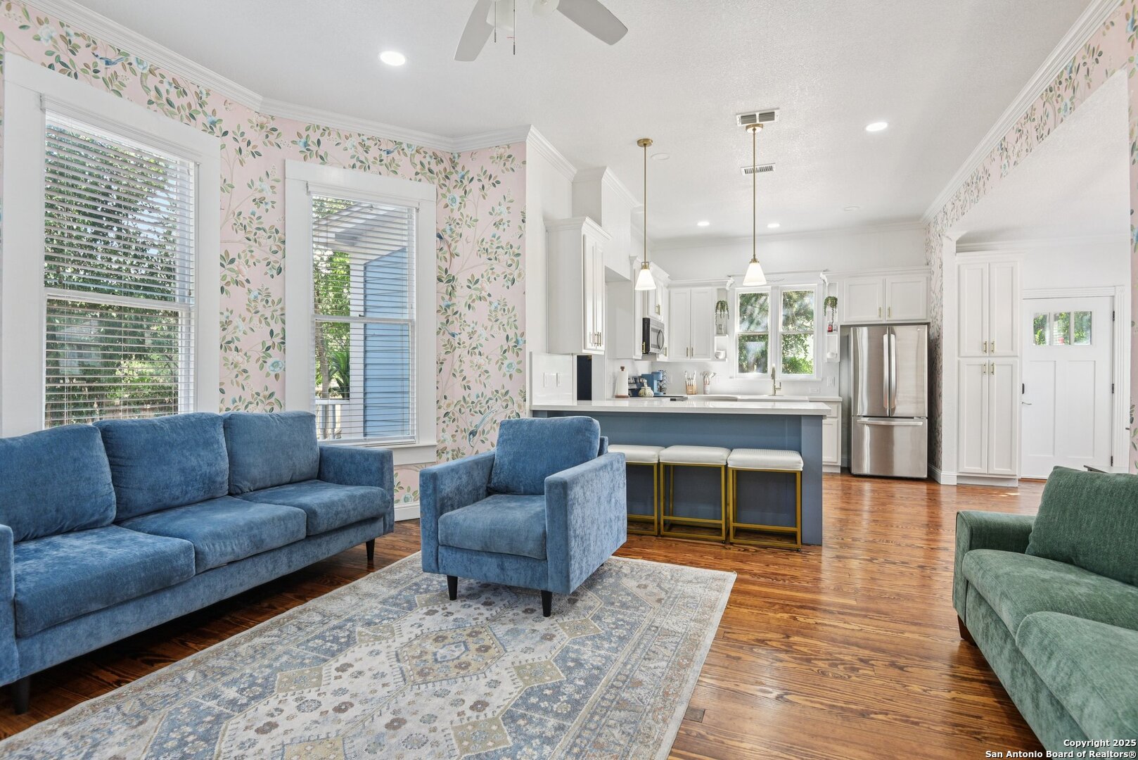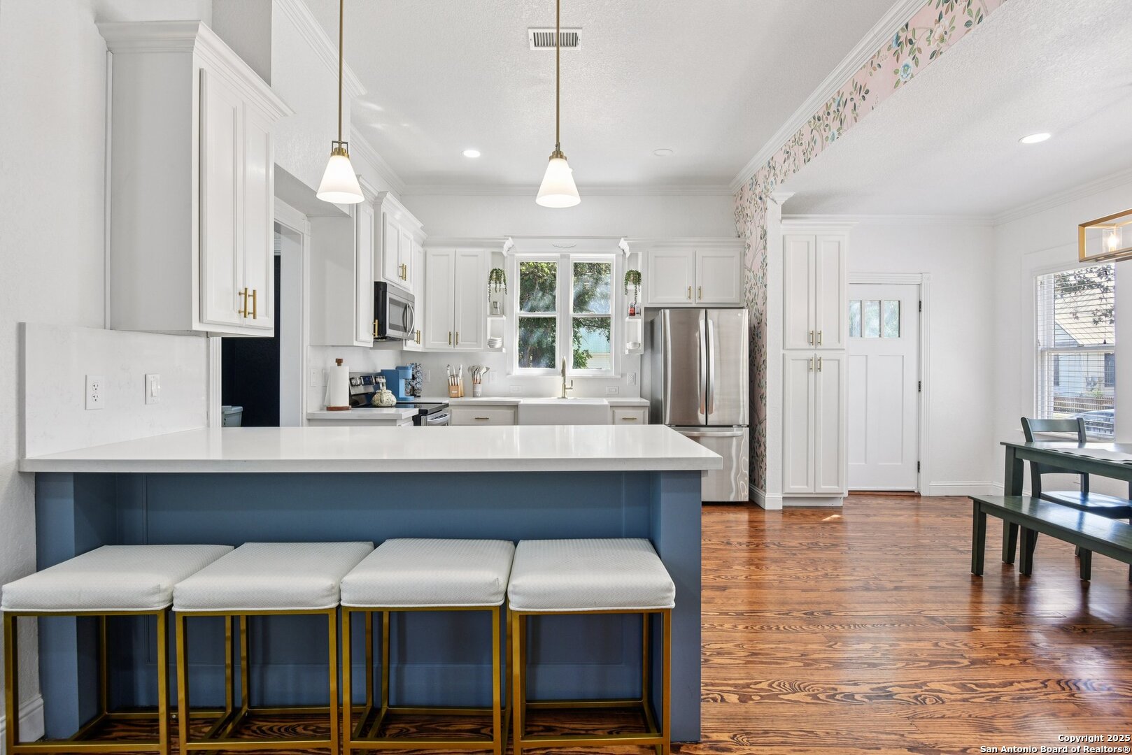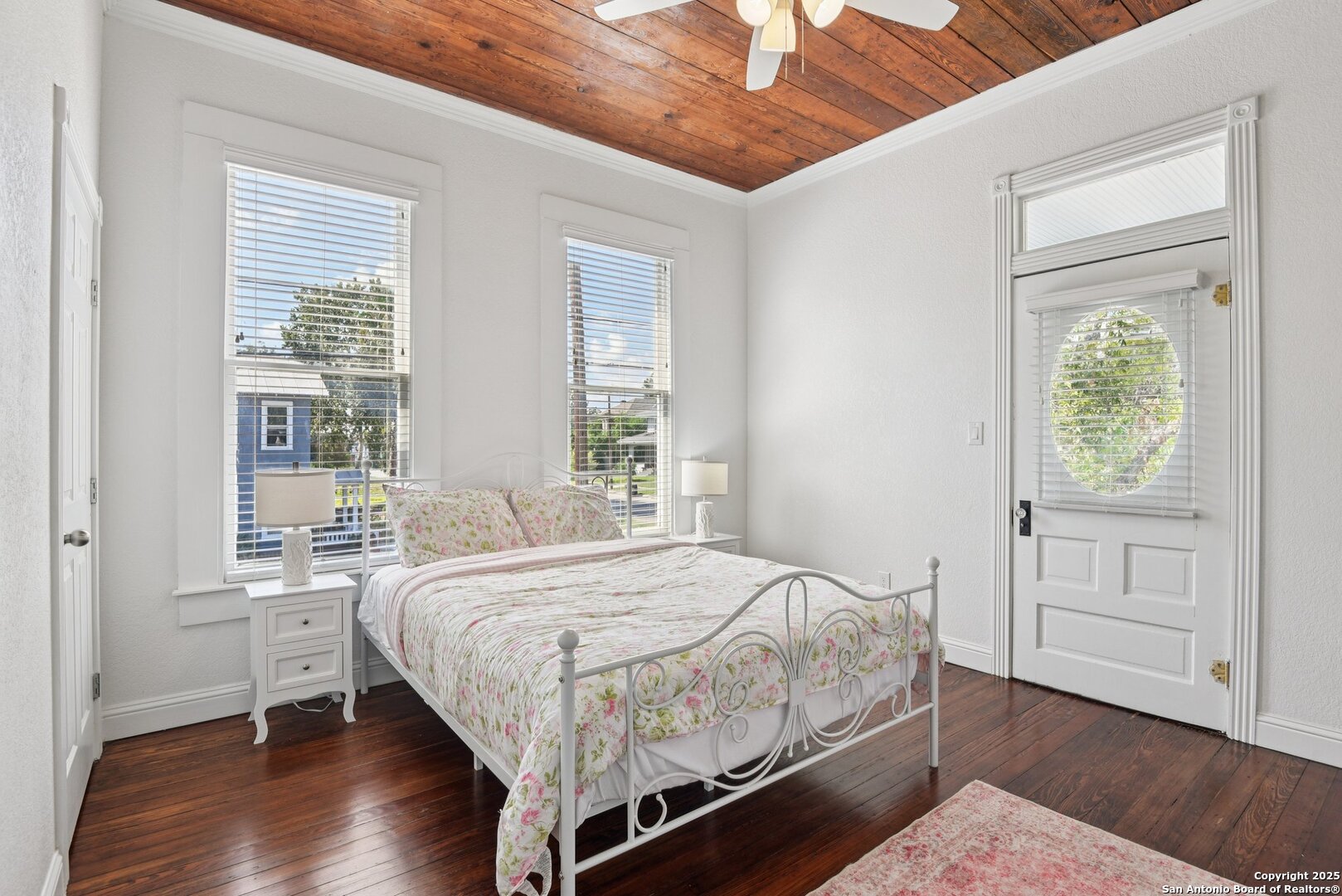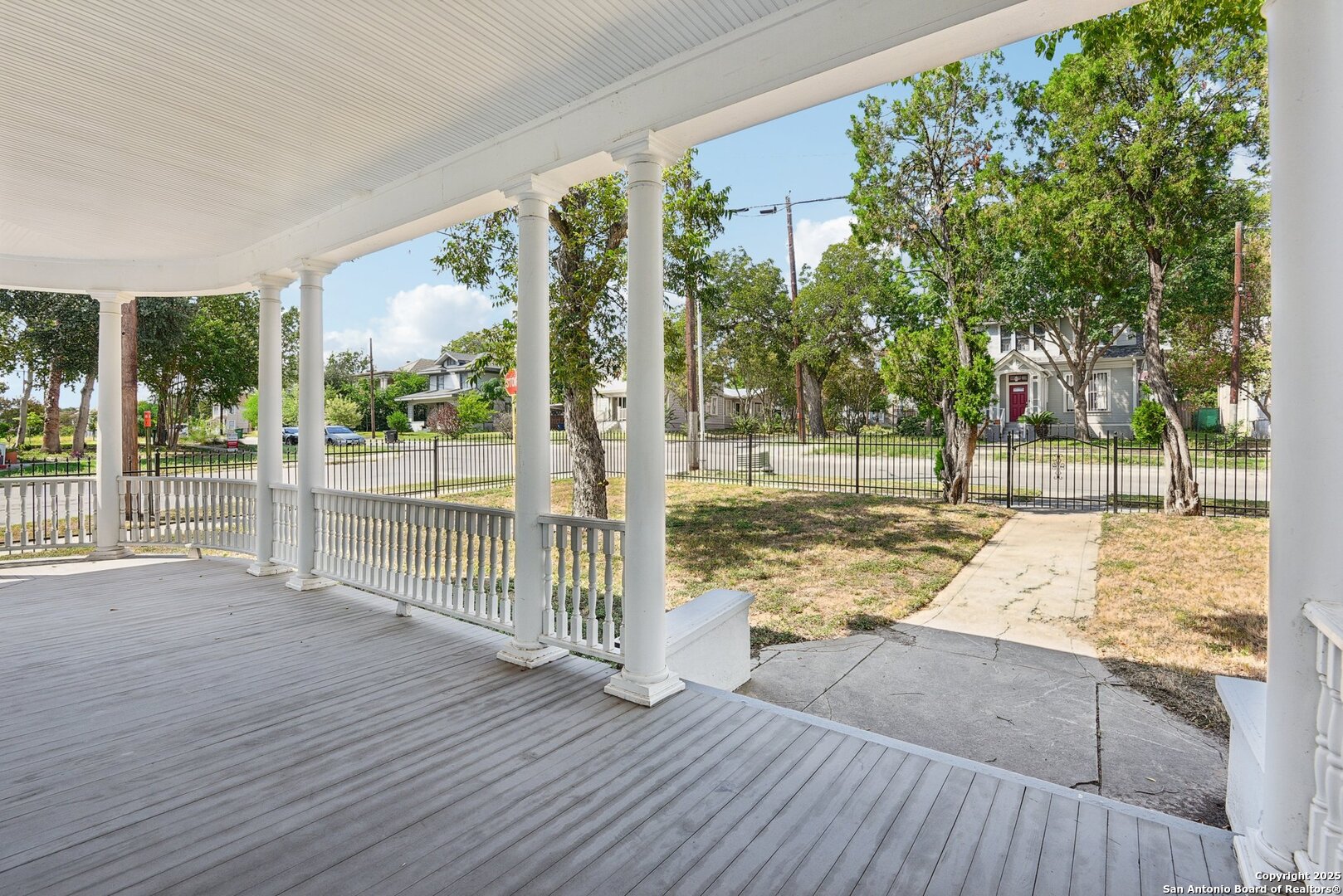 Built in 1894, this beautifully renovated Georgian-Inspired Victorian home in the Dignowity Hill Historic District blends original character with modern updates. A wrap-around porch stretches across the front of the home, inviting you to relax and enjoy the spacious fenced in yard on this large corner lot. Upon entering, you are welcomed by an elegant receiving room accented with a chandelier, custom-coffered ceilings; a classic design complemented by bespoke wallpaper and large windows that flood the room with natural light. With high ceilings accented by wood paneling, hardwood Pine flooring, this home features preserved historic charm while offering the comfort and functionality of contemporary living. The kitchen has quartz countertops, a ceramic farmhouse sink beneath a window overlooking the yard, new cabinetry throughout, stainless steel appliances and a breakfast bar. The downstairs primary suite has a beautifully updated bathroom with distinctive tilework, a double vanity and a spacious walk-in shower. All secondary bedrooms are upstairs, with one including its own 2nd story walk out balcony. The backyard is xeriscaped for low-maintenance living and fully enclosed by an iron fence, with on-premises parking . A newer metal roof adds to the longevity and value of this home. The second partially-finished out back house offers possibilities for a flexible space for guests or income potential through a long-term rental or Airbnb. This home is truly a gem in the heart of the historic East Side, only minutes away from downtown San Antonio, the Pearl Brewery, Blue Star Brewery, the Riverwalk, the Alamodome and with an easy commute to Fort Sam Houston. All furniture is negotiable with the sale.