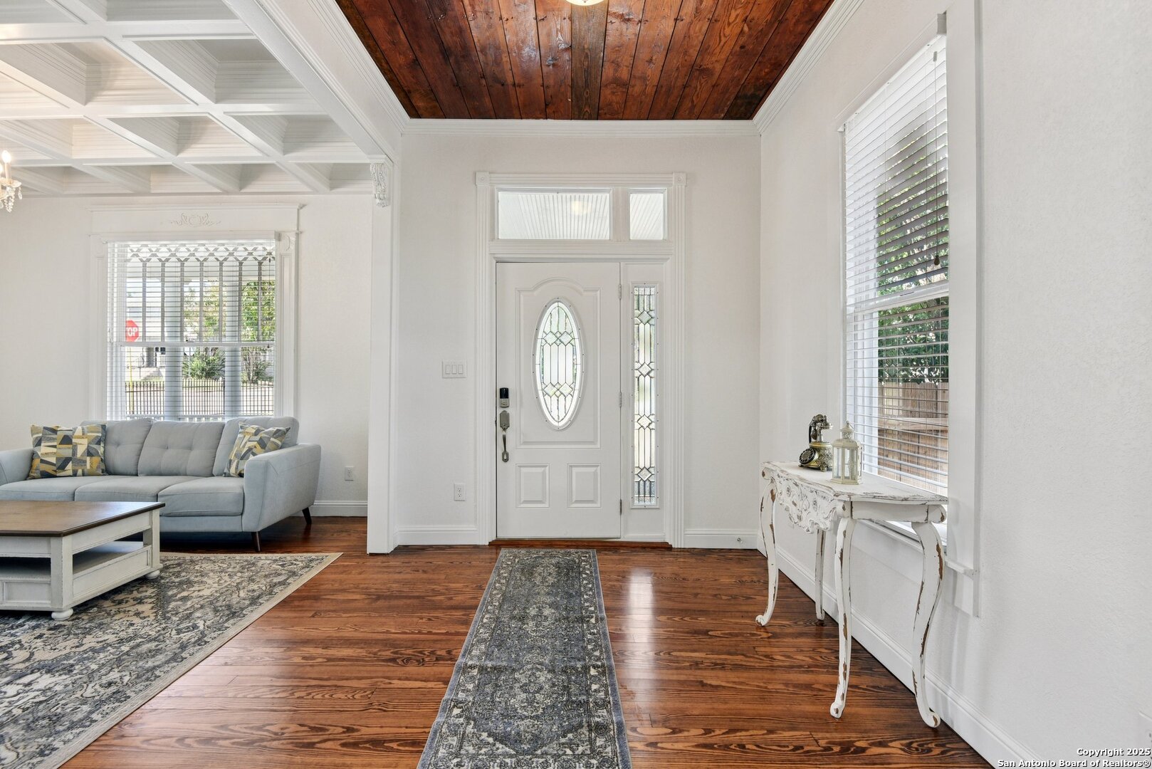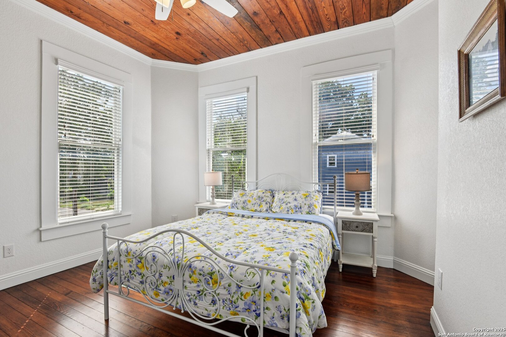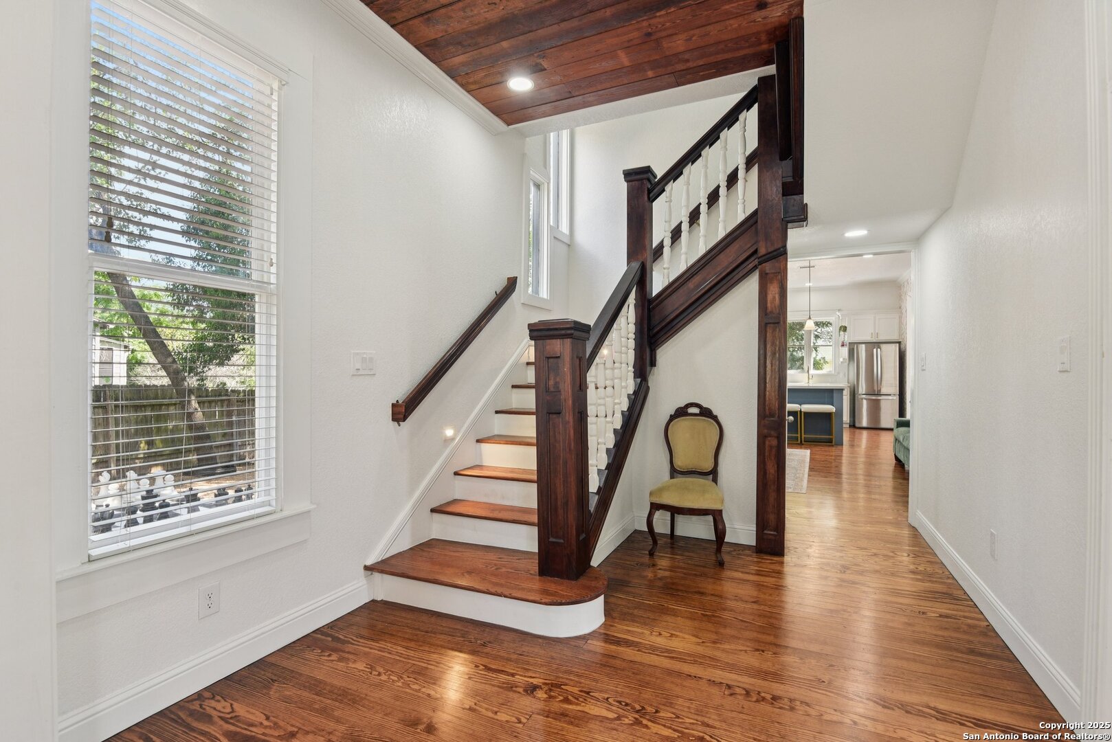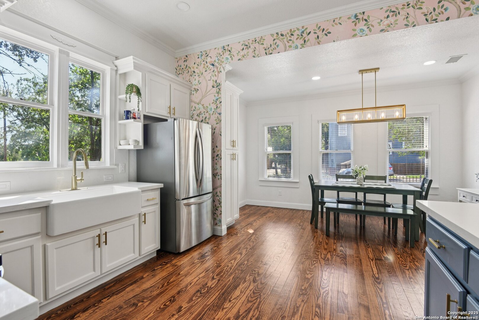 Built in 1894, this beautifully renovated Georgian-Inspired Victorian home in the Dignowity Hill Historic District blends original character with modern updates. A wrap-around porch stretches across the front of the home, inviting you to relax and enjoy the spacious fenced in yard on this large corner lot. Upon entering, you are welcomed by an elegant receiving room accented with a chandelier, custom-coffered ceilings; a classic design complemented by bespoke wallpaper and large windows that flood the room with natural light. With high ceilings accented by wood paneling, hardwood Pine flooring, this home features preserved historic charm while offering the comfort and functionality of contemporary living. The kitchen has quartz countertops, a ceramic farmhouse sink beneath a window overlooking the yard, new cabinetry throughout, stainless steel appliances and a breakfast bar. The downstairs primary suite has a beautifully updated bathroom with distinctive tilework, a double vanity and a spacious walk-in shower. All secondary bedrooms are upstairs, with one including its own 2nd story walk out balcony. The backyard is xeriscaped for low-maintenance living and fully enclosed by an iron fence, with on-premises parking . A newer metal roof adds to the longevity and value of this home. The second partially-finished out back house offers possibilities for a flexible space for guests or income potential through a long-term rental or Airbnb. This home is truly a gem in the heart of the historic East Side, only minutes away from downtown San Antonio, the Pearl Brewery, Blue Star Brewery, the Riverwalk, the Alamodome and with an easy commute to Fort Sam Houston. All furniture is negotiable with the sale.