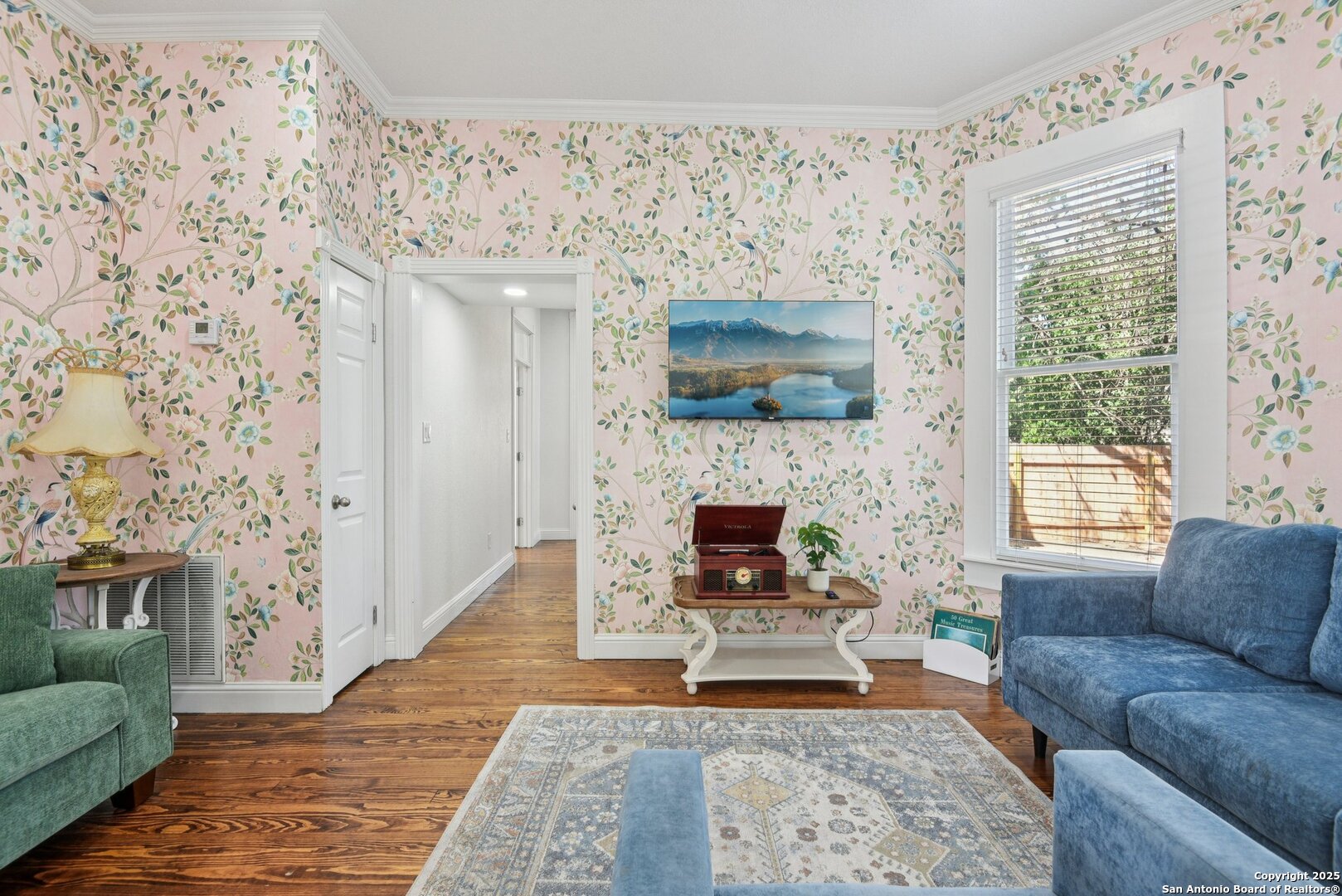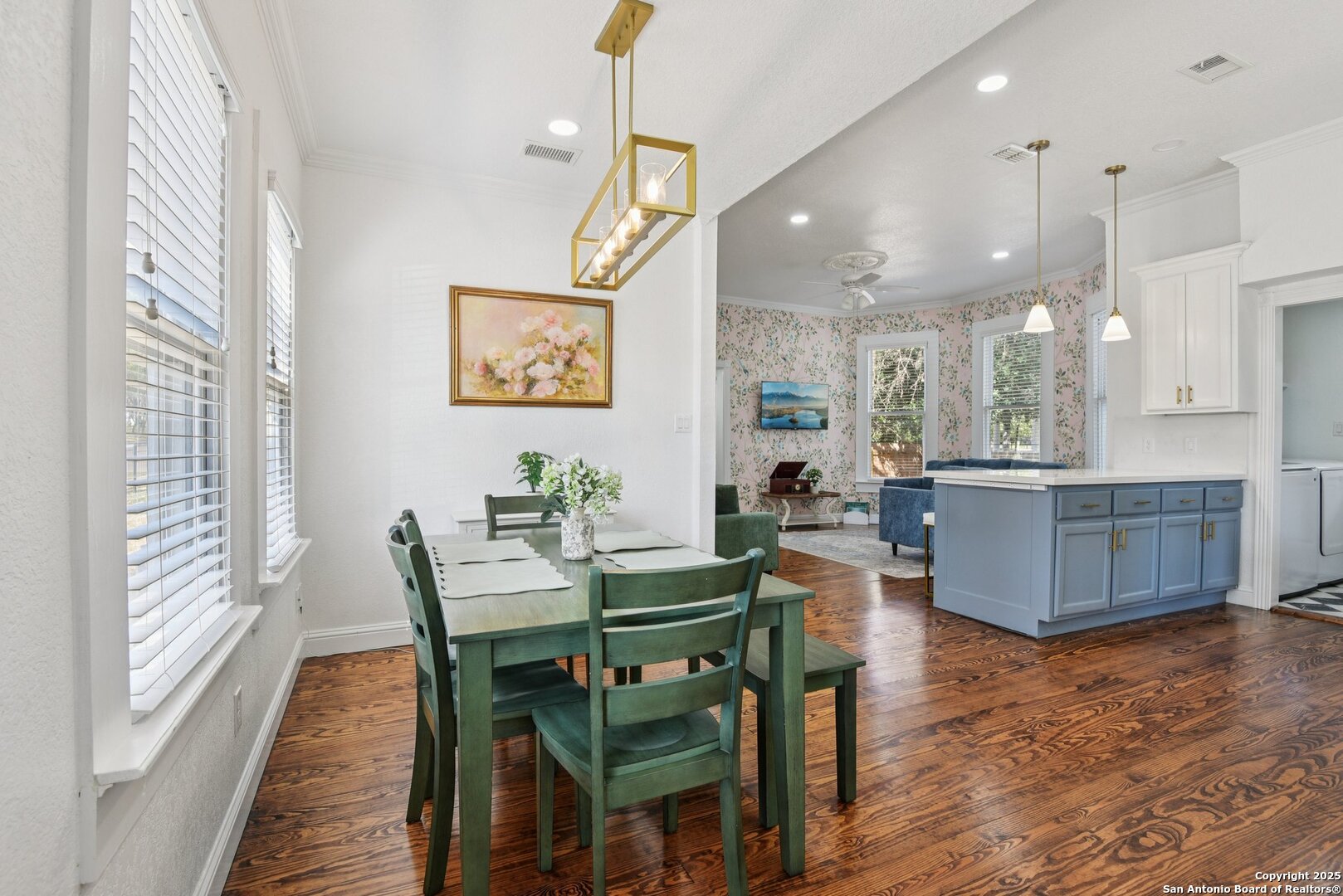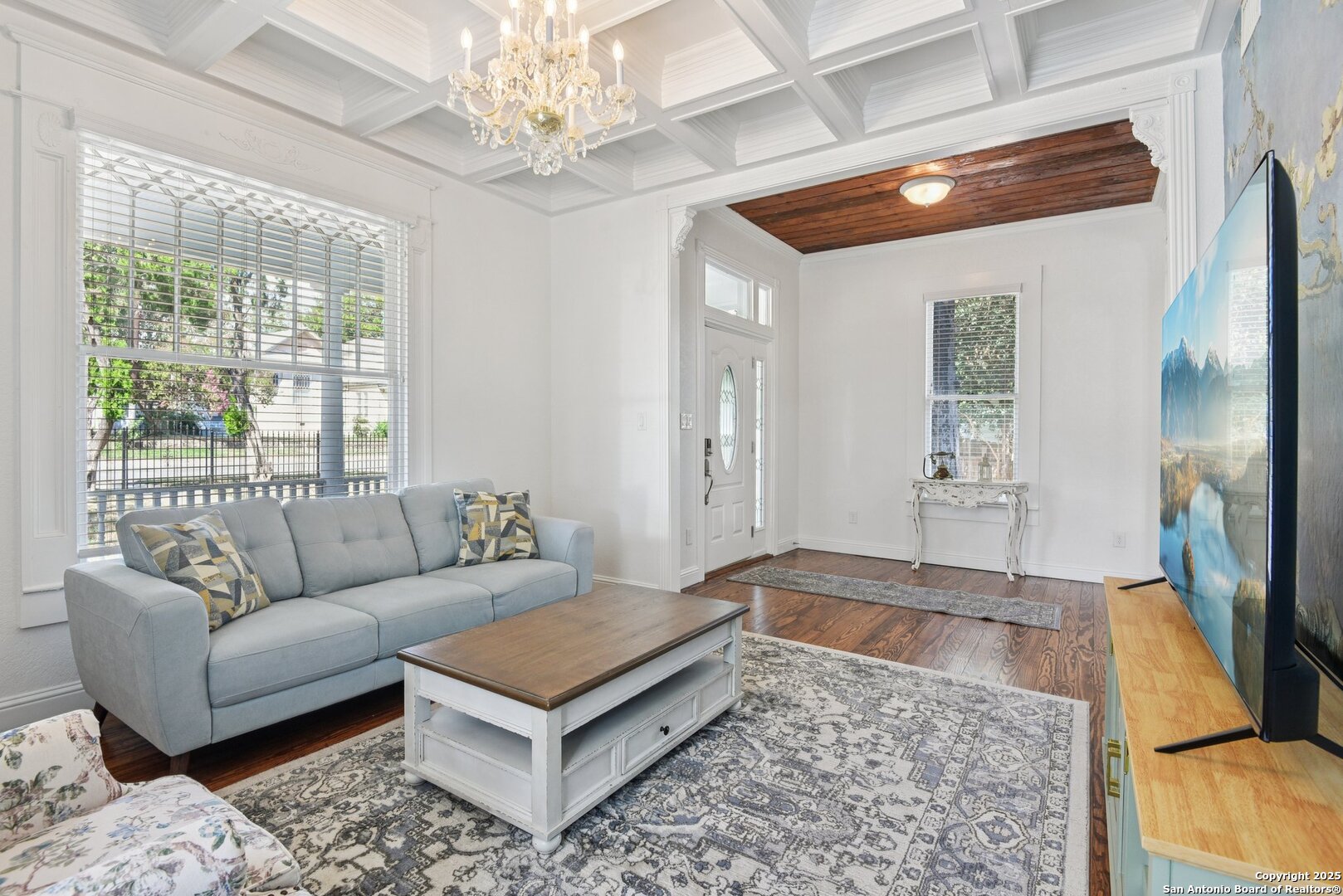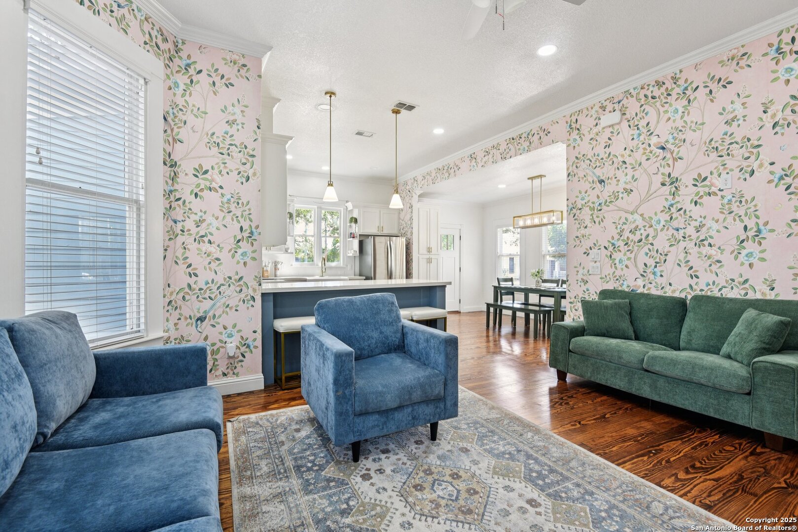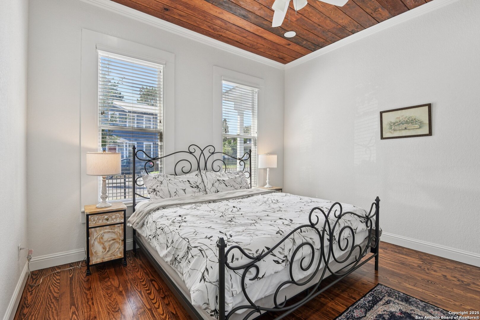 Built in 1894, this beautifully renovated Georgian-Inspired Victorian home in the Dignowity Hill Historic District blends original character with modern updates. A wrap-around porch stretches across the front of the home, inviting you to relax and enjoy the spacious fenced in yard on this large corner lot. Upon entering, you are welcomed by an elegant receiving room accented with a chandelier, custom-coffered ceilings; a classic design complemented by bespoke wallpaper and large windows that flood the room with natural light. With high ceilings accented by wood paneling, hardwood Pine flooring, this home features preserved historic charm while offering the comfort and functionality of contemporary living. The kitchen has quartz countertops, a ceramic farmhouse sink beneath a window overlooking the yard, new cabinetry throughout, stainless steel appliances and a breakfast bar. The downstairs primary suite has a beautifully updated bathroom with distinctive tilework, a double vanity and a spacious walk-in shower. All secondary bedrooms are upstairs, with one including its own 2nd story walk out balcony. The backyard is xeriscaped for low-maintenance living and fully enclosed by an iron fence, with on-premises parking . A newer metal roof adds to the longevity and value of this home. The second partially-finished out back house offers possibilities for a flexible space for guests or income potential through a long-term rental or Airbnb. This home is truly a gem in the heart of the historic East Side, only minutes away from downtown San Antonio, the Pearl Brewery, Blue Star Brewery, the Riverwalk, the Alamodome and with an easy commute to Fort Sam Houston. All furniture is negotiable with the sale.