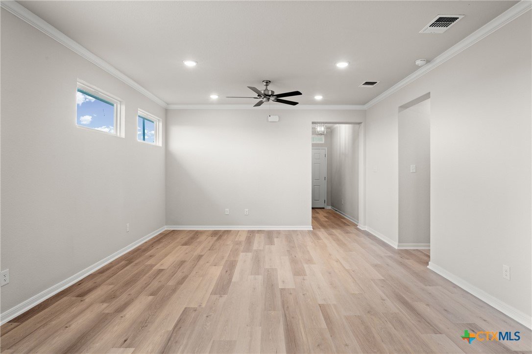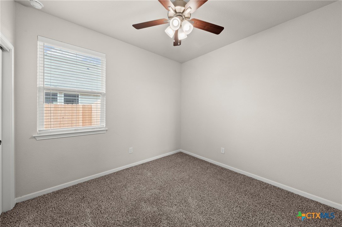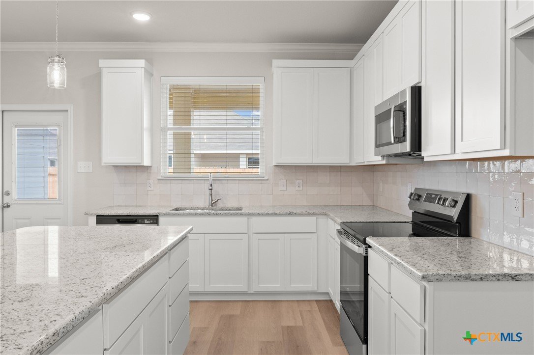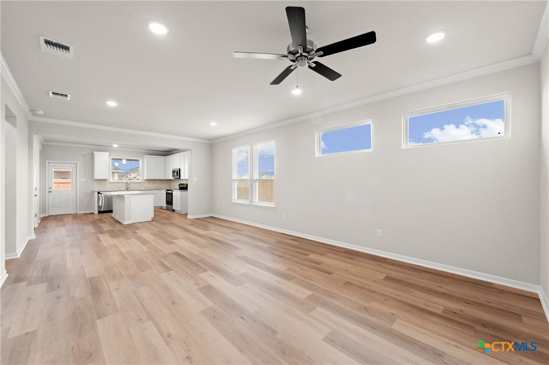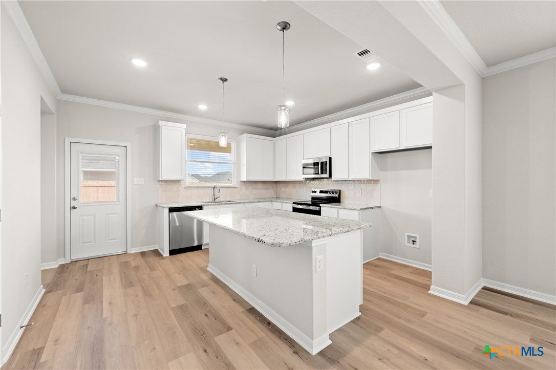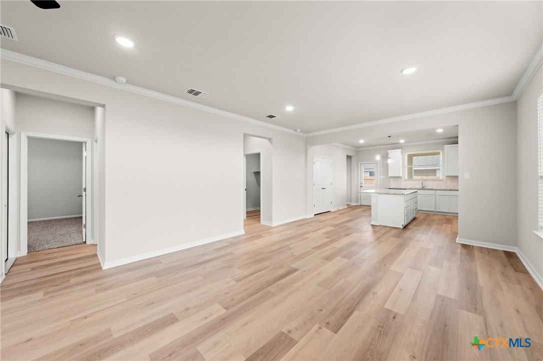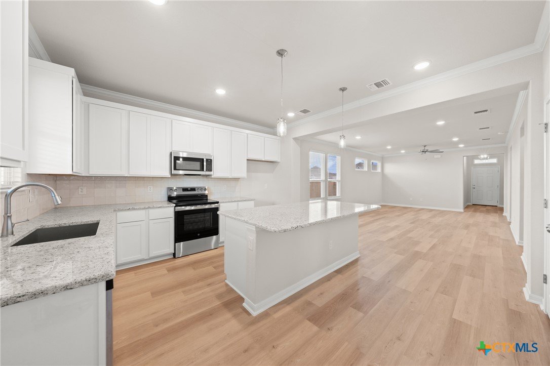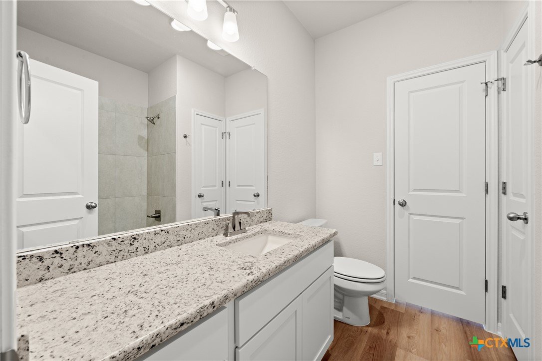 The Montgomery is our Hartrick Ranch Model Home's featured floor plan. This plan features a four-bed, two-bath layout across 1,700 square feet with an open-concept family room, dining area, and kitchen. The secondary bath includes two entries from the bedroom or the main living area. The kitchen includes stainless steel appliances with a large island that provides additional seating, counter space, and cabinet storage. The primary bath has dual vanity sinks, a private water closet, and a walk-in closet. Plan variations include a shower at the primary bath or a shower and tub combo, sliding pocket doors in the water closet, and a study in place of the fourth bedroom.