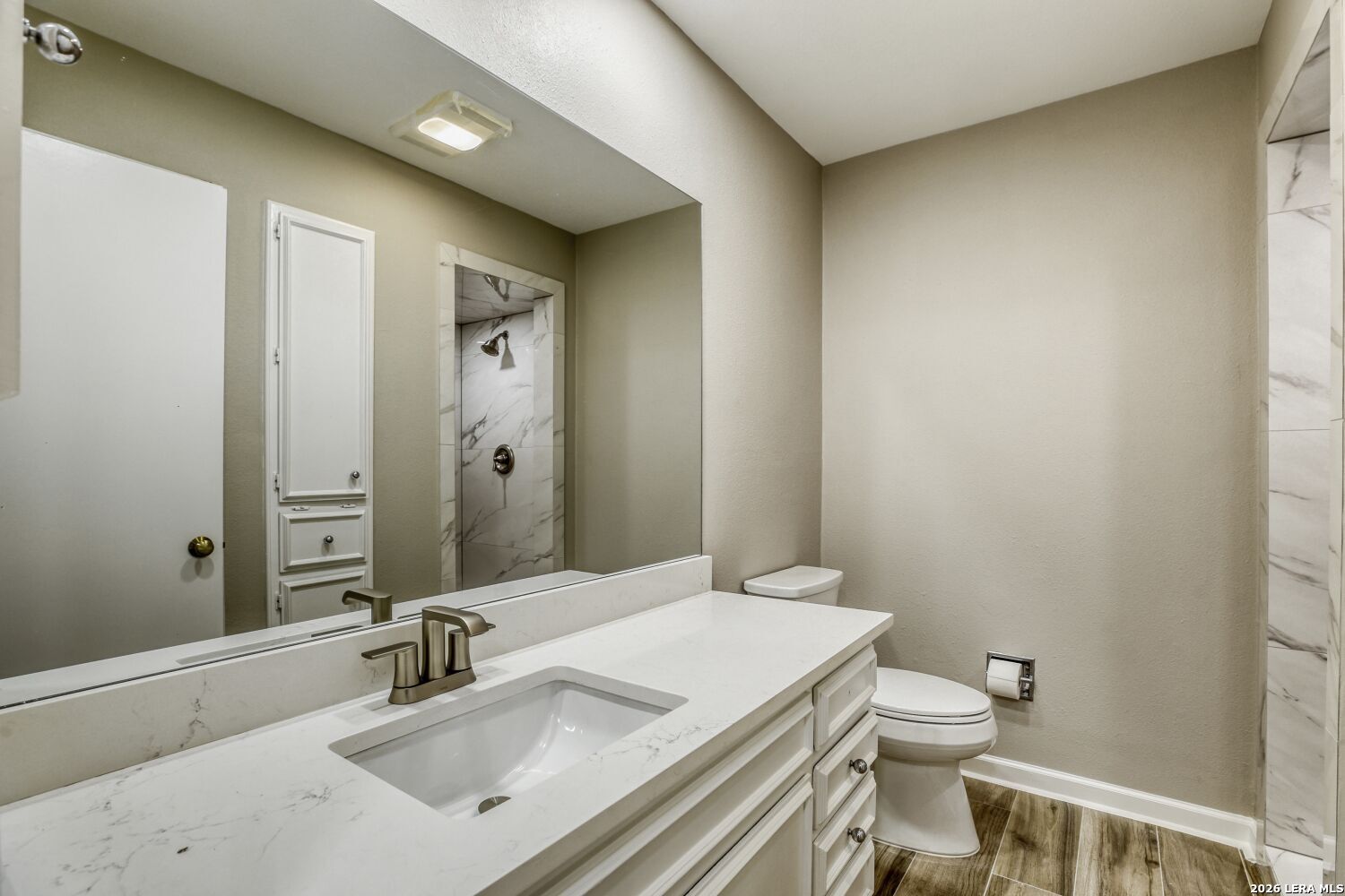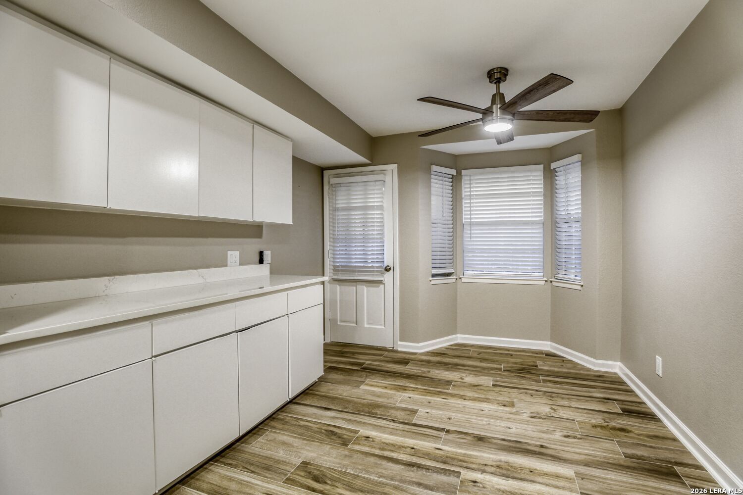 Take a look at this beautiful 1,841-square-foot condo offering spacious living, thoughtful upgrades, and everyday convenience in a highly accessible location. Inside, you'll find wood-look tile flooring, fresh paint, and updated lighting that creates a clean, modern feel throughout. The open living and dining room combination provides generous space for entertaining, while a separate breakfast area offers a comfortable setting for casual meals. The kitchen has been refreshed with quartz countertops, updated stove and oven. Abundant cabinetry, and ample counter space make for easy meal prep. Refrigerator included. The primary suite serves as a private retreat, featuring tile flooring, ceiling fan, a large walk-in closet, and quartz counters. Bedroom three offers flexibility and could easily function as a home office, guest room, or hobby space. Washer/dryer hookup provides added convenience. Step outside to enjoy the large covered patio, perfect for relaxing or entertaining. Storage space on the patio, near the parking area, and by the front door. The charming lead-glass front-facing window adds distinctive character. Two covered parking spaces are included. Location is a standout feature-directly across the street from H-E-B and close to the bus line, making daily errands and commuting simple and convenient. Residents also enjoy access to the neighborhood pool for warm Texas afternoons. Spacious, updated, and ideally situated, this condo offers comfortable living with exceptional accessibility.