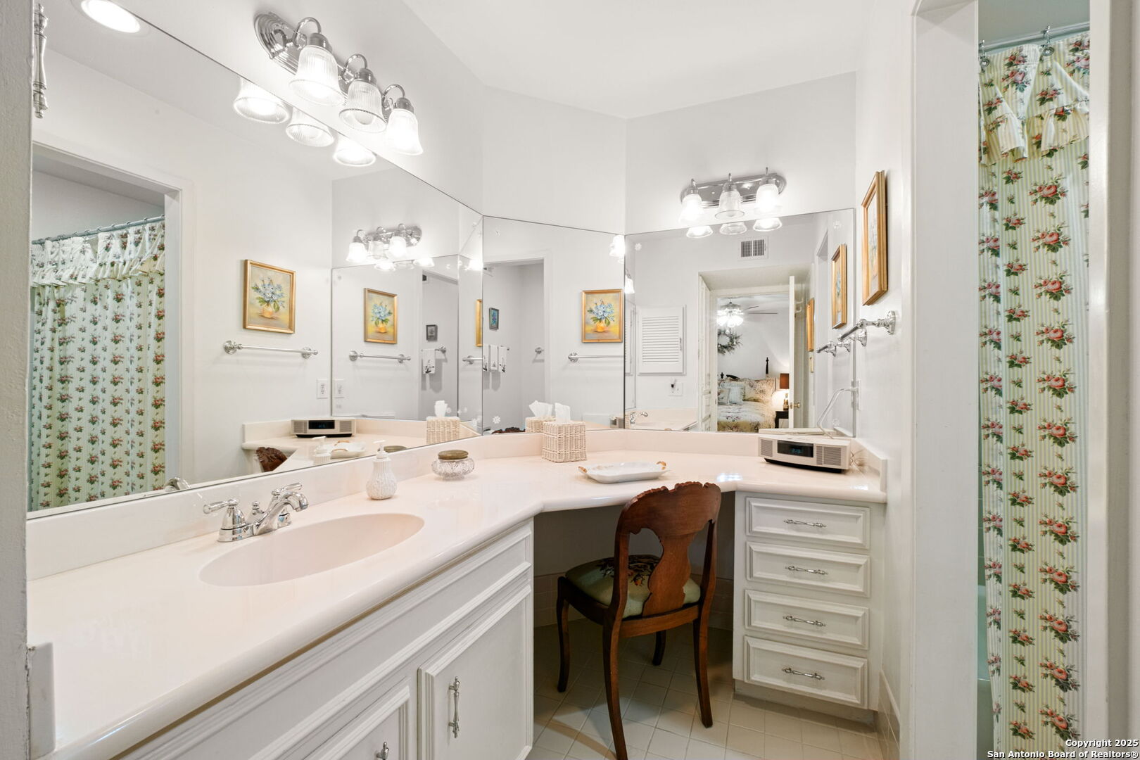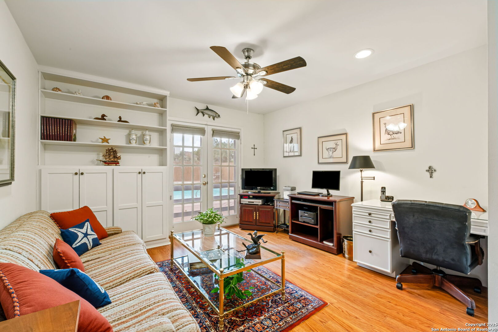 Step into the pinnacle of convenience and luxury at this Alamo Heights area, Alamo Heights ISD condominium. A stylish and cheerful front entrance greets you at this first floor home with open floor plan. The large living room with wood floors, high ceilings and an abundance of natural light is ideal for welcoming family and friends. A dedicated dining area flows seamlessly into the kitchen, while a charming bay-window breakfast room overlooks a private patio-ideal for gardening, morning coffee, or relaxing outdoors. The well-equipped kitchen includes a large utility closet with space for full-size, side-by-side washer and dryer, along with generous storage. The secondary bedroom is spaciously designed, with a large closet. A sophisticated guest bath adorned with custom wallpaper is sure to impress. Additional hallway closets ensure you'll never run out of storage. The primary suite is a true retreat, featuring a sitting area, patio view, and an expansive walk-in closet. The primary bath is thoughtfully designed with a vanity/dressing area and a private water closet with tub/shower combo. What sets this home apart is the third bedroom. Outfitted with built-ins, it can easily serve as a versatile office or family room. French doors open directly onto the pool-essentially a private extension of your living space, perfect for year-round enjoyment and entertaining. Practicality meets convenience with an exclusive two-car carport just steps from the front door and an under-stairs storage closet. Located at the Royal George Condominiums, you'll be within walking distance of excellent shopping, dining, and top-rated Alamo Heights schools.