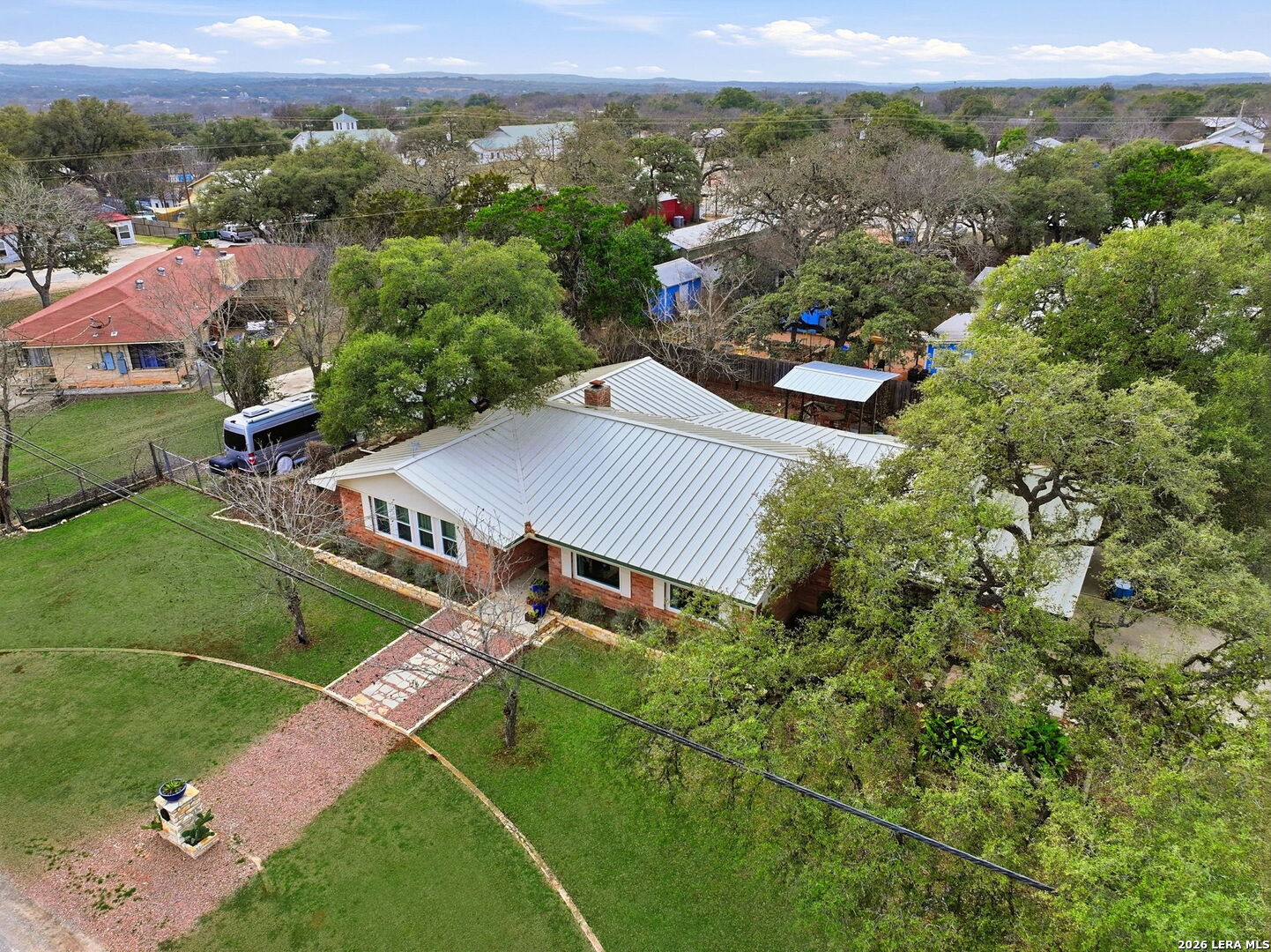 Blanco, Texas, presents a welcoming community situated along the picturesque Blanco River. This extensively renovated residence offers three bedrooms, two bathrooms, and numerous upgrades, including a Standing Seam Metal roof, rain gutters, new double-pane windows, a new garage door, all luxury vinyl planking flooring except one bath is ceramic tile & fresh paint inside & out. The kitchen has been completely modernized with custom cabinets & equipped with all-new appliances. The home provides two distinct living areas. The formal living/dining room is ideal for hosting guests, while the cozy family room offers relaxation with its wood ceiling, a striking rock fireplace, and glass doors that lead out to the flagstone patio & backyard. The spacious utility room can also serve as an art studio or workshop. Exterior amenities include a storage building, gazebo, RV parking, and hookups. Shops, dining options, and Blanco State Park on the river are all within walking distance.