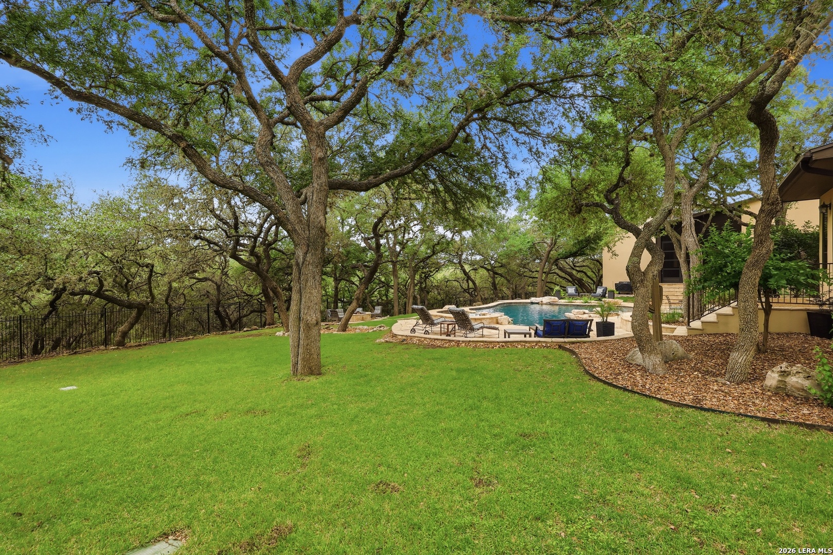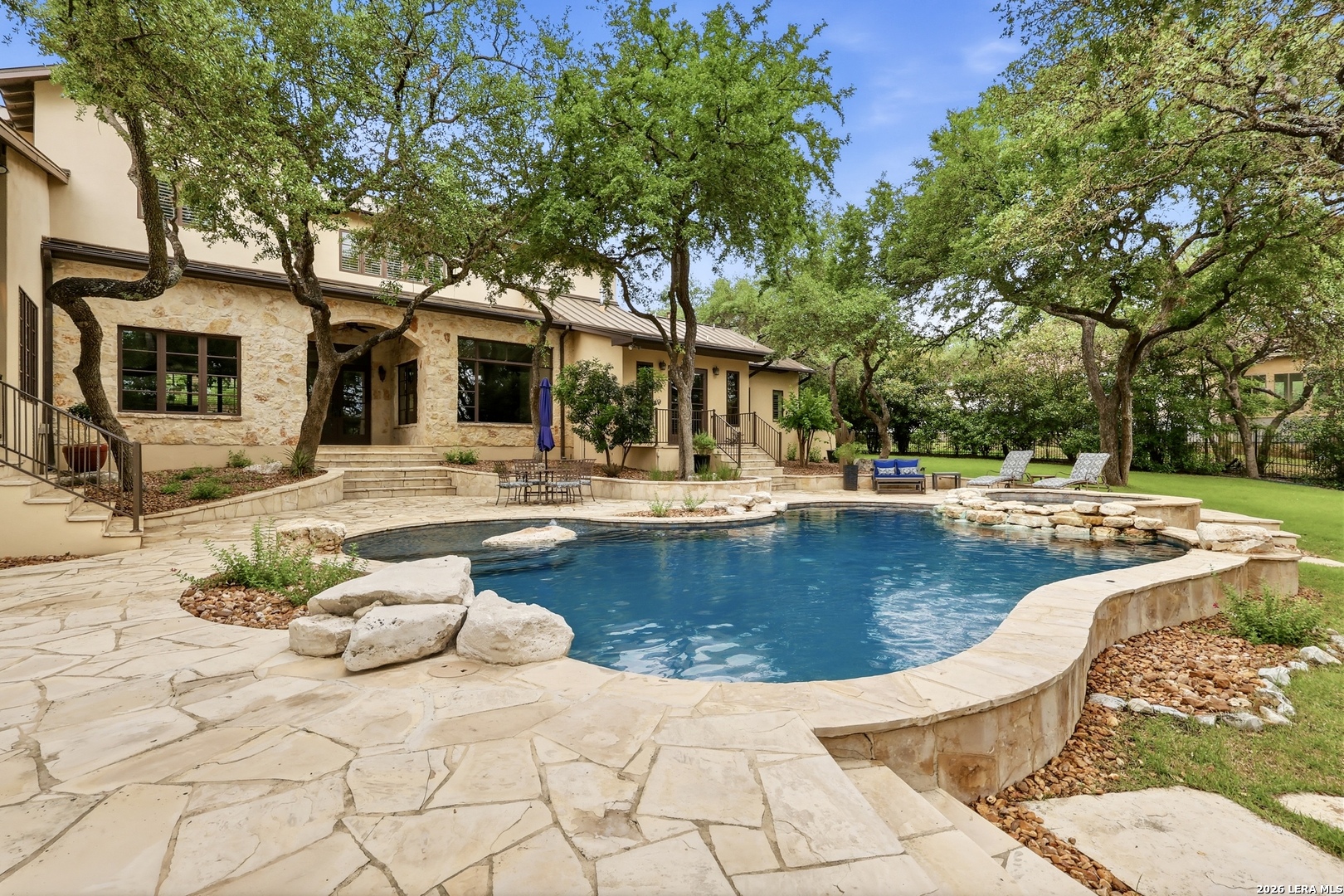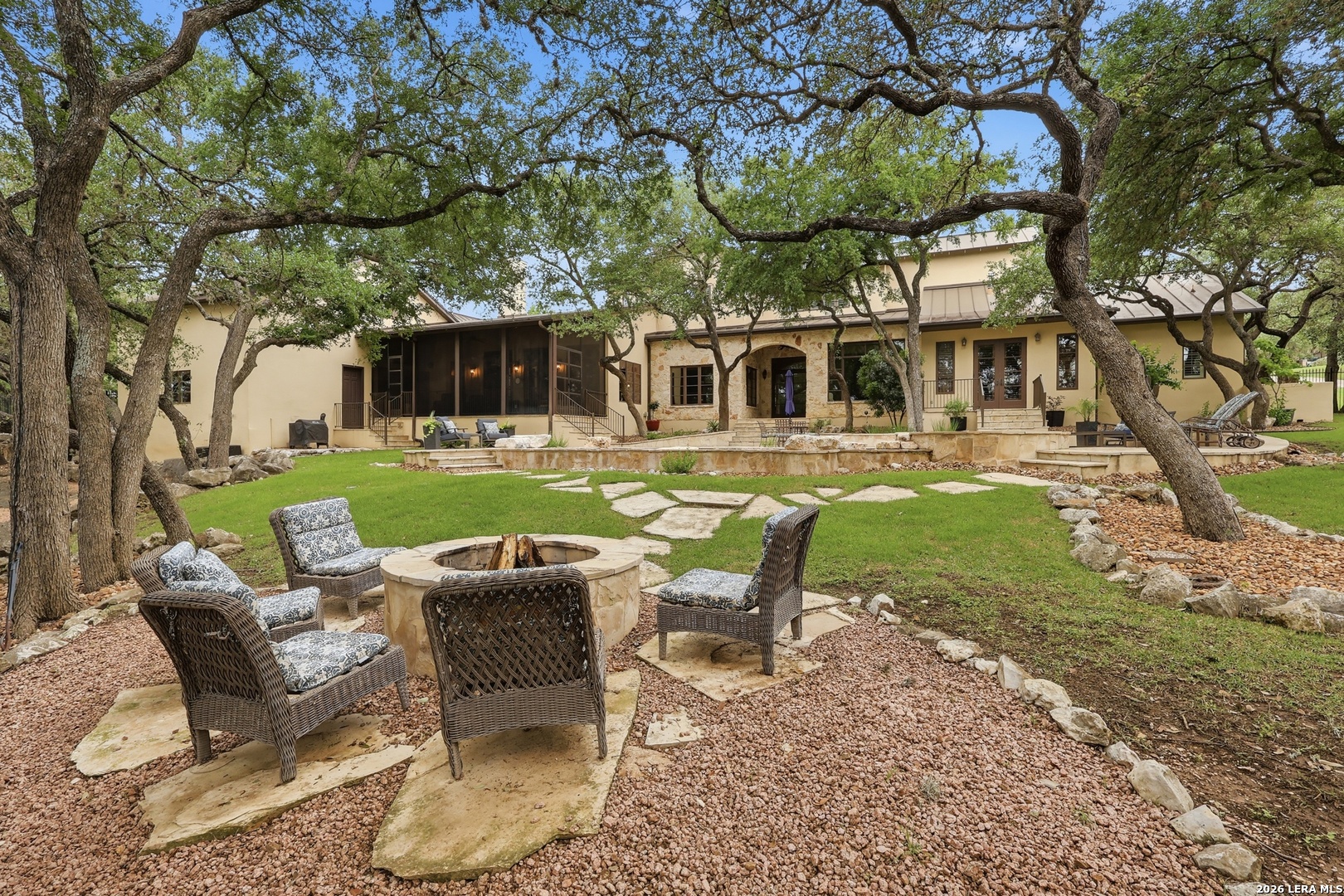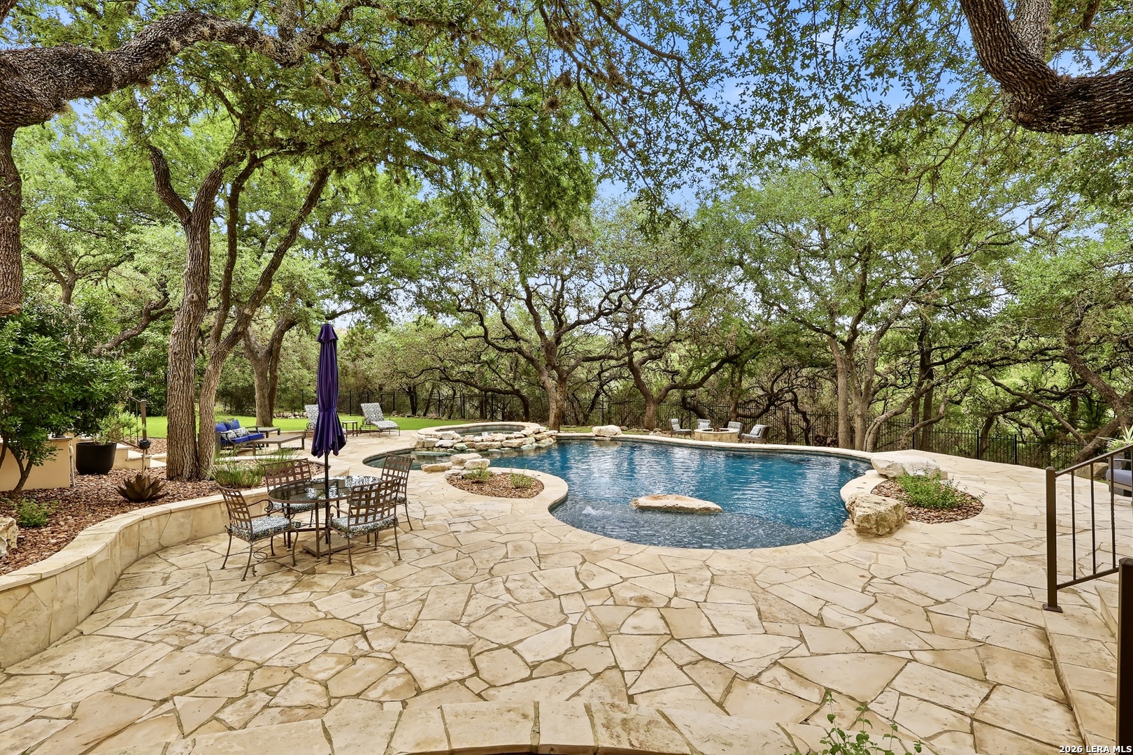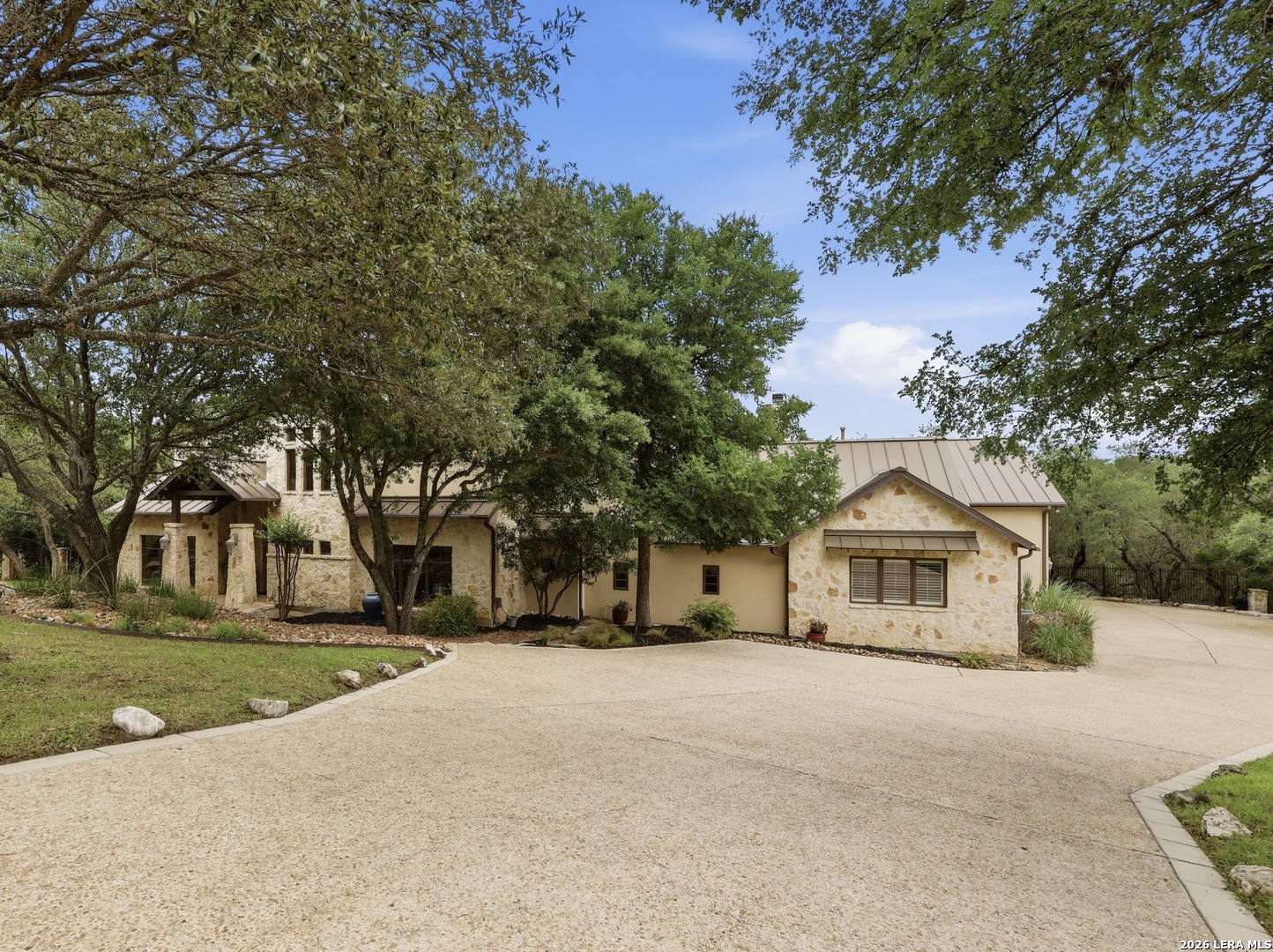 Open house Sunday May 3 from 2-4 pm. Experience refined Hill Country living in this extraordinary 5,692-square-foot estate, ideally situated within the prestigious Champions Ridge community. Set on a private, park-like homesite backing to acres of protected woodlands, this remarkable residence offers an exceptional blend of timeless architecture, modern luxury, and serene natural beauty. Designed with both elegance and functionality in mind, the home features five spacious bedrooms, each with its own en-suite bath and walk-in closet, along with a versatile sixth flex room. Two well-appointed bedroom suites are located on the main level, providing convenience and flexibility for guests or multigenerational living. The secluded primary suite serves as a true sanctuary, offering spa-inspired amenities including a sunken Jacuzzi tub, expansive walk-in shower, and generous closet space. Private access to the pool and hot tub enhances the resort-style ambiance, while dedicated HVAC and a tankless water heater ensure optimal comfort year-round. Adjacent, a distinguished executive study showcases custom built-in cabinetry and elegant sliding glass and wood doors, creating a sophisticated and private workspace. Thoughtfully designed interiors are filled with natural light, thanks to custom windows that frame picturesque views of the outdoor oasis and surrounding woodlands. Select rooms feature elegant wood shutters, offering both style and privacy. Seamless indoor-outdoor living is achieved through three sets of double outswing doors that open to an entertainer's dream backyard. Here, a sparkling sport pool, mature oak trees with ambient downlighting, a fully equipped outdoor kitchen, and a cozy fire pit create an inviting retreat for gatherings or quiet evenings under the stars. A screened-in porch and wood-beamed ceilings in the family room further enhance the home's warmth and character. At the heart of the home, the expansive chef's kitchen is designed to impress, featuring premium appliances including a Viking cooktop, double ovens with warming drawer, built-in refrigerator, wine fridge, ice maker, dishwasher, and trash compactor. The open-concept layout flows effortlessly into the family room, formal dining area, butler's pantry, and sunlit breakfast nook-perfect for both grand entertaining and intimate daily living. Upstairs, three additional bedrooms and a spacious secondary living area provide ample room for relaxation. The flexible bonus room offers endless possibilities as a sixth bedroom, media room, fitness space, or playroom. Exceptional storage and organization are found throughout, including a well-appointed utility room with built-in cabinetry and counter space, a thoughtfully placed hall tree at the side entrance, a large walk-in attic, two additional pull-down attic spaces, and a main-level storage closet. Modern conveniences include a whole-home Sonos sound system, both indoors and out, as well as a hardwired security system for peace of mind. Residents of Champions Ridge enjoy exclusive access to a 31-acre nature preserve with scenic hiking trails, a 24-hour guarded gate, and premier amenities including tennis, pickleball, and sport courts-all set within a tranquil, park-like environment. This is a rare opportunity to own a truly exceptional estate where luxury, privacy, and natural beauty converge.