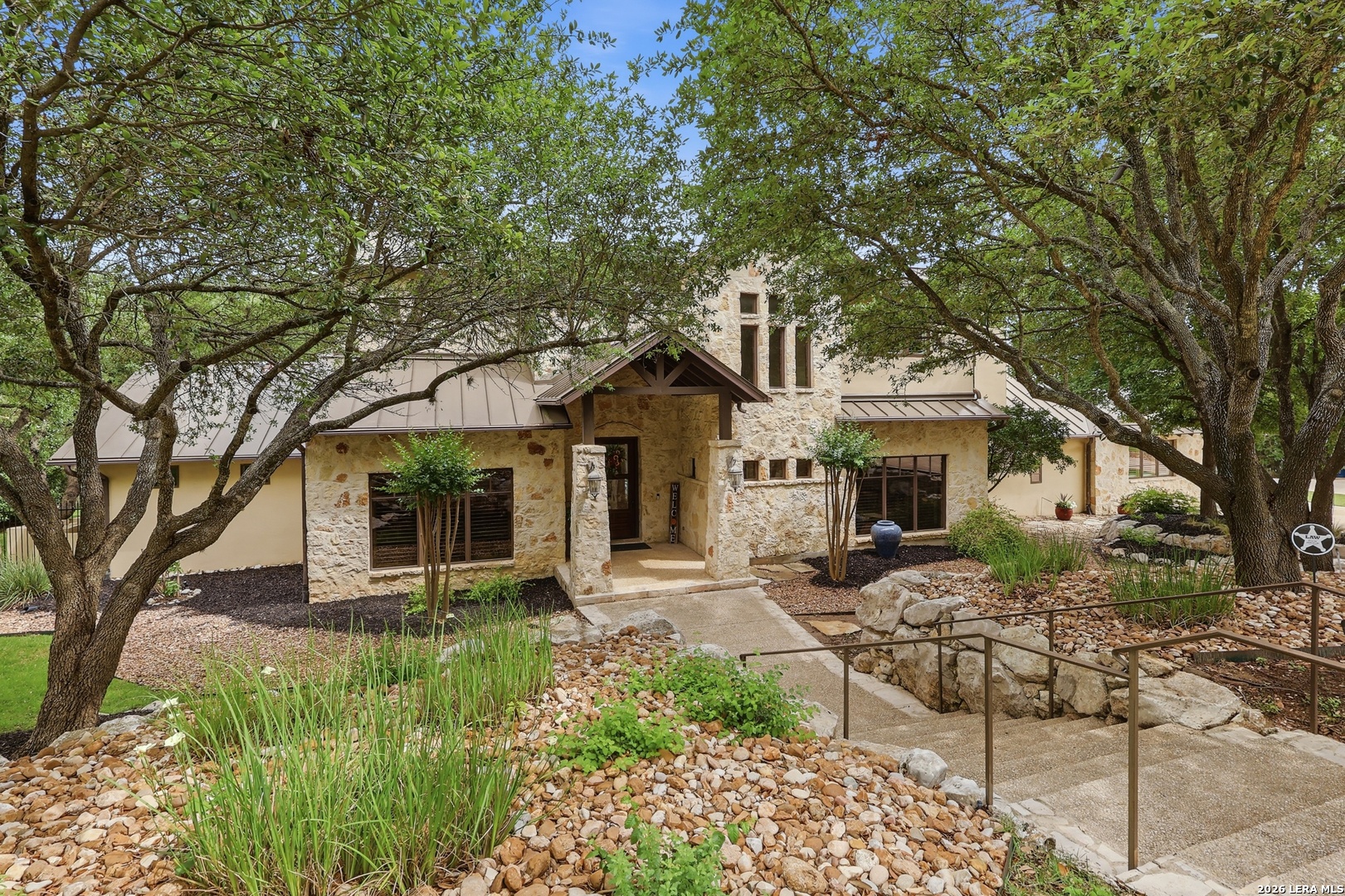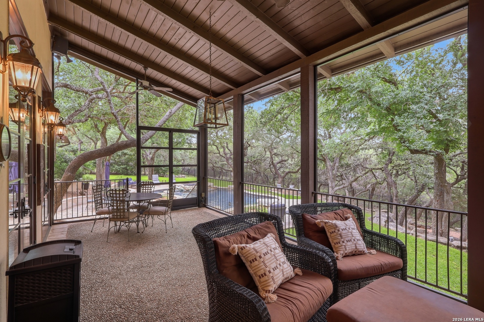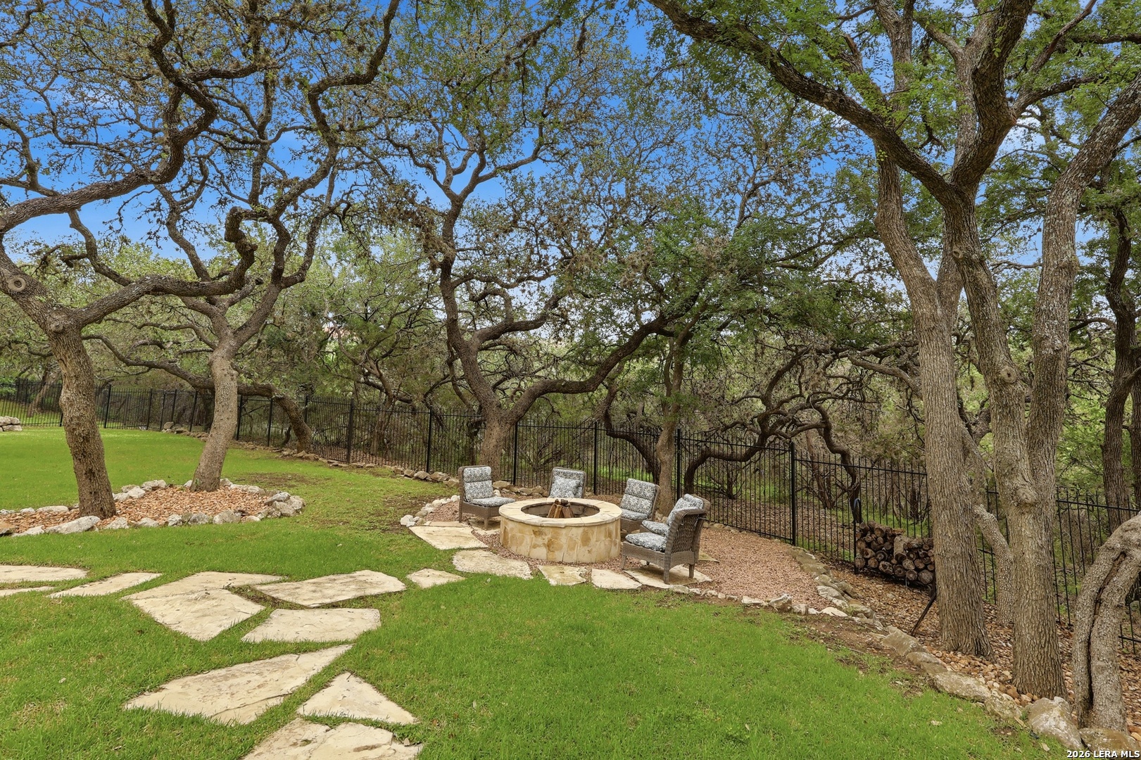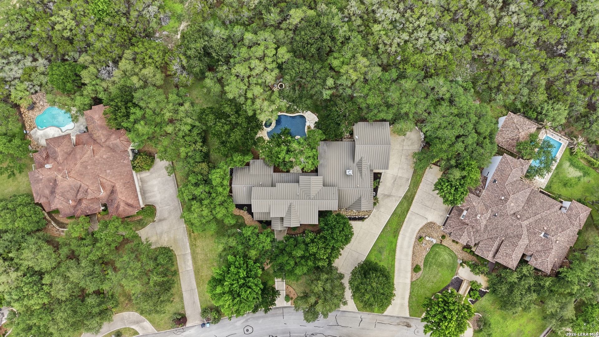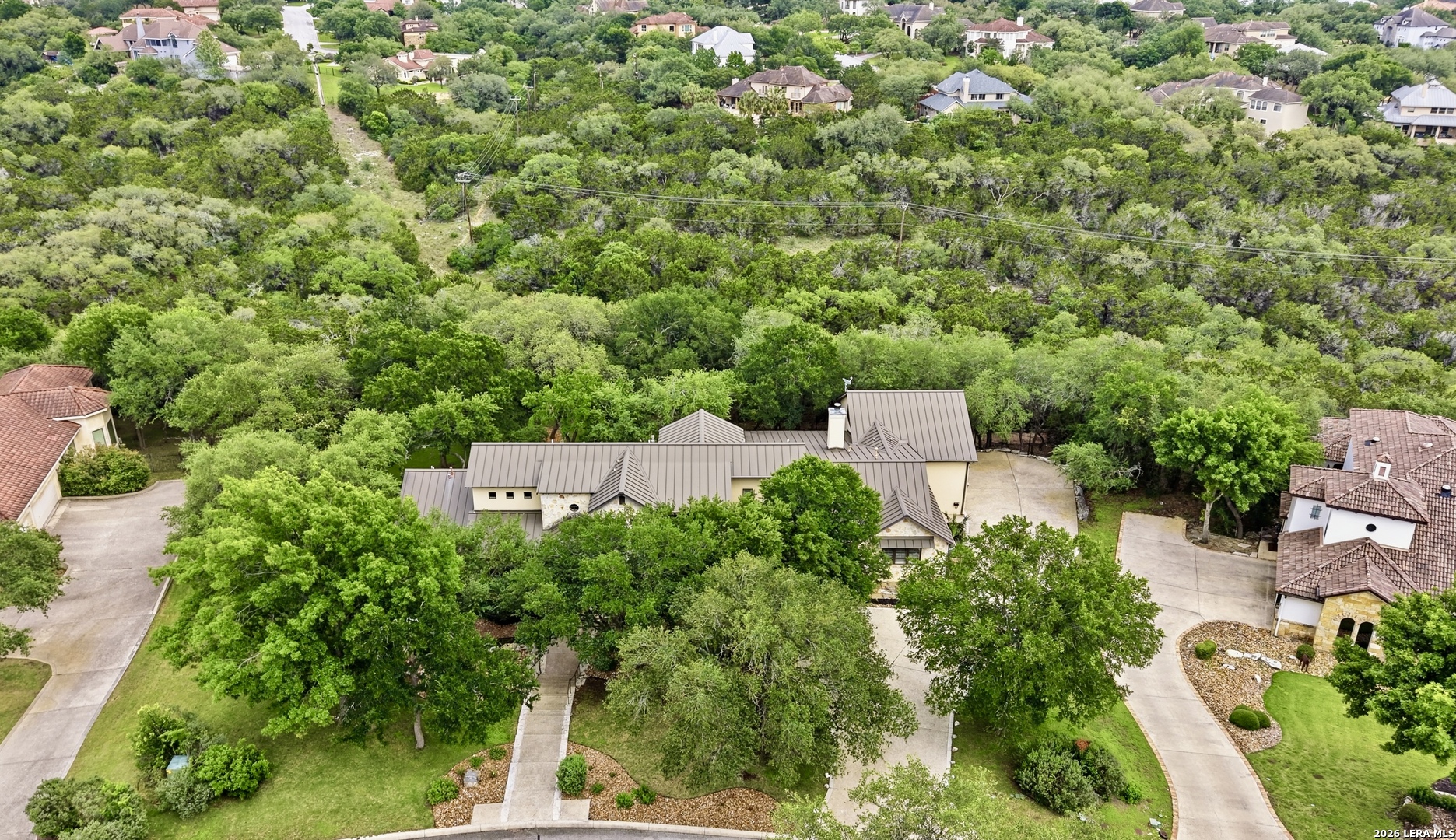 Open house Sunday May 3 from 2-4 pm. Experience refined Hill Country living in this extraordinary 5,692-square-foot estate, ideally situated within the prestigious Champions Ridge community. Set on a private, park-like homesite backing to acres of protected woodlands, this remarkable residence offers an exceptional blend of timeless architecture, modern luxury, and serene natural beauty. Designed with both elegance and functionality in mind, the home features five spacious bedrooms, each with its own en-suite bath and walk-in closet, along with a versatile sixth flex room. Two well-appointed bedroom suites are located on the main level, providing convenience and flexibility for guests or multigenerational living. The secluded primary suite serves as a true sanctuary, offering spa-inspired amenities including a sunken Jacuzzi tub, expansive walk-in shower, and generous closet space. Private access to the pool and hot tub enhances the resort-style ambiance, while dedicated HVAC and a tankless water heater ensure optimal comfort year-round. Adjacent, a distinguished executive study showcases custom built-in cabinetry and elegant sliding glass and wood doors, creating a sophisticated and private workspace. Thoughtfully designed interiors are filled with natural light, thanks to custom windows that frame picturesque views of the outdoor oasis and surrounding woodlands. Select rooms feature elegant wood shutters, offering both style and privacy. Seamless indoor-outdoor living is achieved through three sets of double outswing doors that open to an entertainer's dream backyard. Here, a sparkling sport pool, mature oak trees with ambient downlighting, a fully equipped outdoor kitchen, and a cozy fire pit create an inviting retreat for gatherings or quiet evenings under the stars. A screened-in porch and wood-beamed ceilings in the family room further enhance the home's warmth and character. At the heart of the home, the expansive chef's kitchen is designed to impress, featuring premium appliances including a Viking cooktop, double ovens with warming drawer, built-in refrigerator, wine fridge, ice maker, dishwasher, and trash compactor. The open-concept layout flows effortlessly into the family room, formal dining area, butler's pantry, and sunlit breakfast nook-perfect for both grand entertaining and intimate daily living. Upstairs, three additional bedrooms and a spacious secondary living area provide ample room for relaxation. The flexible bonus room offers endless possibilities as a sixth bedroom, media room, fitness space, or playroom. Exceptional storage and organization are found throughout, including a well-appointed utility room with built-in cabinetry and counter space, a thoughtfully placed hall tree at the side entrance, a large walk-in attic, two additional pull-down attic spaces, and a main-level storage closet. Modern conveniences include a whole-home Sonos sound system, both indoors and out, as well as a hardwired security system for peace of mind. Residents of Champions Ridge enjoy exclusive access to a 31-acre nature preserve with scenic hiking trails, a 24-hour guarded gate, and premier amenities including tennis, pickleball, and sport courts-all set within a tranquil, park-like environment. This is a rare opportunity to own a truly exceptional estate where luxury, privacy, and natural beauty converge.