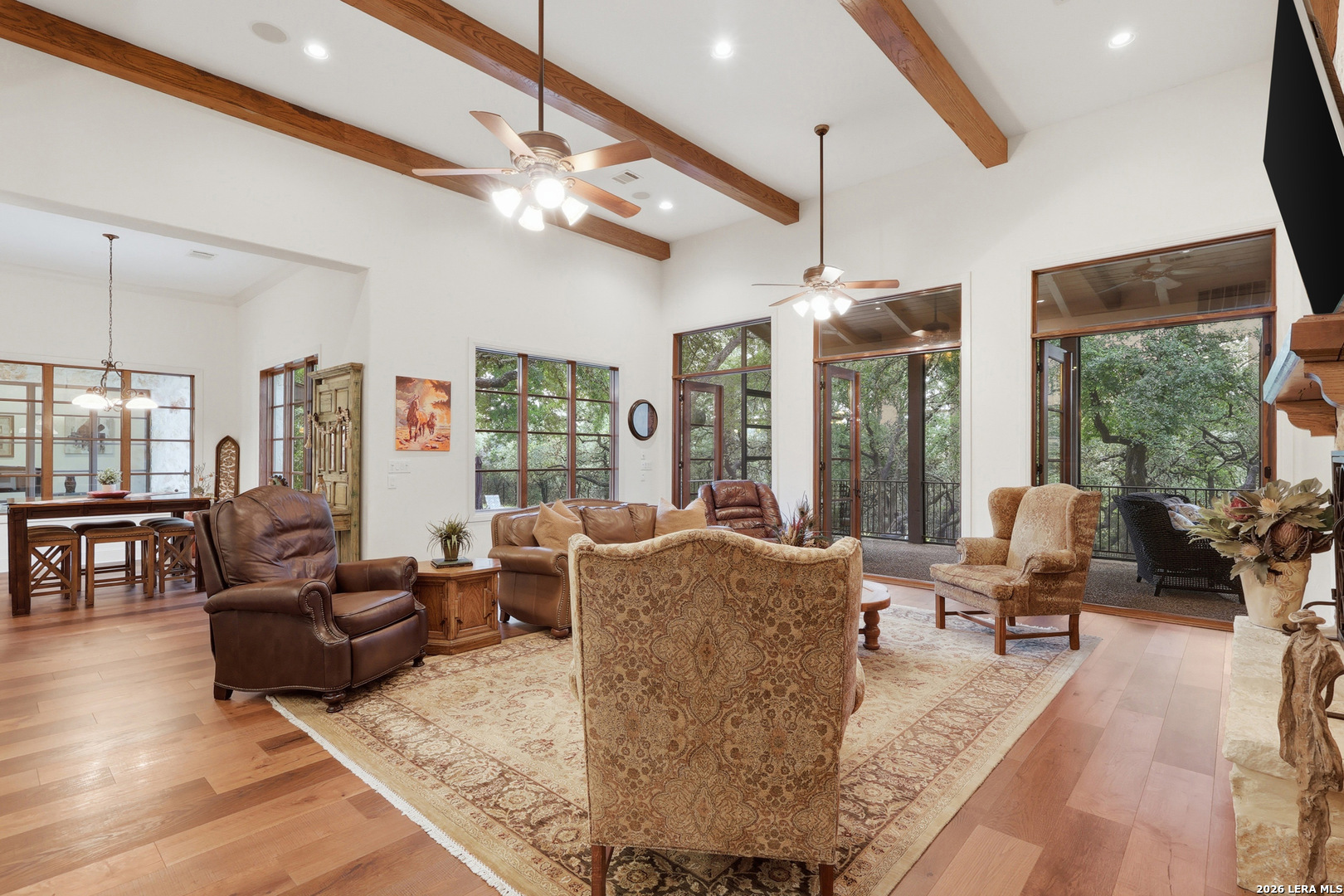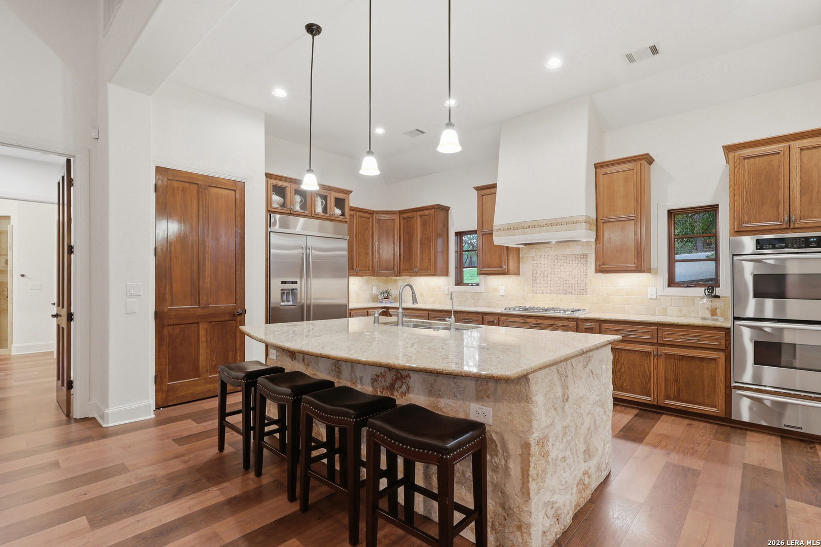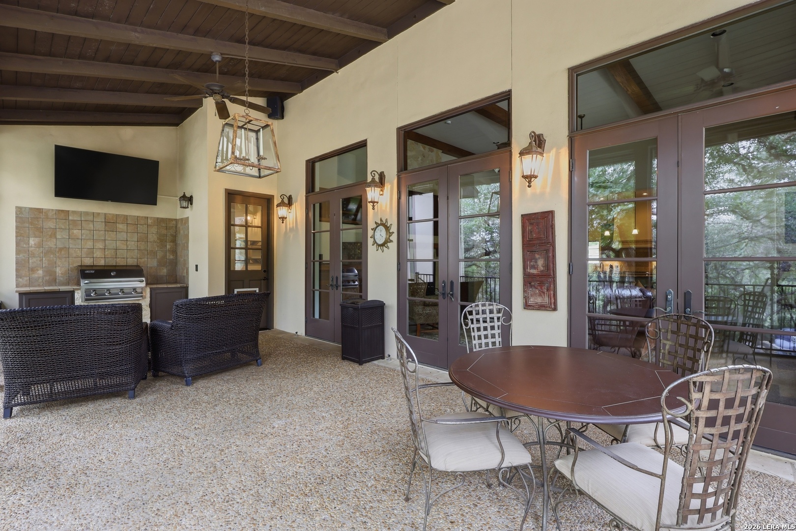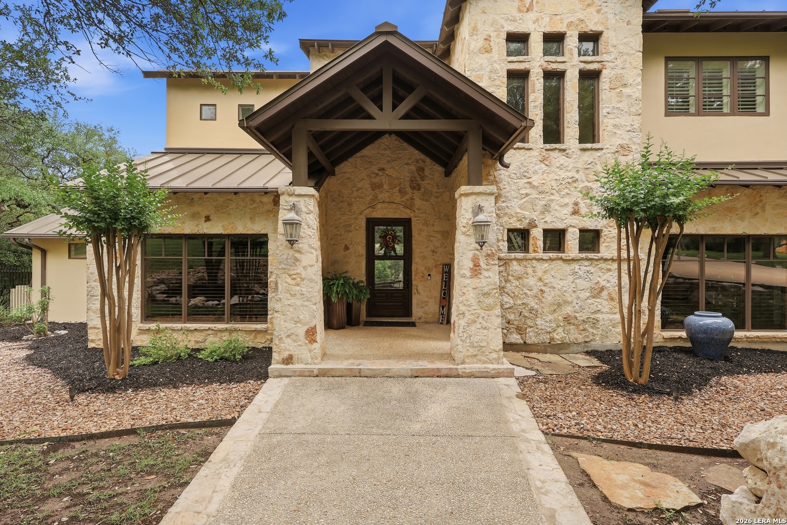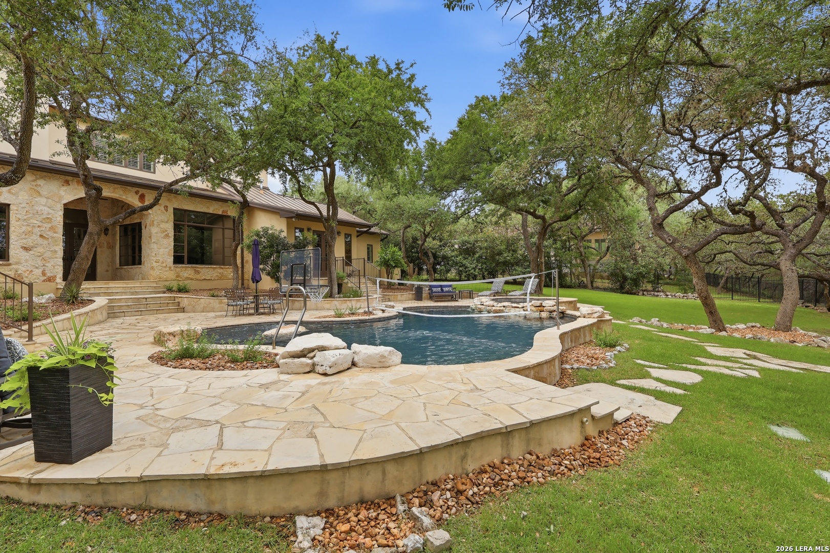 Open house Sunday May 3 from 2-4 pm. Experience refined Hill Country living in this extraordinary 5,692-square-foot estate, ideally situated within the prestigious Champions Ridge community. Set on a private, park-like homesite backing to acres of protected woodlands, this remarkable residence offers an exceptional blend of timeless architecture, modern luxury, and serene natural beauty. Designed with both elegance and functionality in mind, the home features five spacious bedrooms, each with its own en-suite bath and walk-in closet, along with a versatile sixth flex room. Two well-appointed bedroom suites are located on the main level, providing convenience and flexibility for guests or multigenerational living. The secluded primary suite serves as a true sanctuary, offering spa-inspired amenities including a sunken Jacuzzi tub, expansive walk-in shower, and generous closet space. Private access to the pool and hot tub enhances the resort-style ambiance, while dedicated HVAC and a tankless water heater ensure optimal comfort year-round. Adjacent, a distinguished executive study showcases custom built-in cabinetry and elegant sliding glass and wood doors, creating a sophisticated and private workspace. Thoughtfully designed interiors are filled with natural light, thanks to custom windows that frame picturesque views of the outdoor oasis and surrounding woodlands. Select rooms feature elegant wood shutters, offering both style and privacy. Seamless indoor-outdoor living is achieved through three sets of double outswing doors that open to an entertainer's dream backyard. Here, a sparkling sport pool, mature oak trees with ambient downlighting, a fully equipped outdoor kitchen, and a cozy fire pit create an inviting retreat for gatherings or quiet evenings under the stars. A screened-in porch and wood-beamed ceilings in the family room further enhance the home's warmth and character. At the heart of the home, the expansive chef's kitchen is designed to impress, featuring premium appliances including a Viking cooktop, double ovens with warming drawer, built-in refrigerator, wine fridge, ice maker, dishwasher, and trash compactor. The open-concept layout flows effortlessly into the family room, formal dining area, butler's pantry, and sunlit breakfast nook-perfect for both grand entertaining and intimate daily living. Upstairs, three additional bedrooms and a spacious secondary living area provide ample room for relaxation. The flexible bonus room offers endless possibilities as a sixth bedroom, media room, fitness space, or playroom. Exceptional storage and organization are found throughout, including a well-appointed utility room with built-in cabinetry and counter space, a thoughtfully placed hall tree at the side entrance, a large walk-in attic, two additional pull-down attic spaces, and a main-level storage closet. Modern conveniences include a whole-home Sonos sound system, both indoors and out, as well as a hardwired security system for peace of mind. Residents of Champions Ridge enjoy exclusive access to a 31-acre nature preserve with scenic hiking trails, a 24-hour guarded gate, and premier amenities including tennis, pickleball, and sport courts-all set within a tranquil, park-like environment. This is a rare opportunity to own a truly exceptional estate where luxury, privacy, and natural beauty converge.