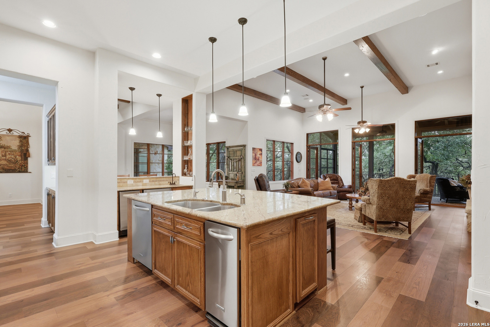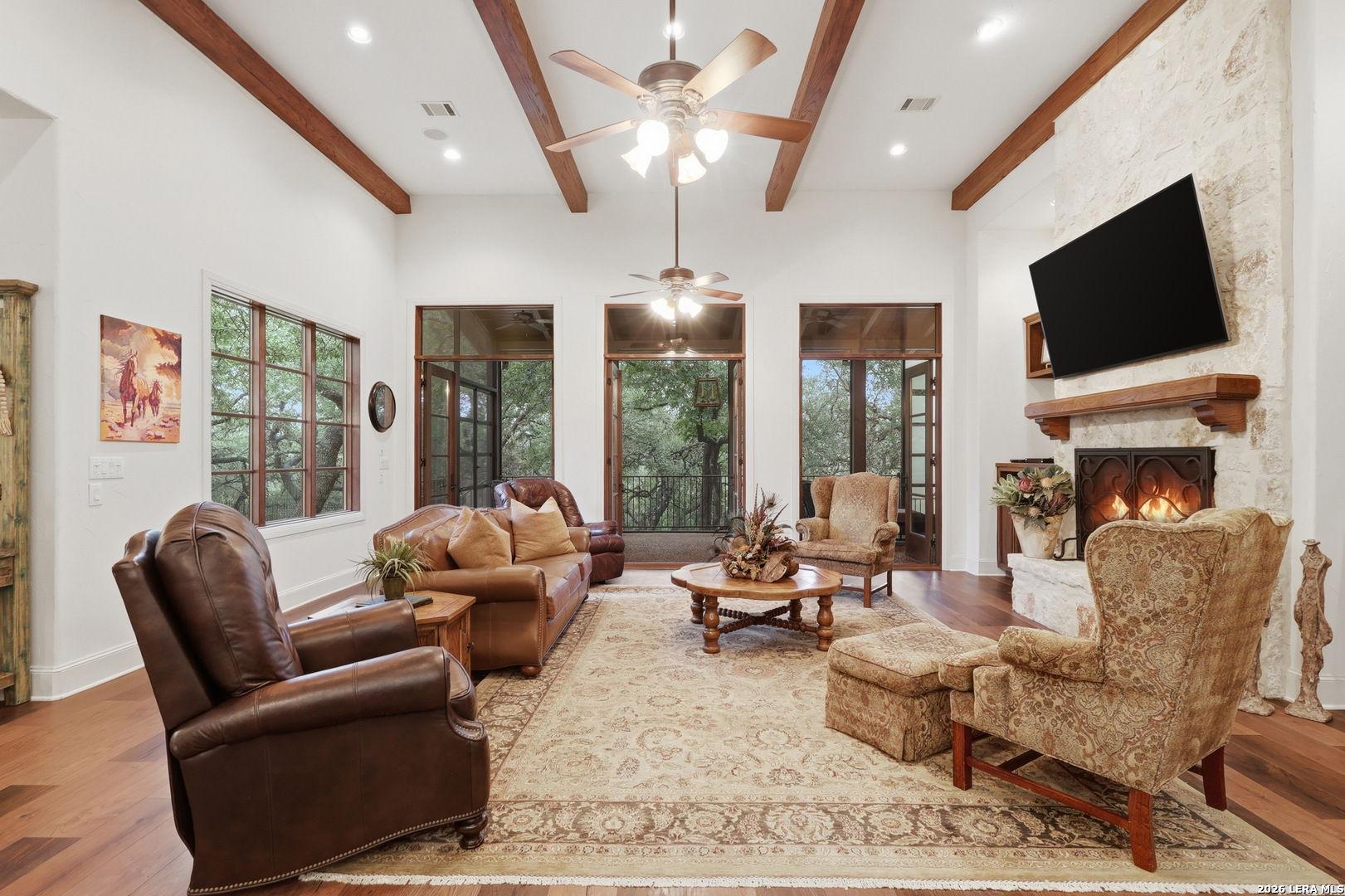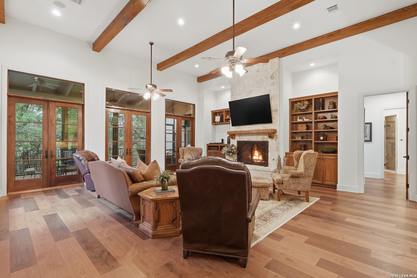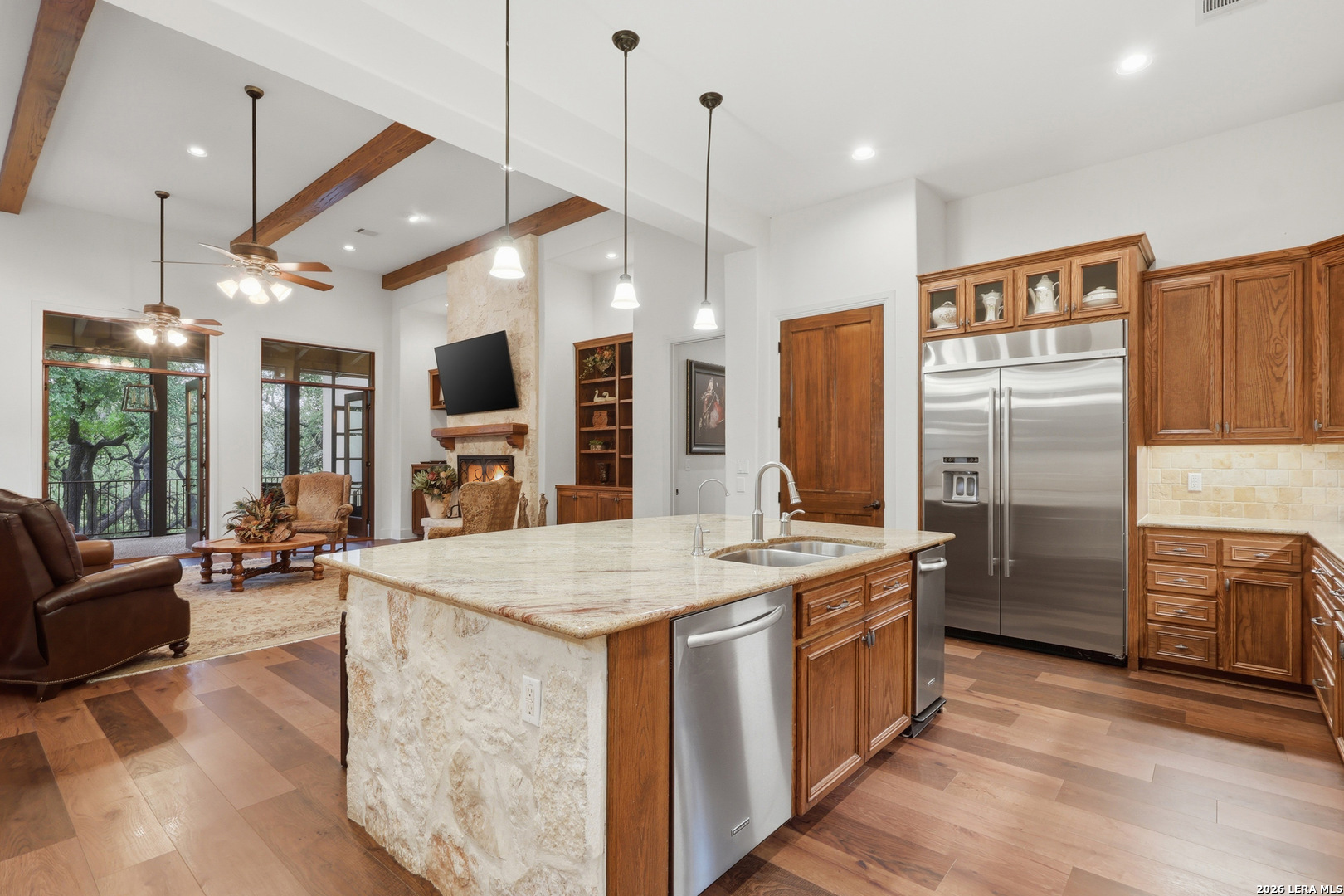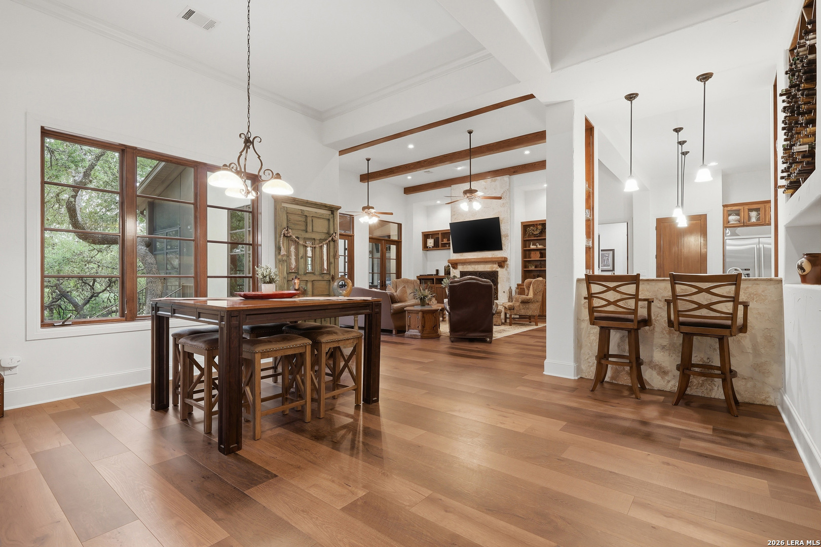 Open house Sunday May 3 from 2-4 pm. Experience refined Hill Country living in this extraordinary 5,692-square-foot estate, ideally situated within the prestigious Champions Ridge community. Set on a private, park-like homesite backing to acres of protected woodlands, this remarkable residence offers an exceptional blend of timeless architecture, modern luxury, and serene natural beauty. Designed with both elegance and functionality in mind, the home features five spacious bedrooms, each with its own en-suite bath and walk-in closet, along with a versatile sixth flex room. Two well-appointed bedroom suites are located on the main level, providing convenience and flexibility for guests or multigenerational living. The secluded primary suite serves as a true sanctuary, offering spa-inspired amenities including a sunken Jacuzzi tub, expansive walk-in shower, and generous closet space. Private access to the pool and hot tub enhances the resort-style ambiance, while dedicated HVAC and a tankless water heater ensure optimal comfort year-round. Adjacent, a distinguished executive study showcases custom built-in cabinetry and elegant sliding glass and wood doors, creating a sophisticated and private workspace. Thoughtfully designed interiors are filled with natural light, thanks to custom windows that frame picturesque views of the outdoor oasis and surrounding woodlands. Select rooms feature elegant wood shutters, offering both style and privacy. Seamless indoor-outdoor living is achieved through three sets of double outswing doors that open to an entertainer's dream backyard. Here, a sparkling sport pool, mature oak trees with ambient downlighting, a fully equipped outdoor kitchen, and a cozy fire pit create an inviting retreat for gatherings or quiet evenings under the stars. A screened-in porch and wood-beamed ceilings in the family room further enhance the home's warmth and character. At the heart of the home, the expansive chef's kitchen is designed to impress, featuring premium appliances including a Viking cooktop, double ovens with warming drawer, built-in refrigerator, wine fridge, ice maker, dishwasher, and trash compactor. The open-concept layout flows effortlessly into the family room, formal dining area, butler's pantry, and sunlit breakfast nook-perfect for both grand entertaining and intimate daily living. Upstairs, three additional bedrooms and a spacious secondary living area provide ample room for relaxation. The flexible bonus room offers endless possibilities as a sixth bedroom, media room, fitness space, or playroom. Exceptional storage and organization are found throughout, including a well-appointed utility room with built-in cabinetry and counter space, a thoughtfully placed hall tree at the side entrance, a large walk-in attic, two additional pull-down attic spaces, and a main-level storage closet. Modern conveniences include a whole-home Sonos sound system, both indoors and out, as well as a hardwired security system for peace of mind. Residents of Champions Ridge enjoy exclusive access to a 31-acre nature preserve with scenic hiking trails, a 24-hour guarded gate, and premier amenities including tennis, pickleball, and sport courts-all set within a tranquil, park-like environment. This is a rare opportunity to own a truly exceptional estate where luxury, privacy, and natural beauty converge.