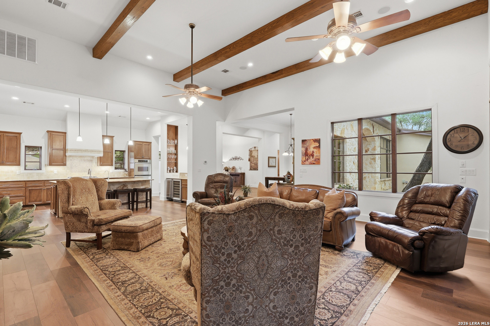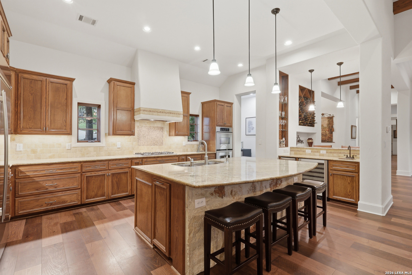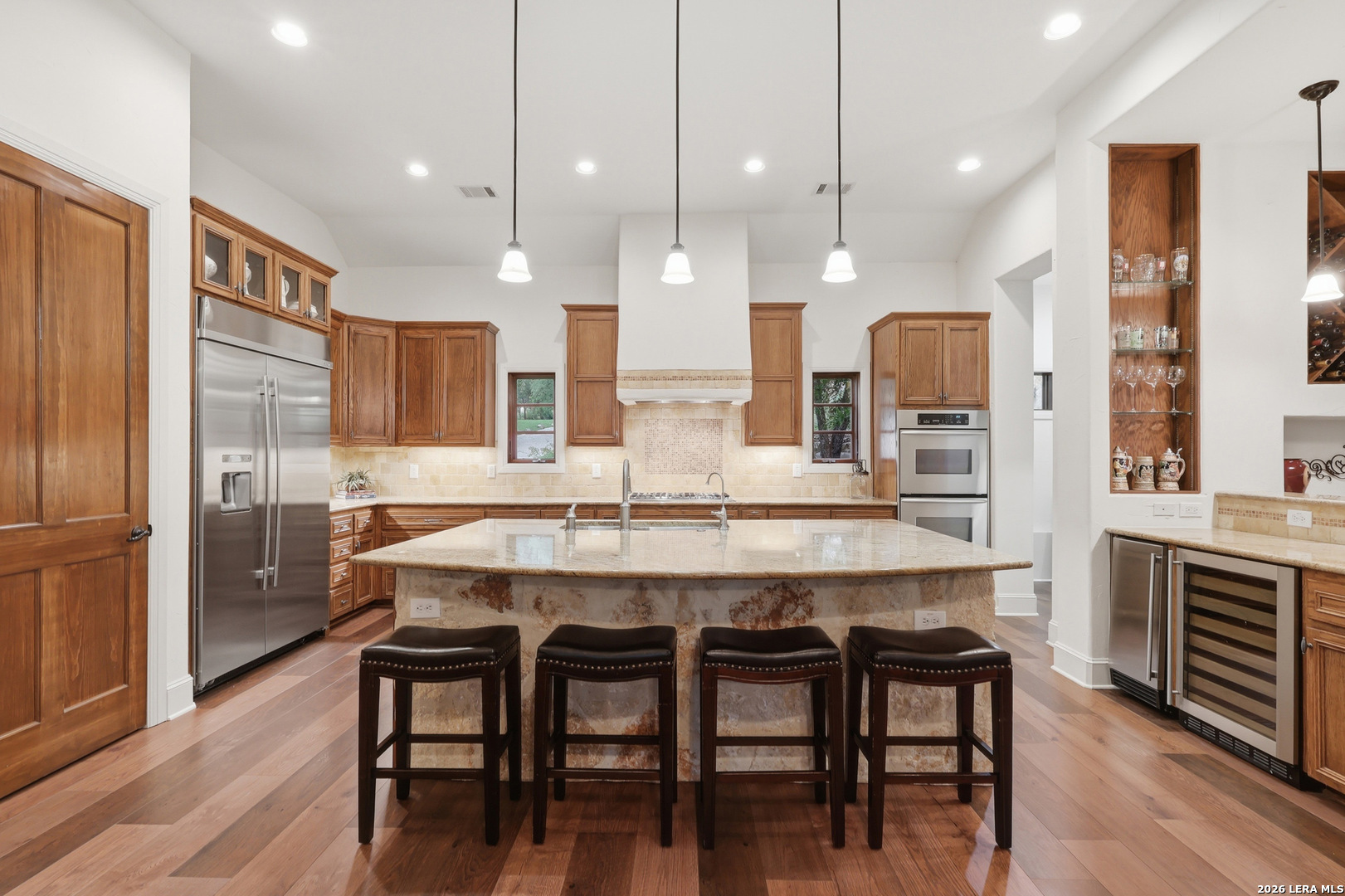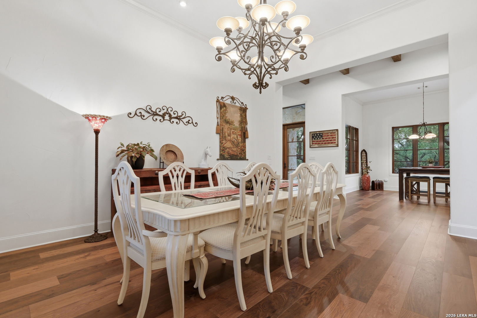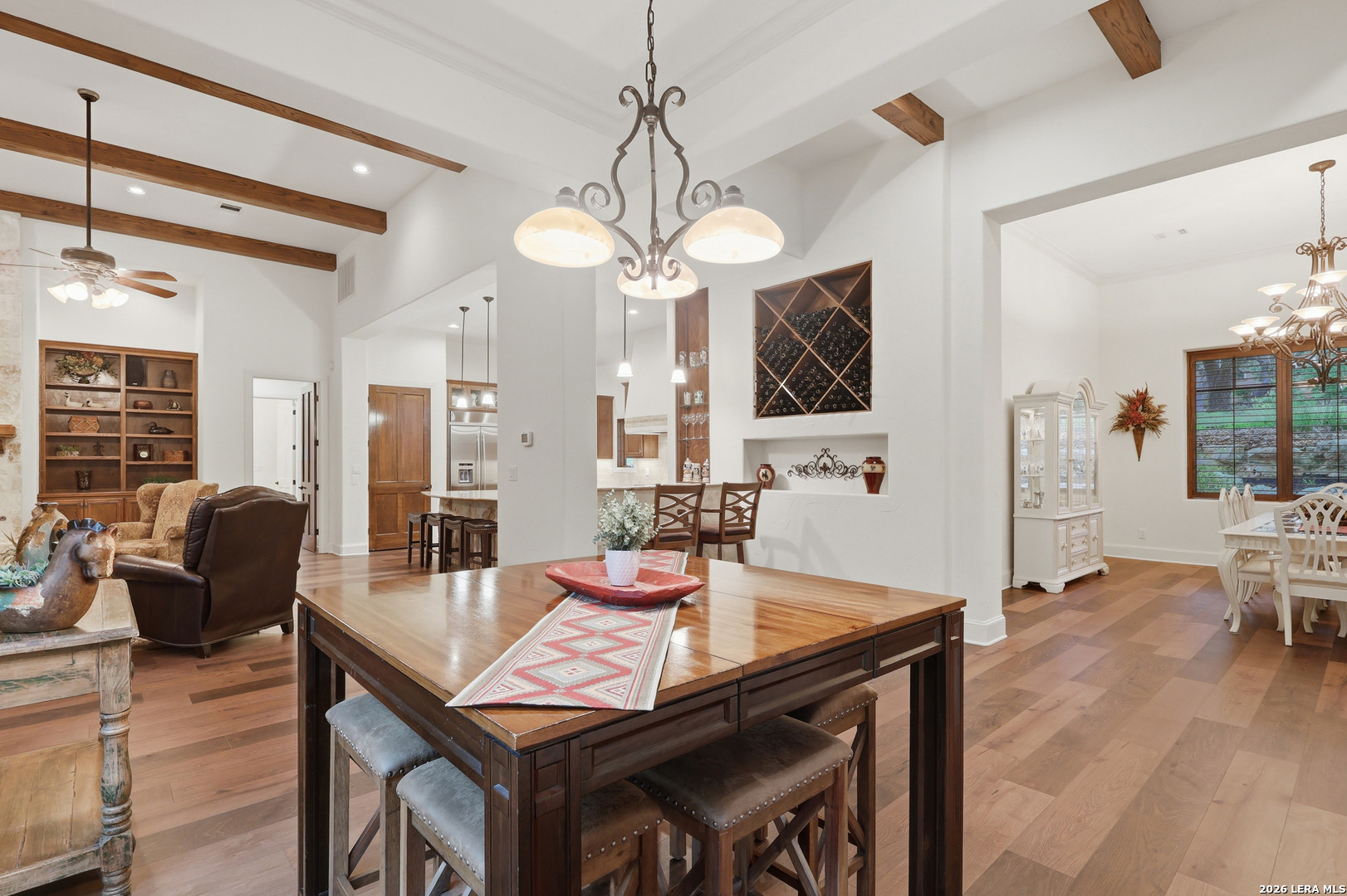 Open house Sunday May 3 from 2-4 pm. Experience refined Hill Country living in this extraordinary 5,692-square-foot estate, ideally situated within the prestigious Champions Ridge community. Set on a private, park-like homesite backing to acres of protected woodlands, this remarkable residence offers an exceptional blend of timeless architecture, modern luxury, and serene natural beauty. Designed with both elegance and functionality in mind, the home features five spacious bedrooms, each with its own en-suite bath and walk-in closet, along with a versatile sixth flex room. Two well-appointed bedroom suites are located on the main level, providing convenience and flexibility for guests or multigenerational living. The secluded primary suite serves as a true sanctuary, offering spa-inspired amenities including a sunken Jacuzzi tub, expansive walk-in shower, and generous closet space. Private access to the pool and hot tub enhances the resort-style ambiance, while dedicated HVAC and a tankless water heater ensure optimal comfort year-round. Adjacent, a distinguished executive study showcases custom built-in cabinetry and elegant sliding glass and wood doors, creating a sophisticated and private workspace. Thoughtfully designed interiors are filled with natural light, thanks to custom windows that frame picturesque views of the outdoor oasis and surrounding woodlands. Select rooms feature elegant wood shutters, offering both style and privacy. Seamless indoor-outdoor living is achieved through three sets of double outswing doors that open to an entertainer's dream backyard. Here, a sparkling sport pool, mature oak trees with ambient downlighting, a fully equipped outdoor kitchen, and a cozy fire pit create an inviting retreat for gatherings or quiet evenings under the stars. A screened-in porch and wood-beamed ceilings in the family room further enhance the home's warmth and character. At the heart of the home, the expansive chef's kitchen is designed to impress, featuring premium appliances including a Viking cooktop, double ovens with warming drawer, built-in refrigerator, wine fridge, ice maker, dishwasher, and trash compactor. The open-concept layout flows effortlessly into the family room, formal dining area, butler's pantry, and sunlit breakfast nook-perfect for both grand entertaining and intimate daily living. Upstairs, three additional bedrooms and a spacious secondary living area provide ample room for relaxation. The flexible bonus room offers endless possibilities as a sixth bedroom, media room, fitness space, or playroom. Exceptional storage and organization are found throughout, including a well-appointed utility room with built-in cabinetry and counter space, a thoughtfully placed hall tree at the side entrance, a large walk-in attic, two additional pull-down attic spaces, and a main-level storage closet. Modern conveniences include a whole-home Sonos sound system, both indoors and out, as well as a hardwired security system for peace of mind. Residents of Champions Ridge enjoy exclusive access to a 31-acre nature preserve with scenic hiking trails, a 24-hour guarded gate, and premier amenities including tennis, pickleball, and sport courts-all set within a tranquil, park-like environment. This is a rare opportunity to own a truly exceptional estate where luxury, privacy, and natural beauty converge.