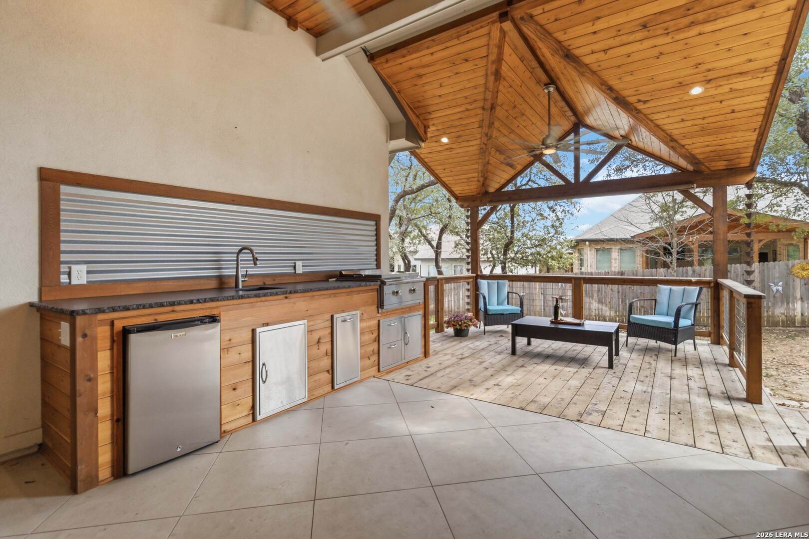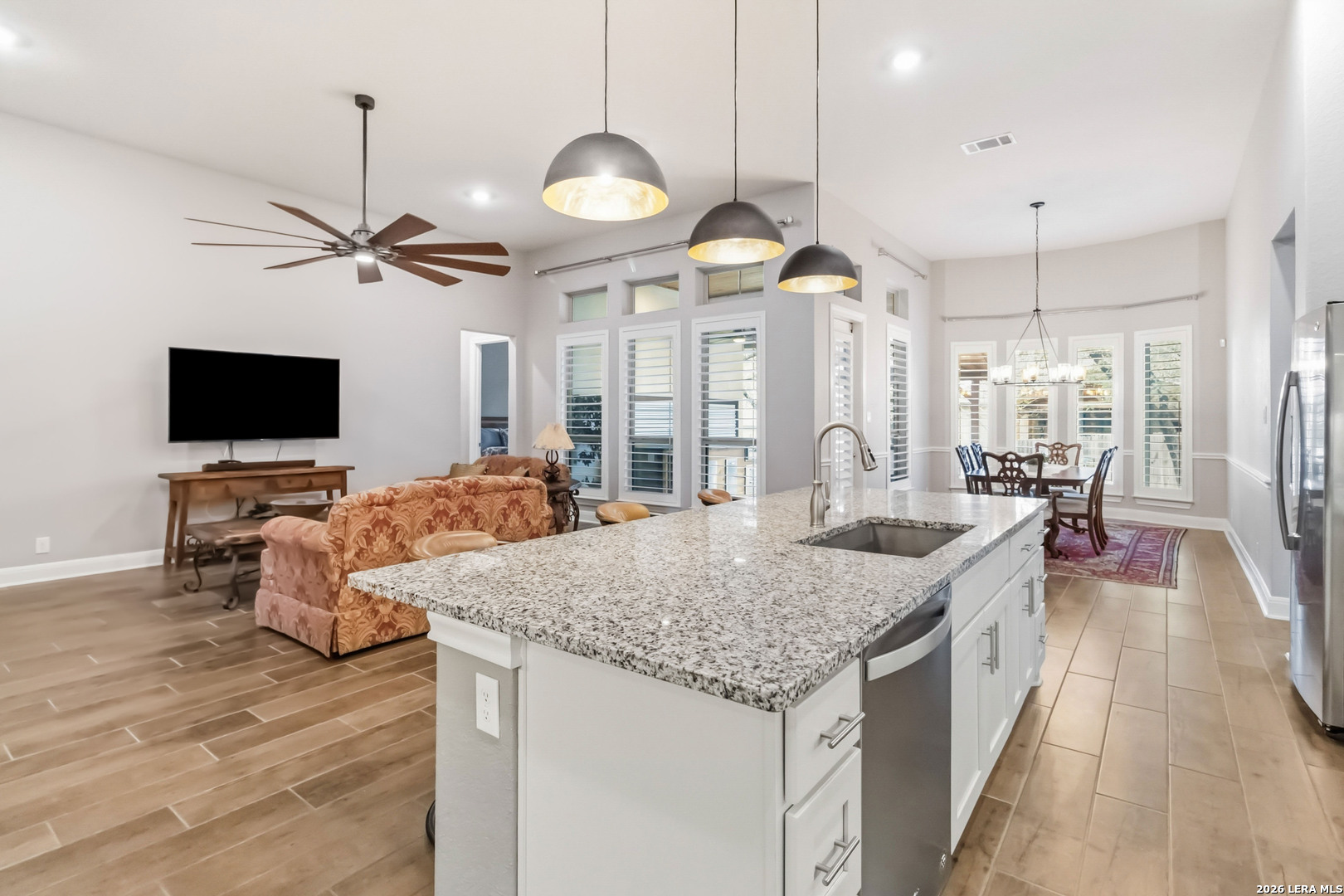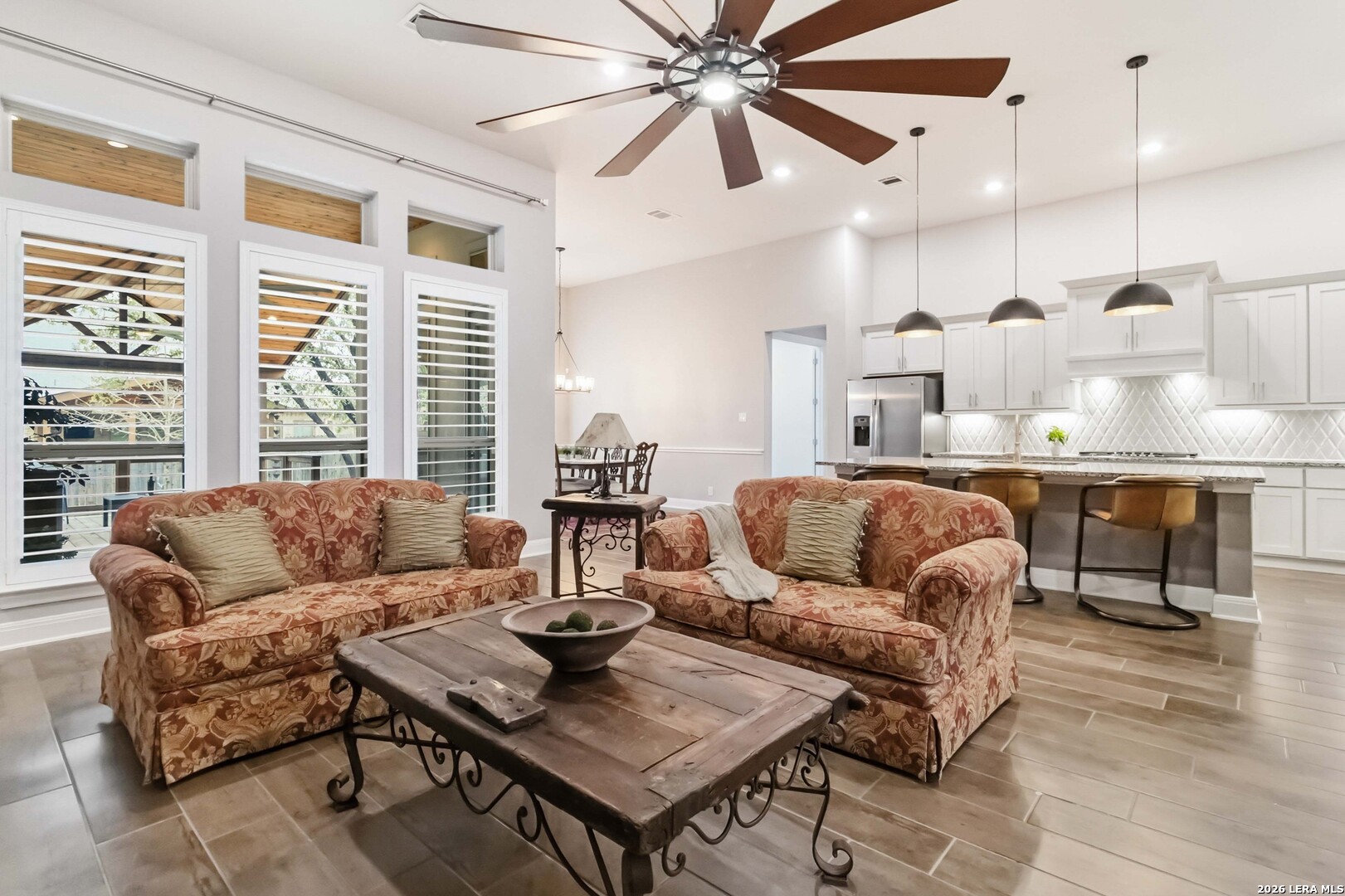 Luxurious One-Story Living in the Gated Community of Fallbrook | Tucked inside the gated community of Fallbrook, this beautifully appointed one-story home offers the rare combination of comfort, flexibility, and effortless living. With nearly 2,900 square feet of thoughtfully designed, step-free space, the layout easily adapts to a variety of lifestyles, whether you're hosting a full house, welcoming extended family, or simply enjoying the ease of single-level living in a peaceful, well-connected neighborhood. | From the moment you enter, soaring ten-foot ceilings and an open, flowing floor plan create an inviting sense of space and connection. The kitchen sits at the heart of the home, featuring a large gathering island, granite countertops, double ovens, gas cooktop, and elegant 42" cabinetry. It is perfectly designed for both everyday living and effortless entertaining. | The thoughtfully arranged layout offers flexibility for a variety of lifestyles. Two secondary bedrooms share a convenient Jack-and-Jill bath, while a third secondary bedroom sits privately down its own hallway with a nearby full bath, an ideal setup for guests, extended family, or a quiet home office. The spacious theater room adds even more versatility and easily adapts as a fifth bedroom, game room, hobby space, or executive office. | Storage is exceptional throughout the home, including walk-in closets in every bedroom and a uniquely upgraded attic space above the oversized three-car garage, complete with lighting, air conditioning, and motorized retractable stairs for easy access. | Step outside to a peaceful backyard retreat where a covered patio with a cedar-plank ceiling and outdoor kitchen invites relaxed evenings and weekend gatherings among the mature shade trees. | Fallbrook residents enjoy gated privacy, sidewalks throughout the neighborhood, and community amenities including a lagoon-style pool and park nearby. The location is equally appealing, conveniently situated just off I-10 with quick access to The Rim, La Cantera, Boerne, and the beauty of the Texas Hill Country. | This is the rare home that combines luxury, flexibility, and everyday livability, all on one level.