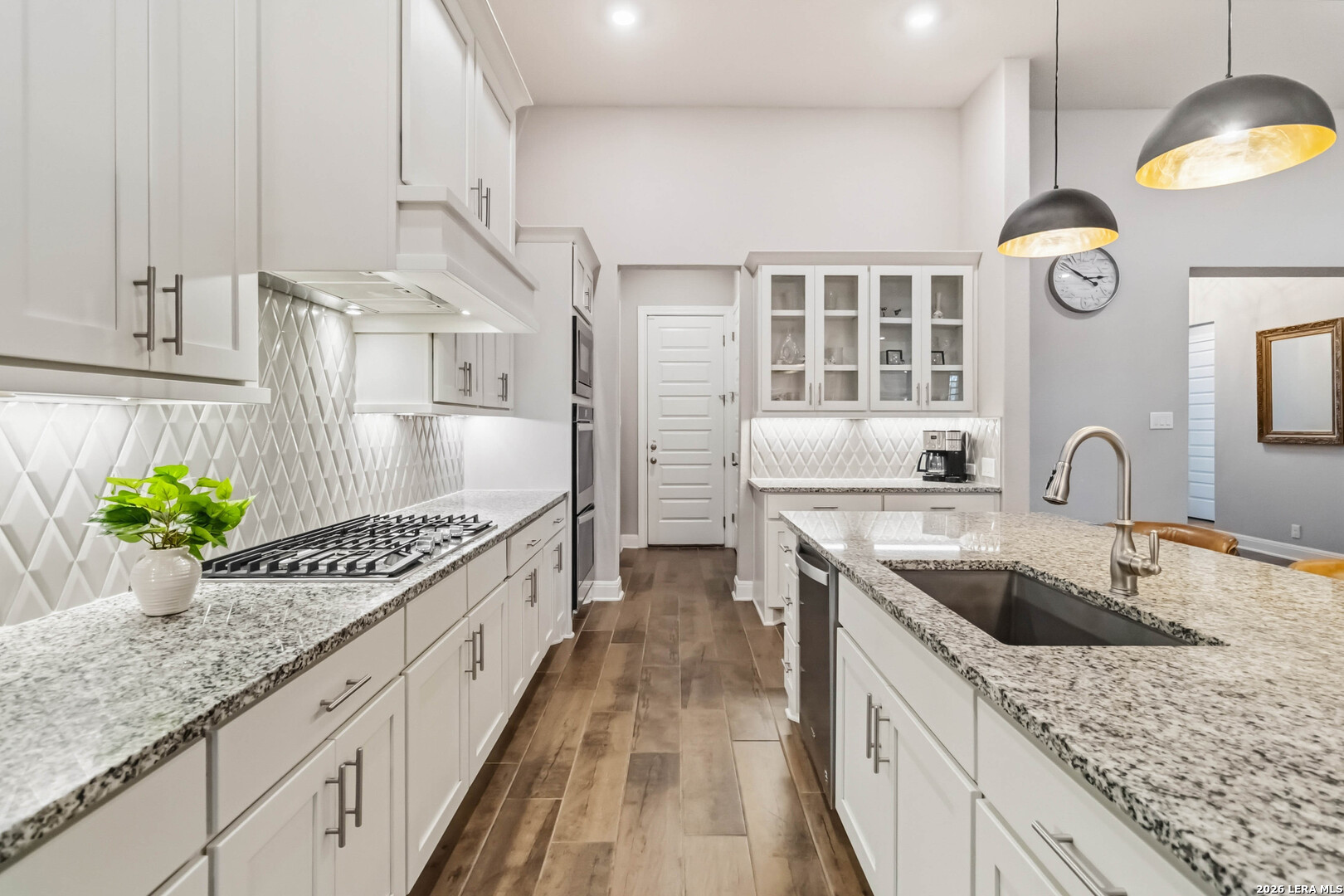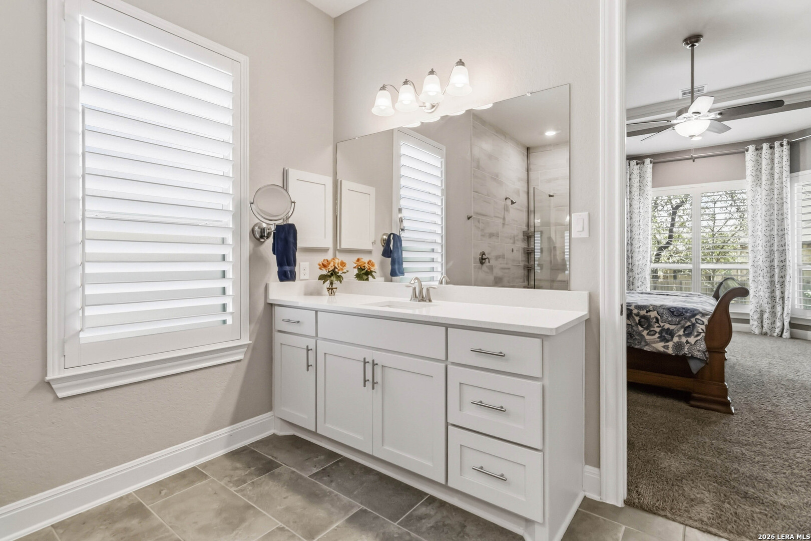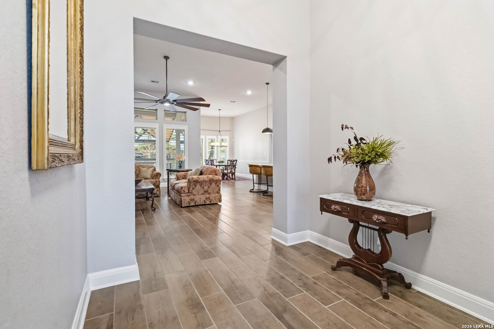 Luxurious One-Story Living in the Gated Community of Fallbrook | Tucked inside the gated community of Fallbrook, this beautifully appointed one-story home offers the rare combination of comfort, flexibility, and effortless living. With nearly 2,900 square feet of thoughtfully designed, step-free space, the layout easily adapts to a variety of lifestyles, whether you're hosting a full house, welcoming extended family, or simply enjoying the ease of single-level living in a peaceful, well-connected neighborhood. | From the moment you enter, soaring ten-foot ceilings and an open, flowing floor plan create an inviting sense of space and connection. The kitchen sits at the heart of the home, featuring a large gathering island, granite countertops, double ovens, gas cooktop, and elegant 42" cabinetry. It is perfectly designed for both everyday living and effortless entertaining. | The thoughtfully arranged layout offers flexibility for a variety of lifestyles. Two secondary bedrooms share a convenient Jack-and-Jill bath, while a third secondary bedroom sits privately down its own hallway with a nearby full bath, an ideal setup for guests, extended family, or a quiet home office. The spacious theater room adds even more versatility and easily adapts as a fifth bedroom, game room, hobby space, or executive office. | Storage is exceptional throughout the home, including walk-in closets in every bedroom and a uniquely upgraded attic space above the oversized three-car garage, complete with lighting, air conditioning, and motorized retractable stairs for easy access. | Step outside to a peaceful backyard retreat where a covered patio with a cedar-plank ceiling and outdoor kitchen invites relaxed evenings and weekend gatherings among the mature shade trees. | Fallbrook residents enjoy gated privacy, sidewalks throughout the neighborhood, and community amenities including a lagoon-style pool and park nearby. The location is equally appealing, conveniently situated just off I-10 with quick access to The Rim, La Cantera, Boerne, and the beauty of the Texas Hill Country. | This is the rare home that combines luxury, flexibility, and everyday livability, all on one level.