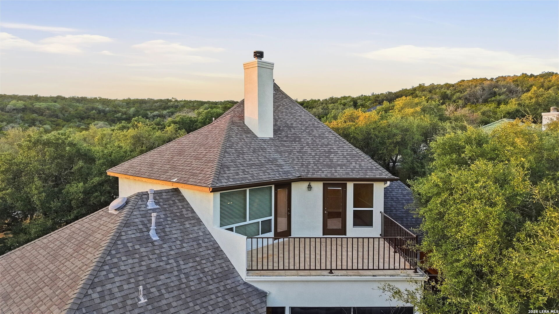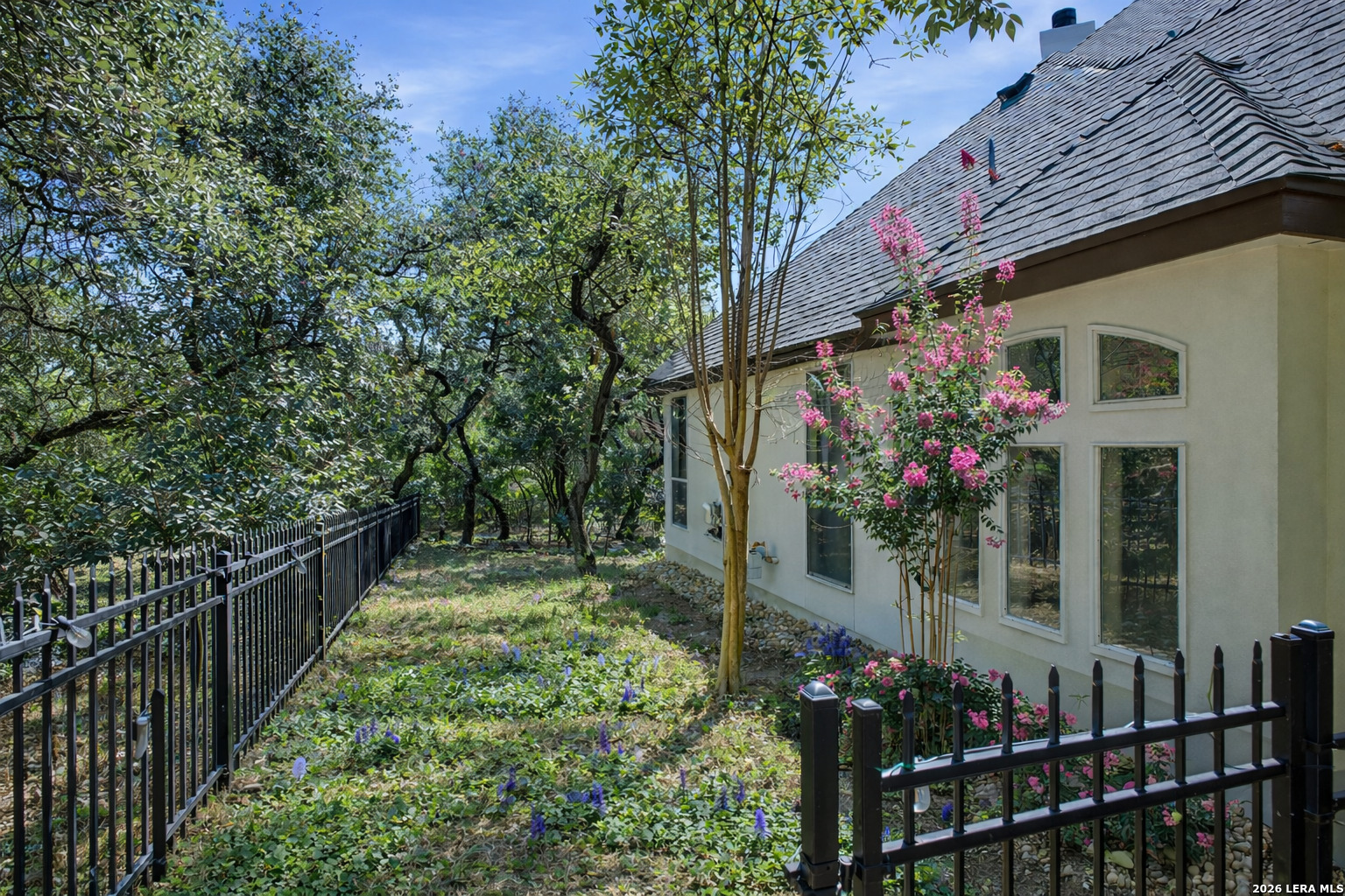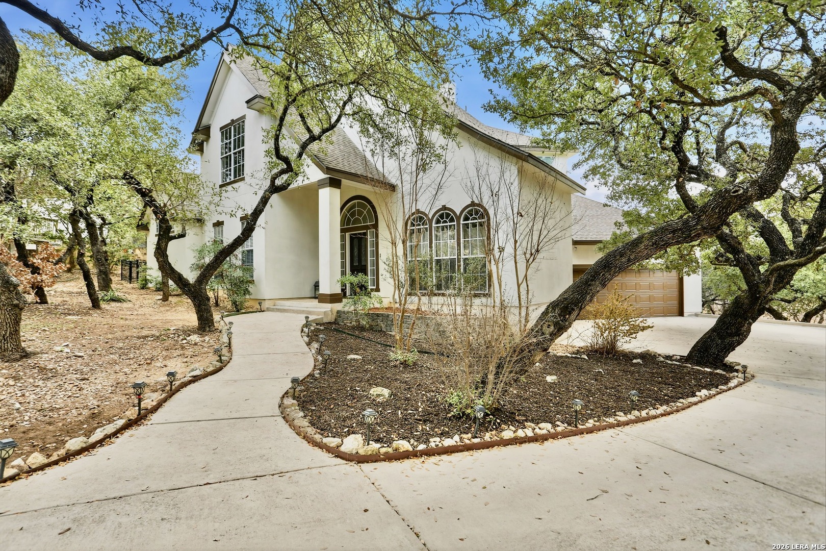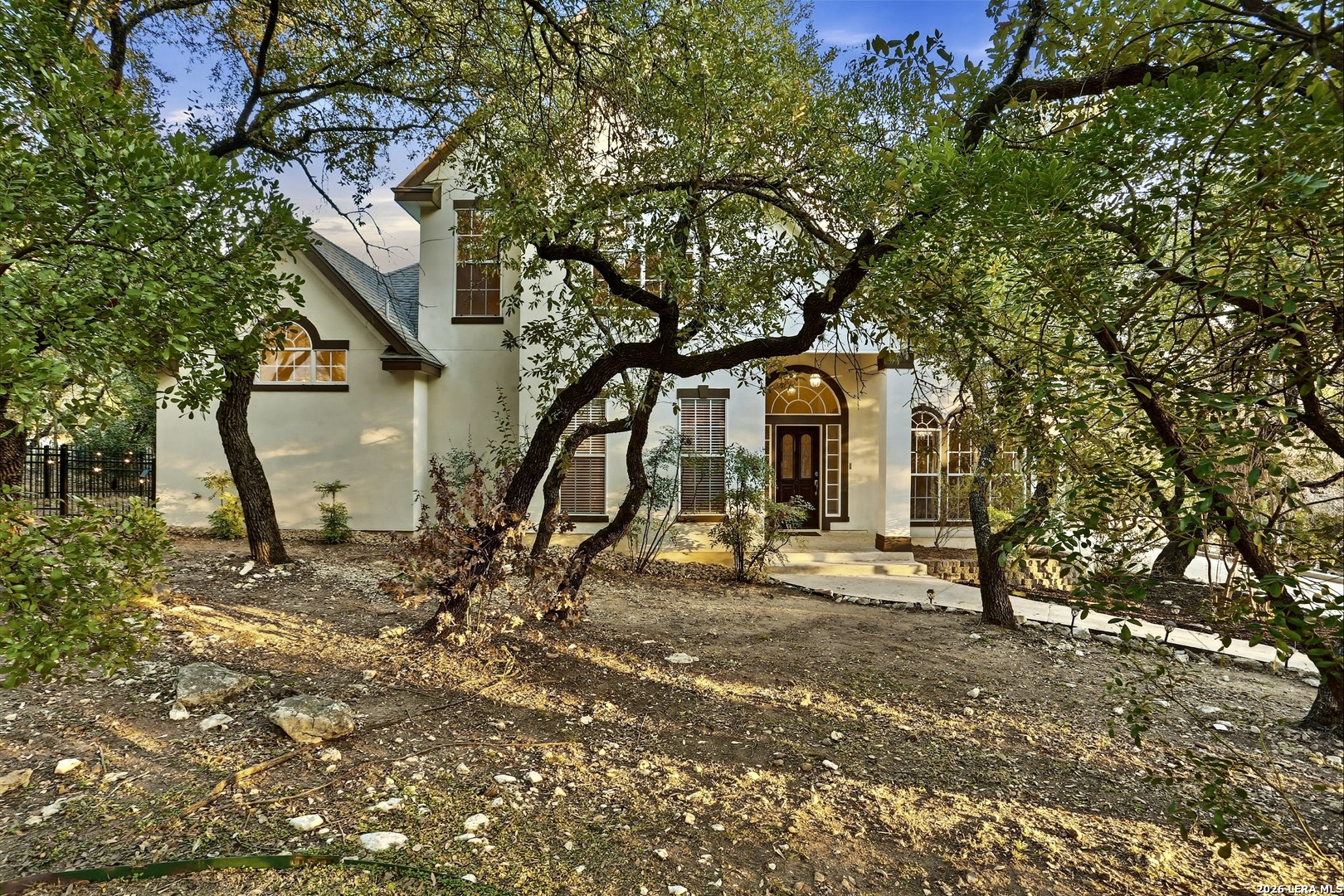 Heaven in the Hills! This stunning William Hirsch custom home sits on a private, partially wooded golf course lot in Cedar Creek Estates-just under 1/2 acre with no city taxes. One of the rare golf course properties with a fenced backyard, the low wrought-iron fence provides security without compromising sweeping fairway views near the green. Mature oak trees create a serene, resort-like setting. A dramatic two-story entry with soaring ceilings and elegant archways makes a striking first impression. Just off the entry, a flexible formal dining room easily serves as a private study-ideal for today's lifestyle. The spacious kitchen is designed for both everyday living and entertaining, featuring designer distressed cabinetry, under-cabinet lighting, a cooktop island, new GE appliances, and a WiFi-enabled oven with Air Fryer. An open-concept serving bar connects seamlessly to the living area while maintaining a sense of separation and sophistication. Outdoor living truly shines with a screened-in sunroom-complete with ceiling fan and electrical-opening to a flagstone patio with a jasmine-covered arbor. Just off the primary suite, a tranquil fountain creates a private retreat, perfect for quiet mornings or evening relaxation. Upstairs, a second-story terrace offers breathtaking panoramic Hill Country and golf course views, with private access from both guest suites. The luxurious primary suite features rare tigerwood flooring, an inlaid ceiling, and a spa-inspired bath with a Jacuzzi tub, dramatic windows, and custom cabinetry. The oversized, light-filled closet includes double-sided built-ins and a full window. Additional highlights include recently refreshed interior and exterior paint throughout, updated fixtures, designer granite countertops, upgraded sinks, and designer faucets in the kitchen and bathrooms, a spacious laundry room with generous storage and functional workspace, a wood-burning fireplace with gas starter, abundant storage throughout, and an oversized garage with workshop area, backyard access, and WiFi-enabled opener. An in-wall fingerprint/key safe adds an extra layer of security. Upstairs also offers two generously sized guest suites and a versatile flex room-ideal as a game room, media room, or office. New roof installed in 2020. Exceptional privacy, timeless design, and modern smart-home features-this is Hill Country living at its finest.