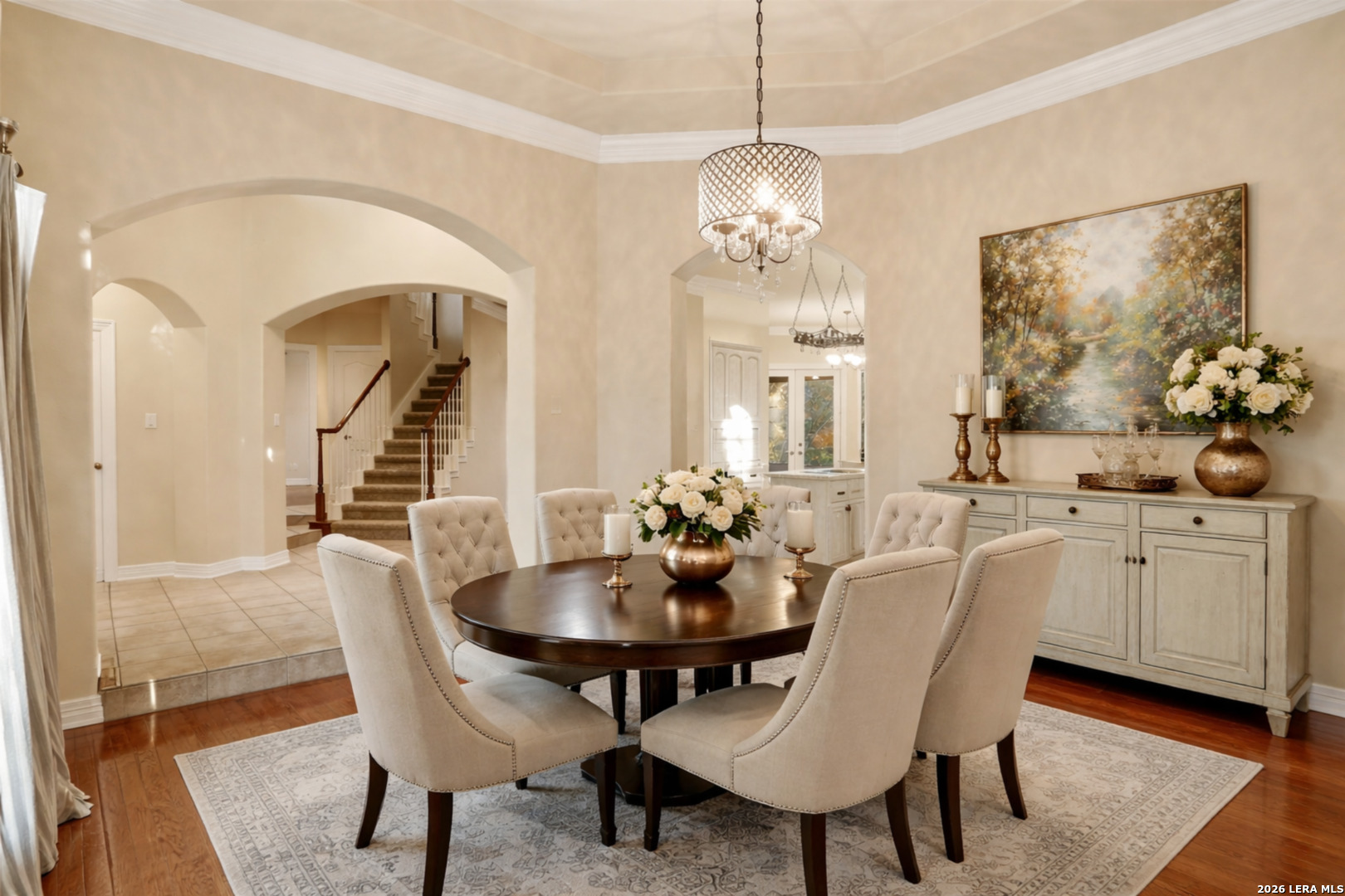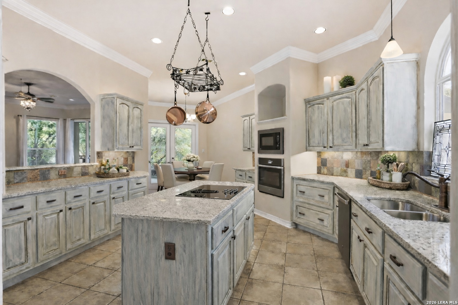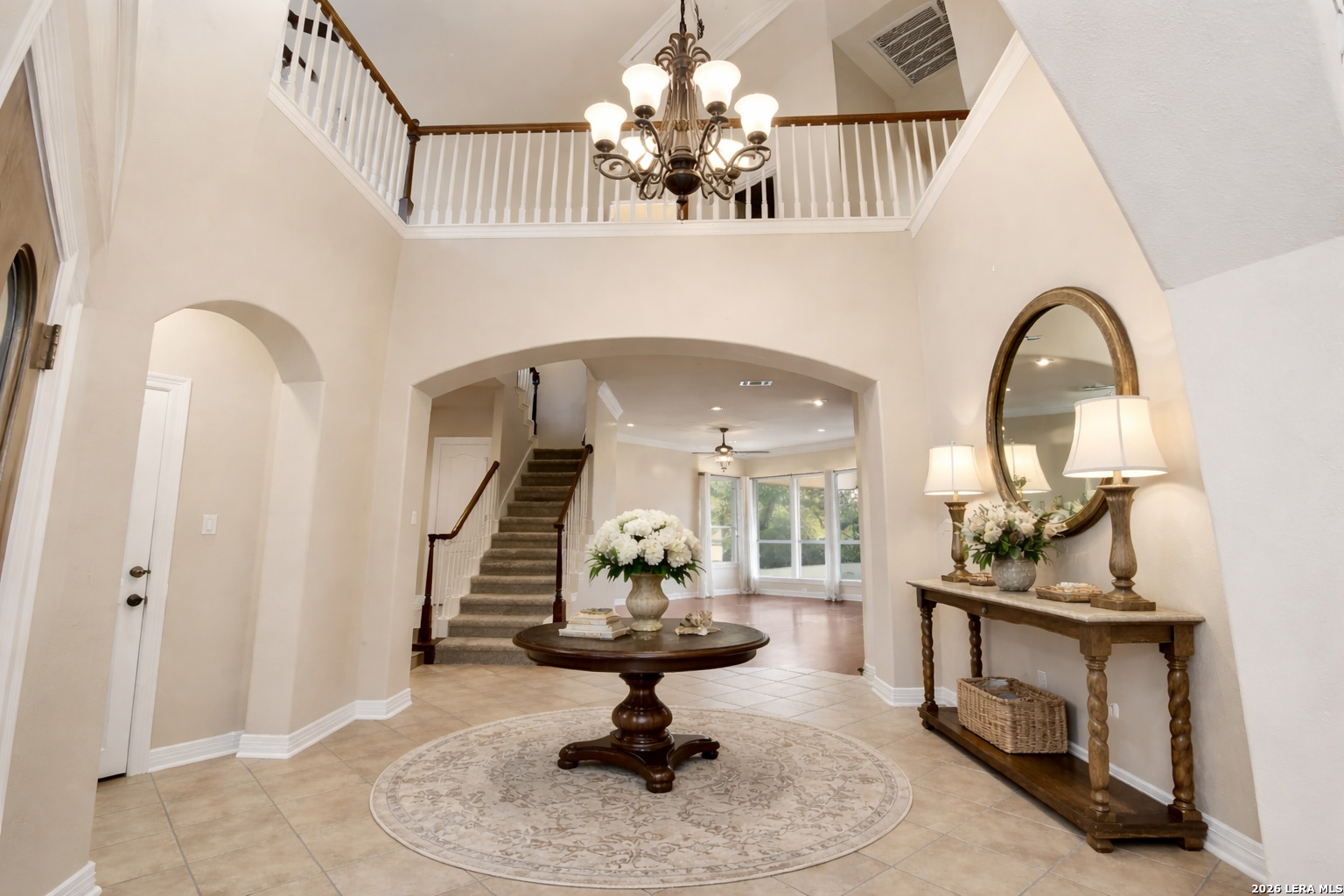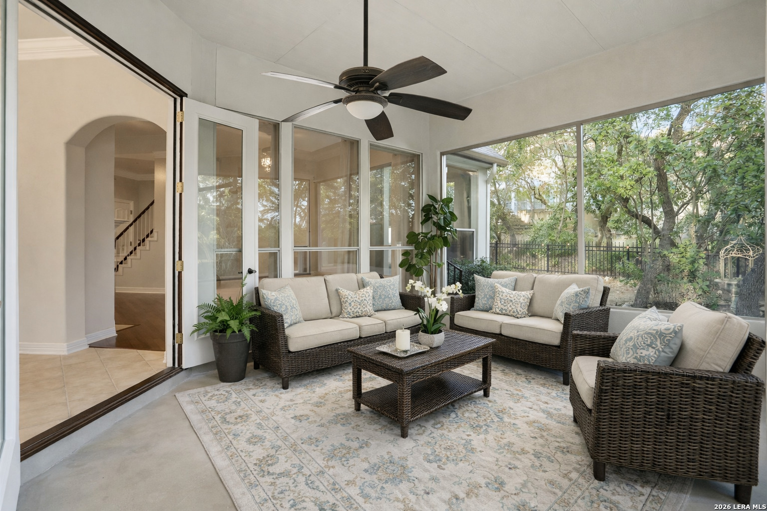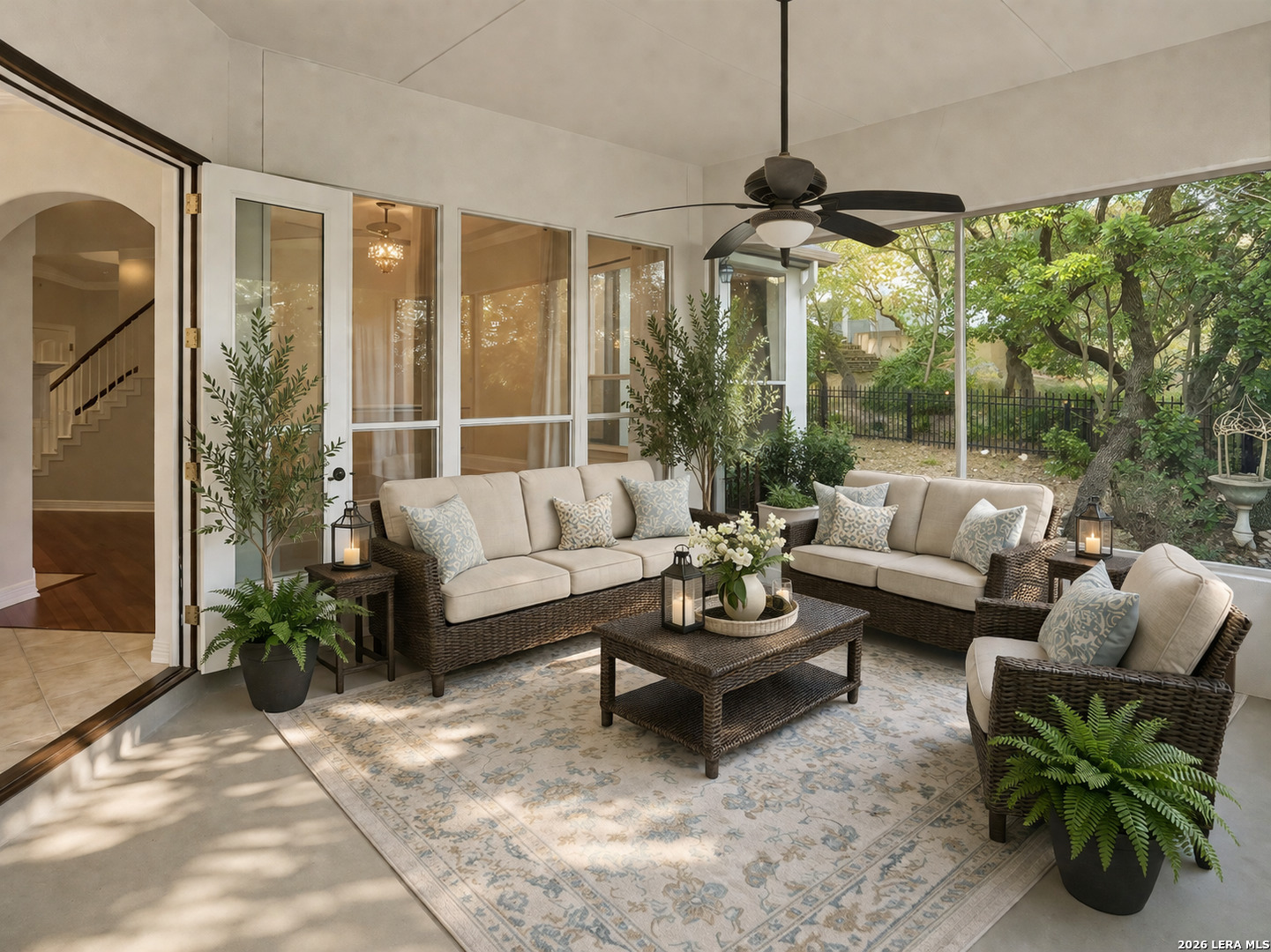 Heaven in the Hills! This stunning William Hirsch custom home sits on a private, partially wooded golf course lot in Cedar Creek Estates-just under 1/2 acre with no city taxes. One of the rare golf course properties with a fenced backyard, the low wrought-iron fence provides security without compromising sweeping fairway views near the green. Mature oak trees create a serene, resort-like setting. A dramatic two-story entry with soaring ceilings and elegant archways makes a striking first impression. Just off the entry, a flexible formal dining room easily serves as a private study-ideal for today's lifestyle. The spacious kitchen is designed for both everyday living and entertaining, featuring designer distressed cabinetry, under-cabinet lighting, a cooktop island, new GE appliances, and a WiFi-enabled oven with Air Fryer. An open-concept serving bar connects seamlessly to the living area while maintaining a sense of separation and sophistication. Outdoor living truly shines with a screened-in sunroom-complete with ceiling fan and electrical-opening to a flagstone patio with a jasmine-covered arbor. Just off the primary suite, a tranquil fountain creates a private retreat, perfect for quiet mornings or evening relaxation. Upstairs, a second-story terrace offers breathtaking panoramic Hill Country and golf course views, with private access from both guest suites. The luxurious primary suite features rare tigerwood flooring, an inlaid ceiling, and a spa-inspired bath with a Jacuzzi tub, dramatic windows, and custom cabinetry. The oversized, light-filled closet includes double-sided built-ins and a full window. Additional highlights include recently refreshed interior and exterior paint throughout, updated fixtures, designer granite countertops, upgraded sinks, and designer faucets in the kitchen and bathrooms, a spacious laundry room with generous storage and functional workspace, a wood-burning fireplace with gas starter, abundant storage throughout, and an oversized garage with workshop area, backyard access, and WiFi-enabled opener. An in-wall fingerprint/key safe adds an extra layer of security. Upstairs also offers two generously sized guest suites and a versatile flex room-ideal as a game room, media room, or office. New roof installed in 2020. Exceptional privacy, timeless design, and modern smart-home features-this is Hill Country living at its finest.