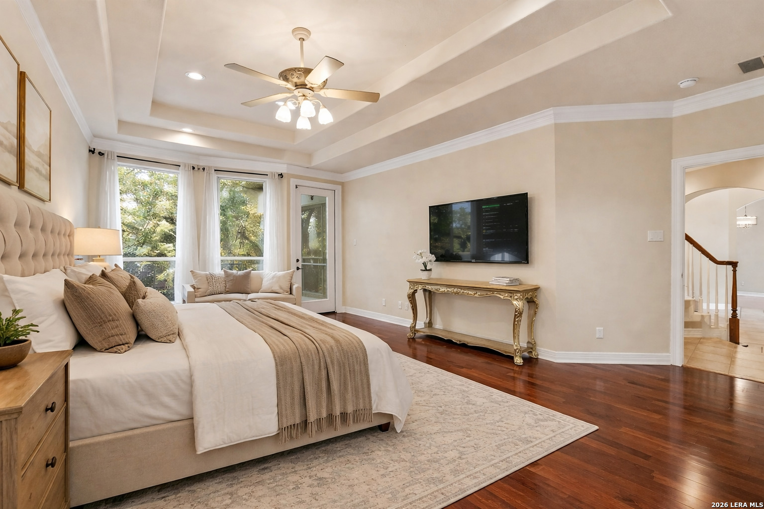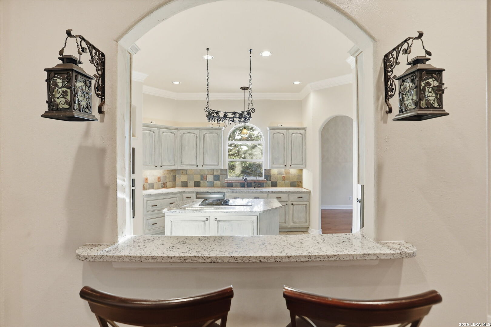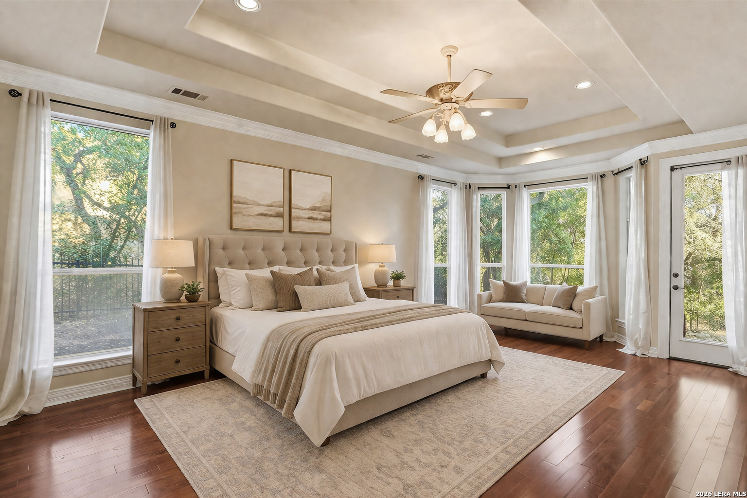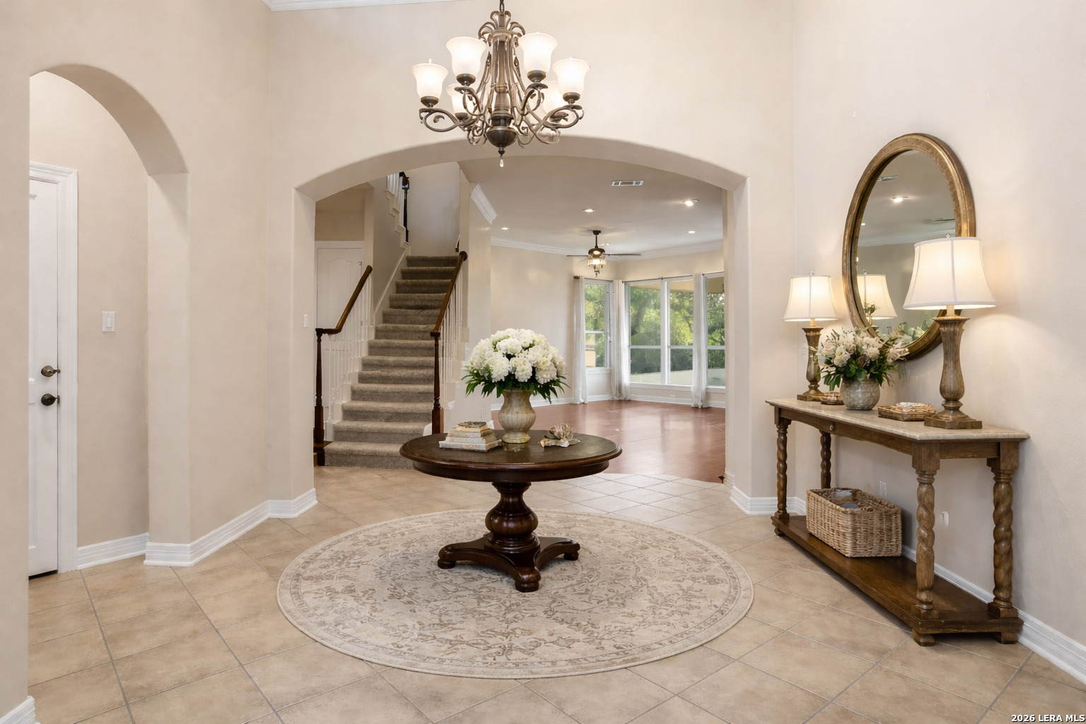 Heaven in the Hills! This stunning William Hirsch custom home sits on a private, partially wooded golf course lot in Cedar Creek Estates-just under 1/2 acre with no city taxes. One of the rare golf course properties with a fenced backyard, the low wrought-iron fence provides security without compromising sweeping fairway views near the green. Mature oak trees create a serene, resort-like setting. A dramatic two-story entry with soaring ceilings and elegant archways makes a striking first impression. Just off the entry, a flexible formal dining room easily serves as a private study-ideal for today's lifestyle. The spacious kitchen is designed for both everyday living and entertaining, featuring designer distressed cabinetry, under-cabinet lighting, a cooktop island, new GE appliances, and a WiFi-enabled oven with Air Fryer. An open-concept serving bar connects seamlessly to the living area while maintaining a sense of separation and sophistication. Outdoor living truly shines with a screened-in sunroom-complete with ceiling fan and electrical-opening to a flagstone patio with a jasmine-covered arbor. Just off the primary suite, a tranquil fountain creates a private retreat, perfect for quiet mornings or evening relaxation. Upstairs, a second-story terrace offers breathtaking panoramic Hill Country and golf course views, with private access from both guest suites. The luxurious primary suite features rare tigerwood flooring, an inlaid ceiling, and a spa-inspired bath with a Jacuzzi tub, dramatic windows, and custom cabinetry. The oversized, light-filled closet includes double-sided built-ins and a full window. Additional highlights include recently refreshed interior and exterior paint throughout, updated fixtures, designer granite countertops, upgraded sinks, and designer faucets in the kitchen and bathrooms, a spacious laundry room with generous storage and functional workspace, a wood-burning fireplace with gas starter, abundant storage throughout, and an oversized garage with workshop area, backyard access, and WiFi-enabled opener. An in-wall fingerprint/key safe adds an extra layer of security. Upstairs also offers two generously sized guest suites and a versatile flex room-ideal as a game room, media room, or office. New roof installed in 2020. Exceptional privacy, timeless design, and modern smart-home features-this is Hill Country living at its finest.