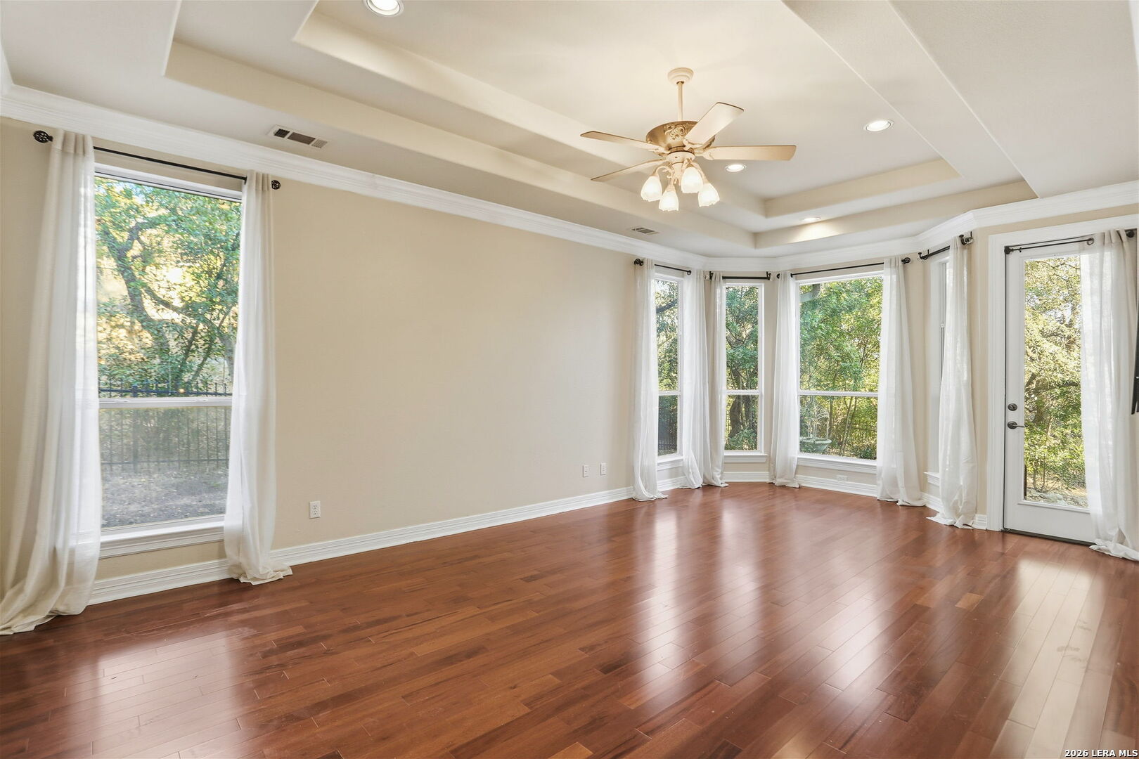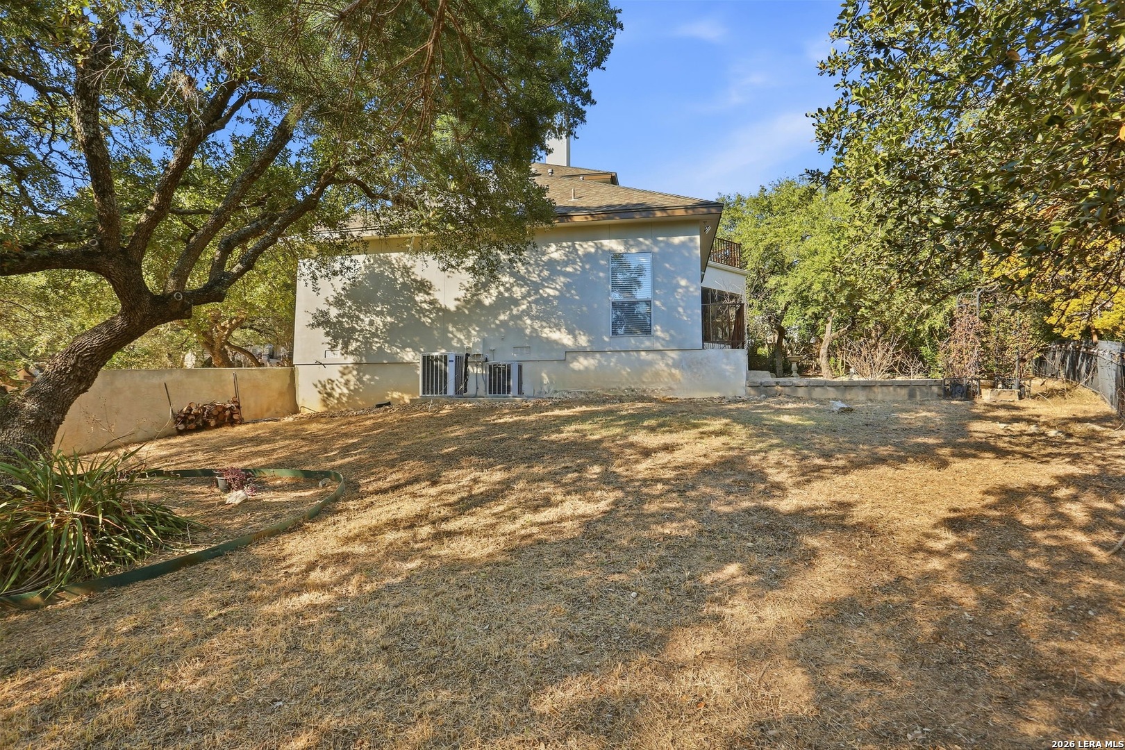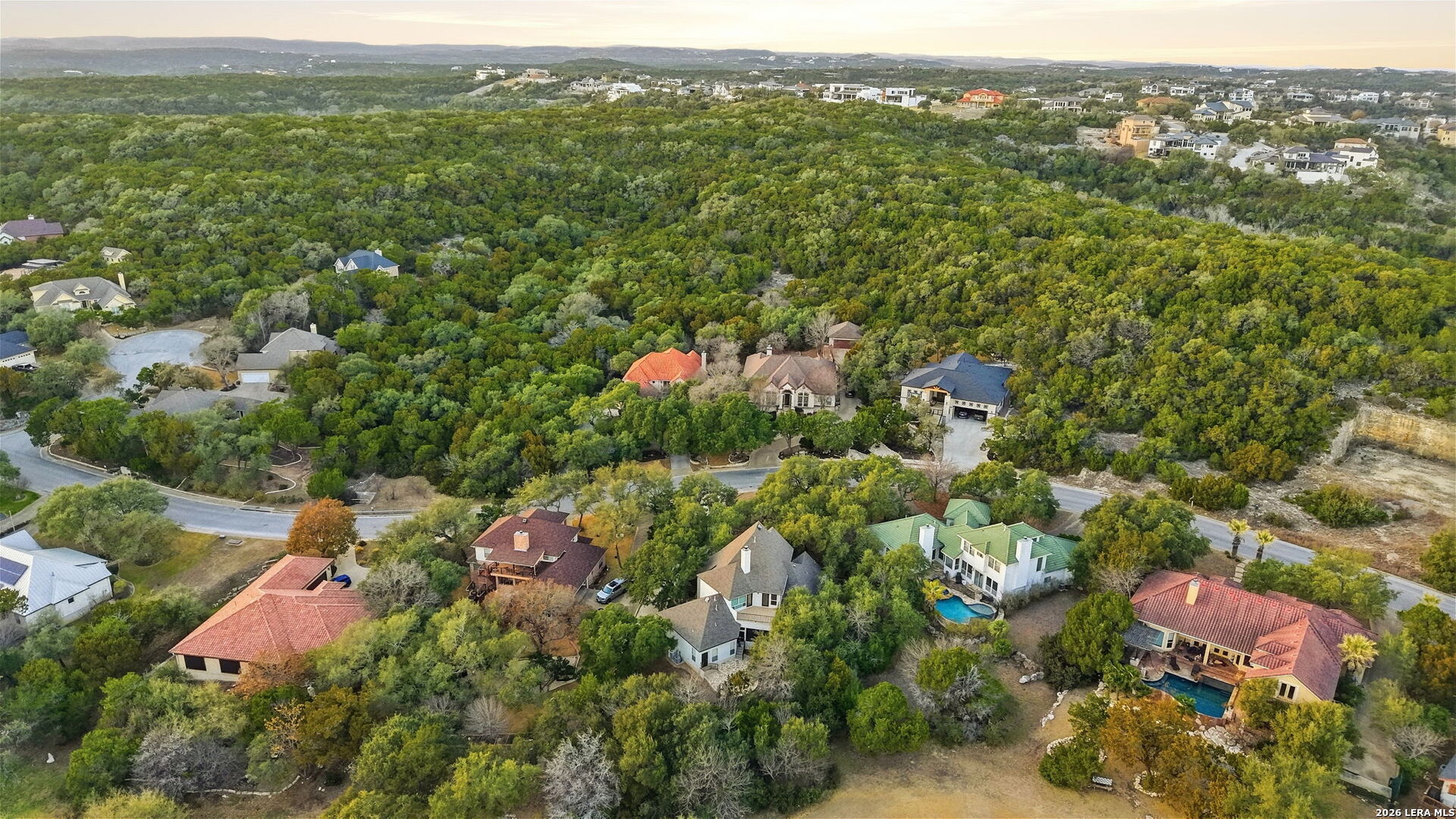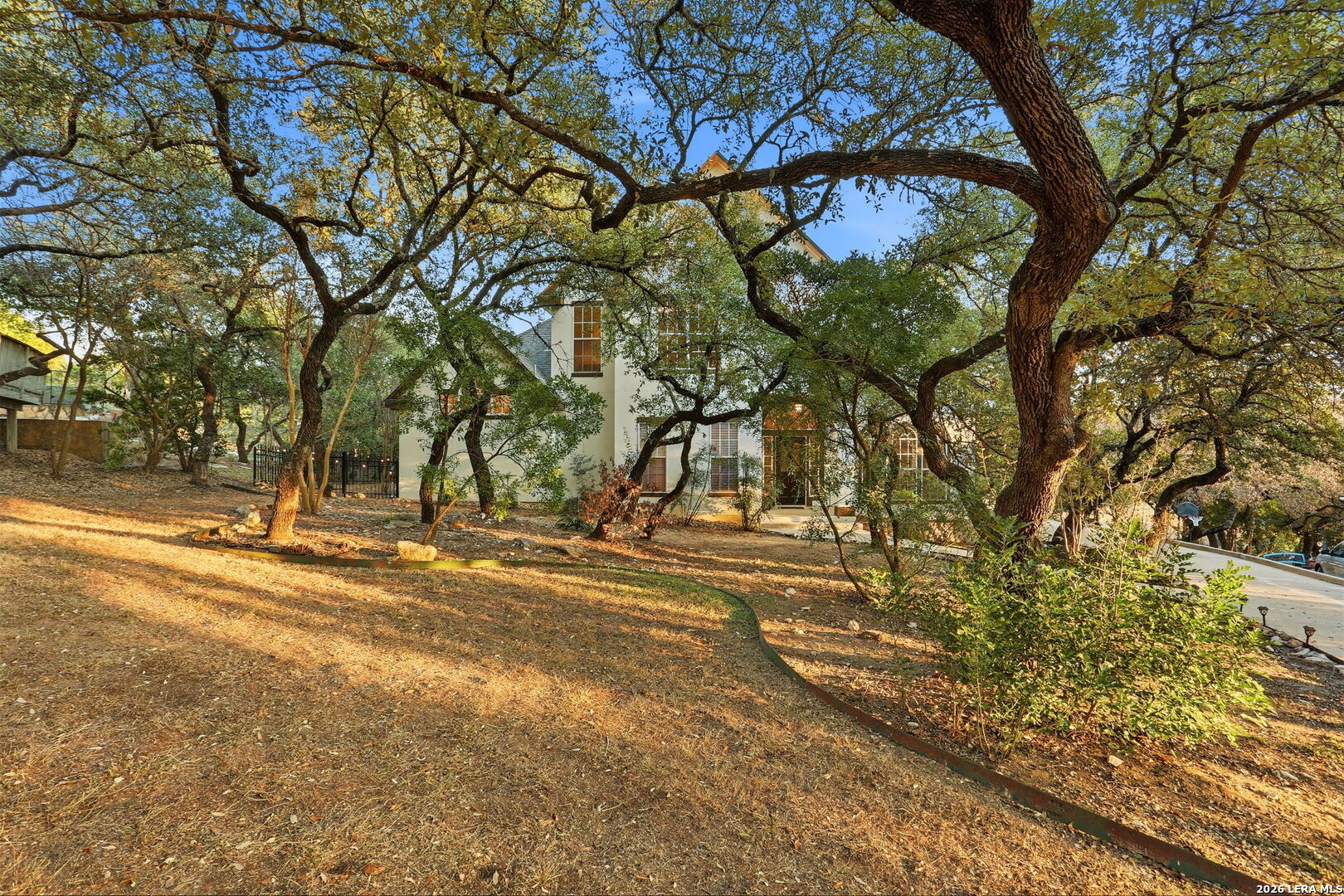 Heaven in the Hills, William Hirsch custom home on a private, wooded golf-course lot with no city taxes. Just under 1/2 acre and one of the few golf-course properties with a fenced backyard, featuring a low wrought-iron fence that preserves sweeping fairway views. Mature oaks frame views of the world-acclaimed Cedar Creek Golf Course, ideally positioned near the green. Outdoor living shines with a screened-in sunroom complete with ceiling fan and electrical outlets, plus a flagstone patio accented by a jasmine-covered arch. A second-story terrace offers panoramic Hill Country and golf-course views, with both guest suites enjoying private access. The game room/flex space is filled with natural light and picturesque views of mature oaks. Inside, a soaring entry with graceful archways sets the tone. The oversized kitchen features designer distressed cabinetry, under-cabinet lighting, a cooktop island, walk-in pantry, new appliances, and a WiFi-enabled oven. An open visiting bar seamlessly connects the kitchen and living areas-perfect for entertaining. The primary suite is a true retreat, showcasing tigerwood flooring, an elegant inlaid ceiling, and a private sitting area with oversized picturesque windows overlooking a tranquil water fountain and mature oak trees. Private back-door access leads directly to the outdoor living space. A spa-like bath and expansive, light-filled closet complete the suite. Additional highlights include new interior and exterior paint, new carpet and fixtures throughout, designer granite countertops, a wood-burning fireplace with gas starter, abundant storage, and an oversized garage with workshop, backyard access, and a WiFi-enabled garage door opener. Roof approximately 5.5 years old.