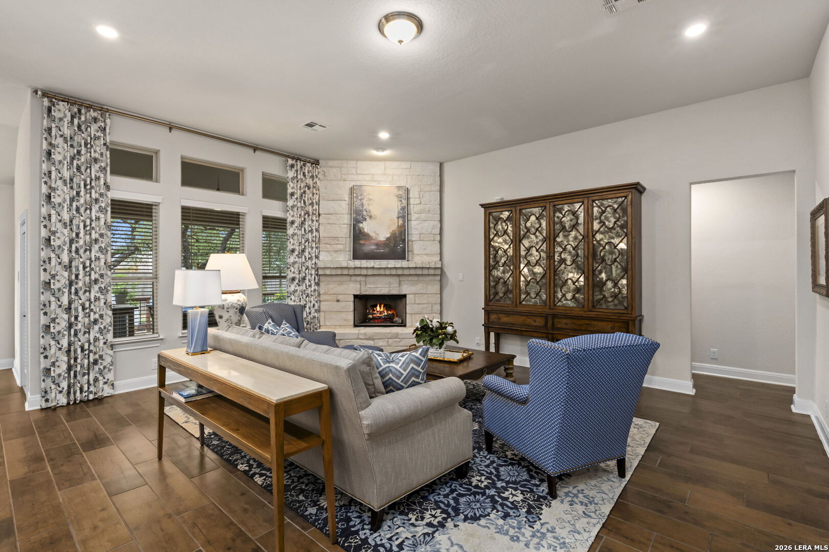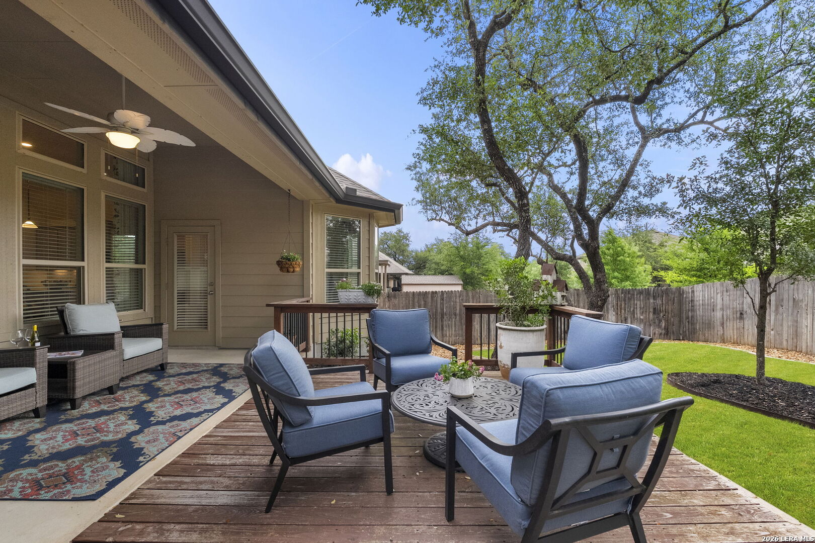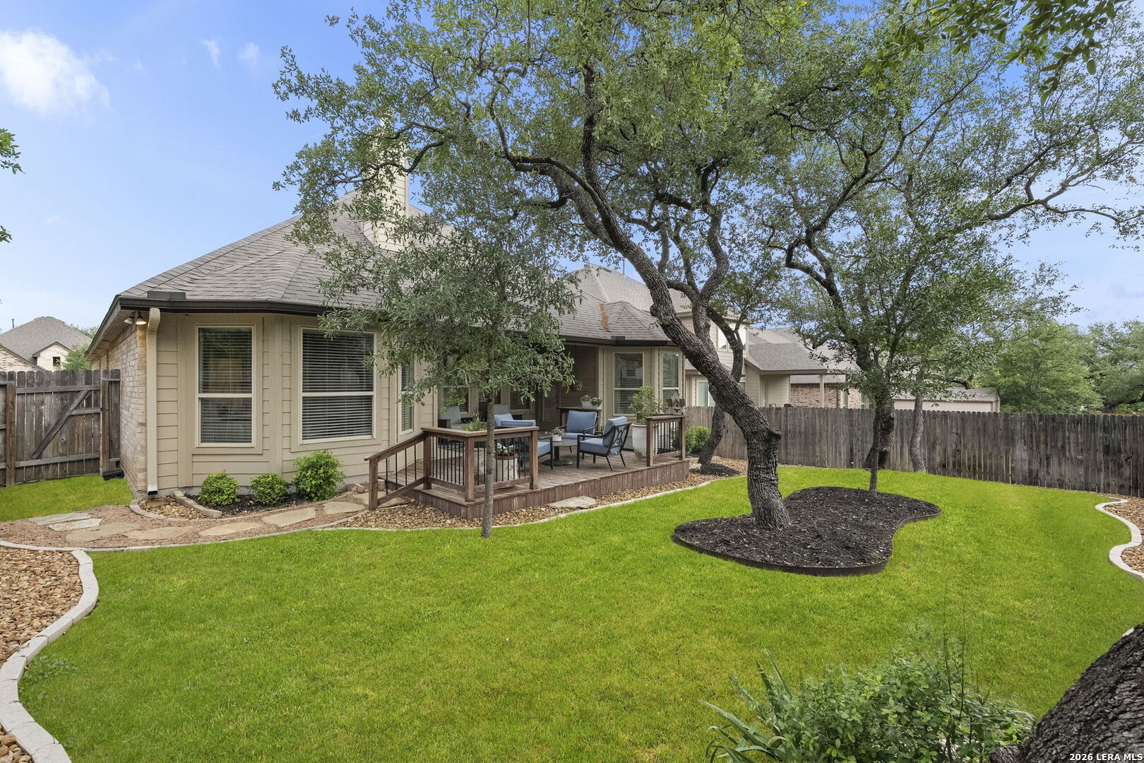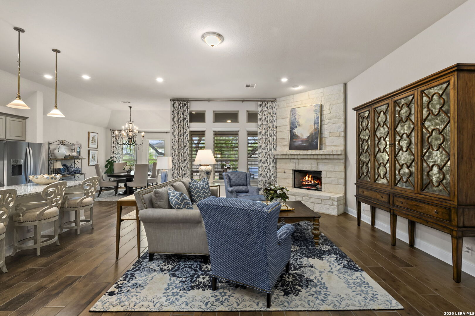 This stunning single story home in the desirable gated community of Fallbrook offers exceptional convenience with easy access to La Cantera and The Rim. Meticulously maintained by its original owner the home presents like a model and showcases a refined farmhouse-chic aesthetic throughout. From the moment you enter you're welcomed by a sprawling foyer that is perfect for displaying art and setting the tone for the home's elegant design. Striking designer, high end chandeliers, warm color palettes, wood-look tile flooring, detailed ceiling treatments and many more upgrades throughout come together to create a cohesive and inviting atmosphere. Expansive walls of windows fill the interior with natural lighting enhancing every space. At the heart of the home the great room impresses with a floor-to-ceiling stone fireplace and a seamless wall of glass windows, flowing effortlessly into the gourmet kitchen and dining area! The open flowing concept is ideal for both everyday living and entertaining. The chef's kitchen is thoughtfully designed with decorative pendant lighting, stainless steel appliances, gas cooking and an abundance of custom cabinetry. A dedicated buffet/bar area is perfect when hosting, while the sitting bar provides additional seating for guests. The private primary suite is filled with natural light and offers serene views of the backyard, along with a cozy sitting area. The spa-inspired en suite bath features separate vanities, a soaking tub, a seamless glass walk-in shower and a large walk-in closet. Three secondary bedrooms provide generous accommodations for family and guests. The versatile flex room, that is currently being used as a study with a tiffany chandelier, can easily function as a game room or playroom to suit your lifestyle. Step outside to enjoy year-round outdoor living on the covered patio, which extends to an open deck with ample seating space. The park-like backyard is adorned with mature trees and professional landscaping creating a peaceful setting for morning coffee or relaxing evenings. Residents of Fallbrook enjoy access to community amenities including a clubhouse and pool. With convenient proximity to Interstate 10 you're just minutes from premier shopping, dining and entertainment in San Antonio and the scenic Hill Country.