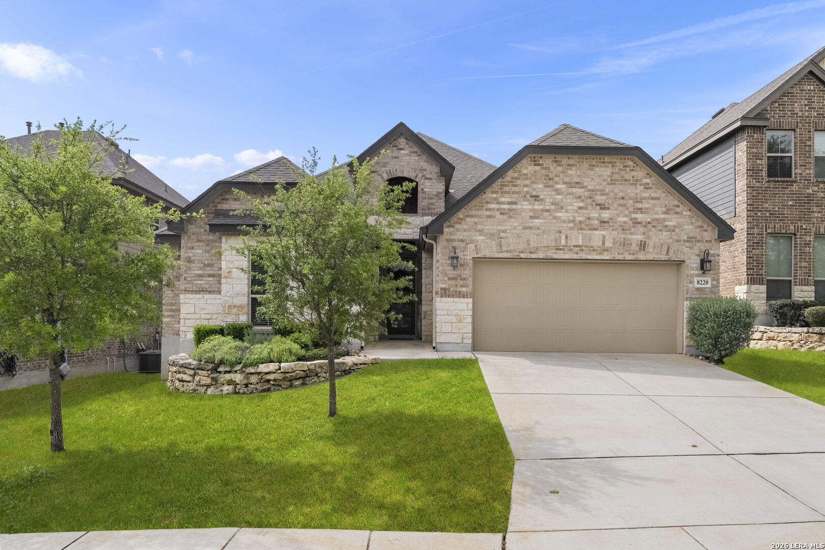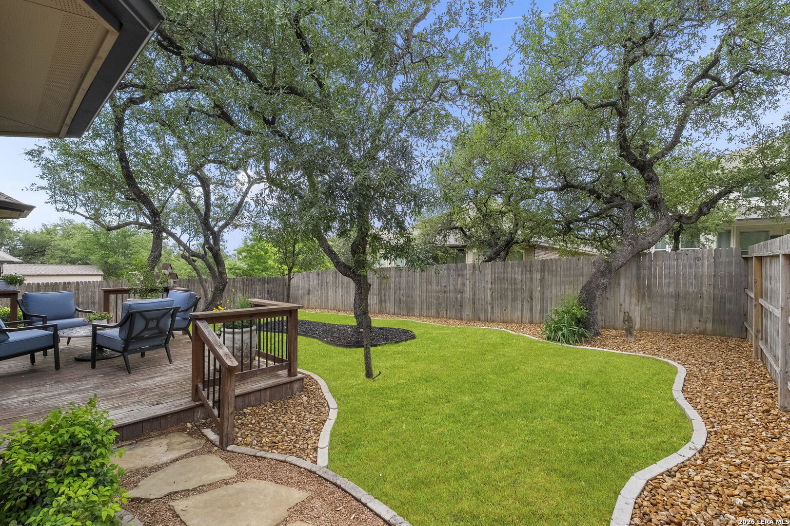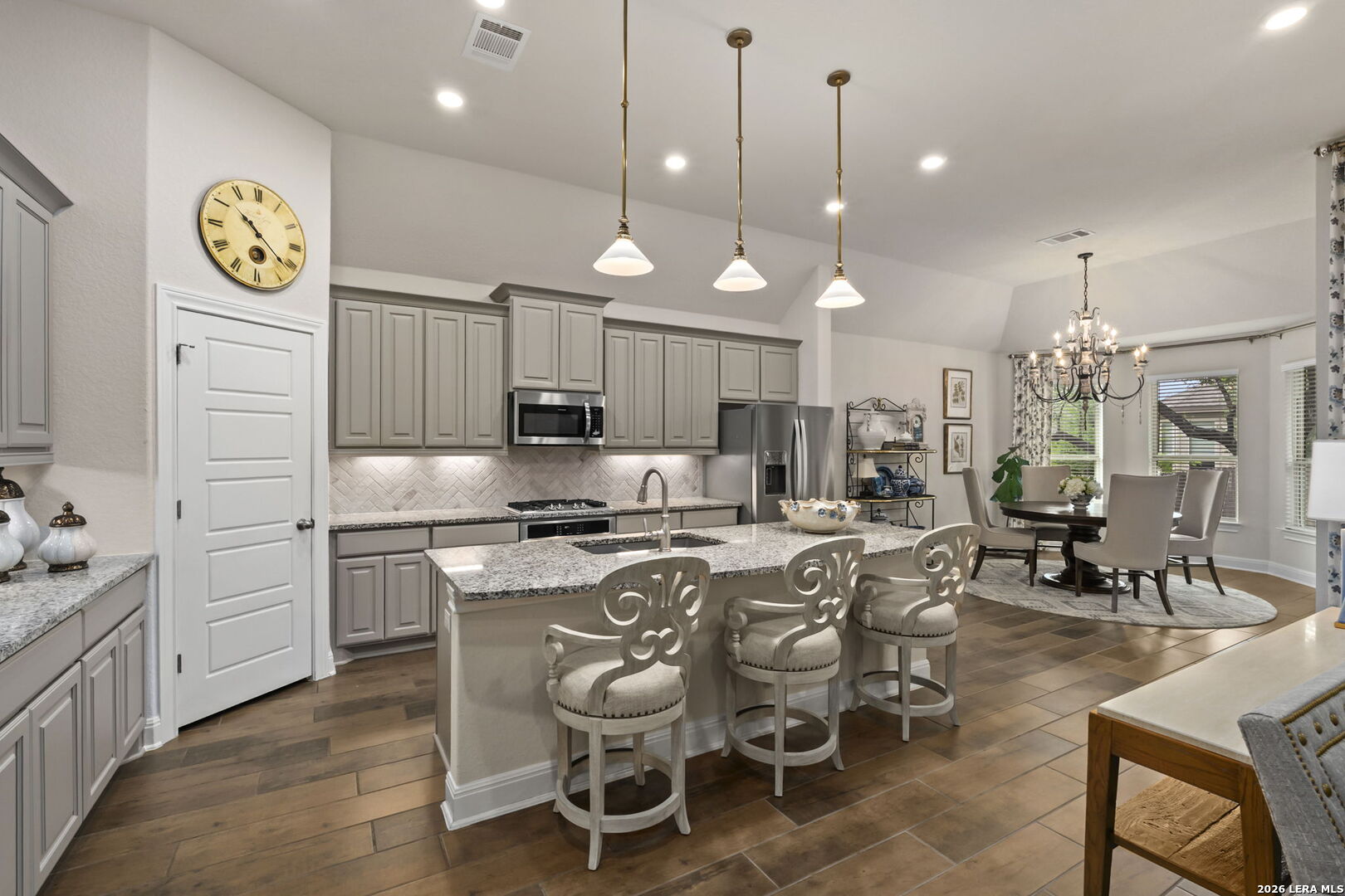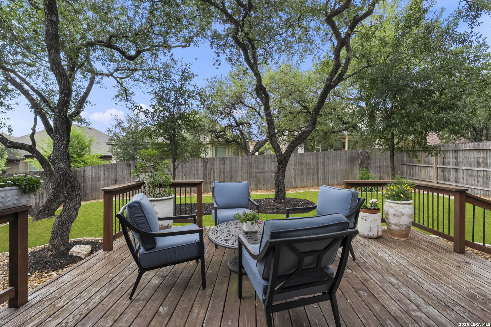 This stunning single story home in the desirable gated community of Fallbrook offers exceptional convenience with easy access to La Cantera and The Rim. Meticulously maintained by its original owner the home presents like a model and showcases a refined farmhouse-chic aesthetic throughout. From the moment you enter you're welcomed by a sprawling foyer that is perfect for displaying art and setting the tone for the home's elegant design. Striking designer, high end chandeliers, warm color palettes, wood-look tile flooring, detailed ceiling treatments and many more upgrades throughout come together to create a cohesive and inviting atmosphere. Expansive walls of windows fill the interior with natural lighting enhancing every space. At the heart of the home the great room impresses with a floor-to-ceiling stone fireplace and a seamless wall of glass windows, flowing effortlessly into the gourmet kitchen and dining area! The open flowing concept is ideal for both everyday living and entertaining. The chef's kitchen is thoughtfully designed with decorative pendant lighting, stainless steel appliances, gas cooking and an abundance of custom cabinetry. A dedicated buffet/bar area is perfect when hosting, while the sitting bar provides additional seating for guests. The private primary suite is filled with natural light and offers serene views of the backyard, along with a cozy sitting area. The spa-inspired en suite bath features separate vanities, a soaking tub, a seamless glass walk-in shower and a large walk-in closet. Three secondary bedrooms provide generous accommodations for family and guests. The versatile flex room, that is currently being used as a study with a tiffany chandelier, can easily function as a game room or playroom to suit your lifestyle. Step outside to enjoy year-round outdoor living on the covered patio, which extends to an open deck with ample seating space. The park-like backyard is adorned with mature trees and professional landscaping creating a peaceful setting for morning coffee or relaxing evenings. Residents of Fallbrook enjoy access to community amenities including a clubhouse and pool. With convenient proximity to Interstate 10 you're just minutes from premier shopping, dining and entertainment in San Antonio and the scenic Hill Country.