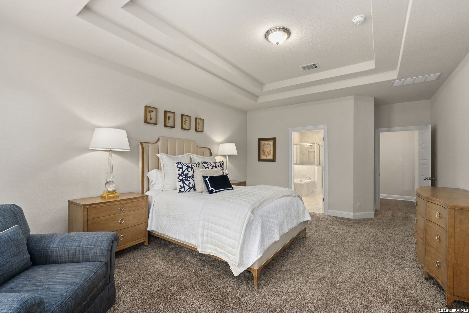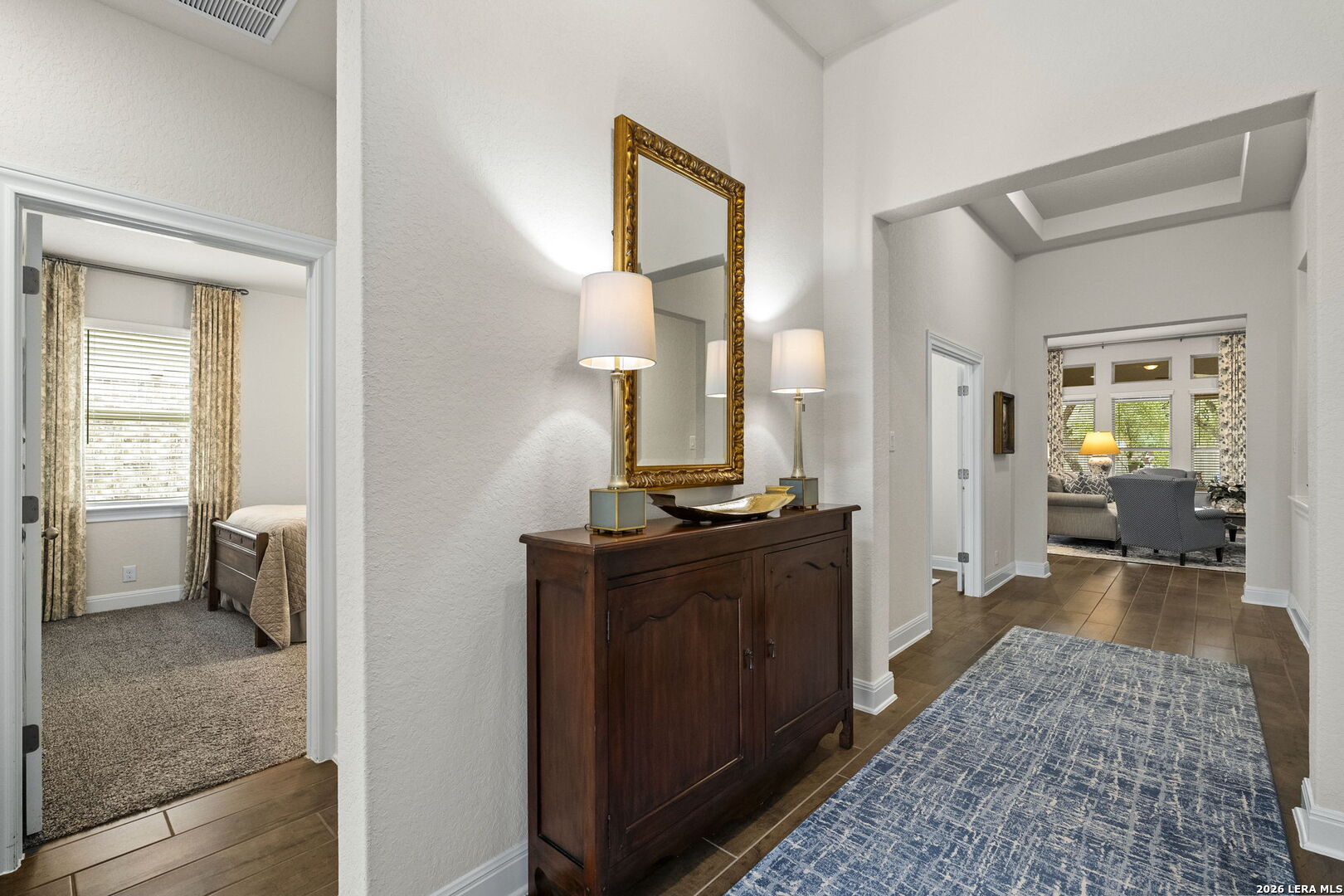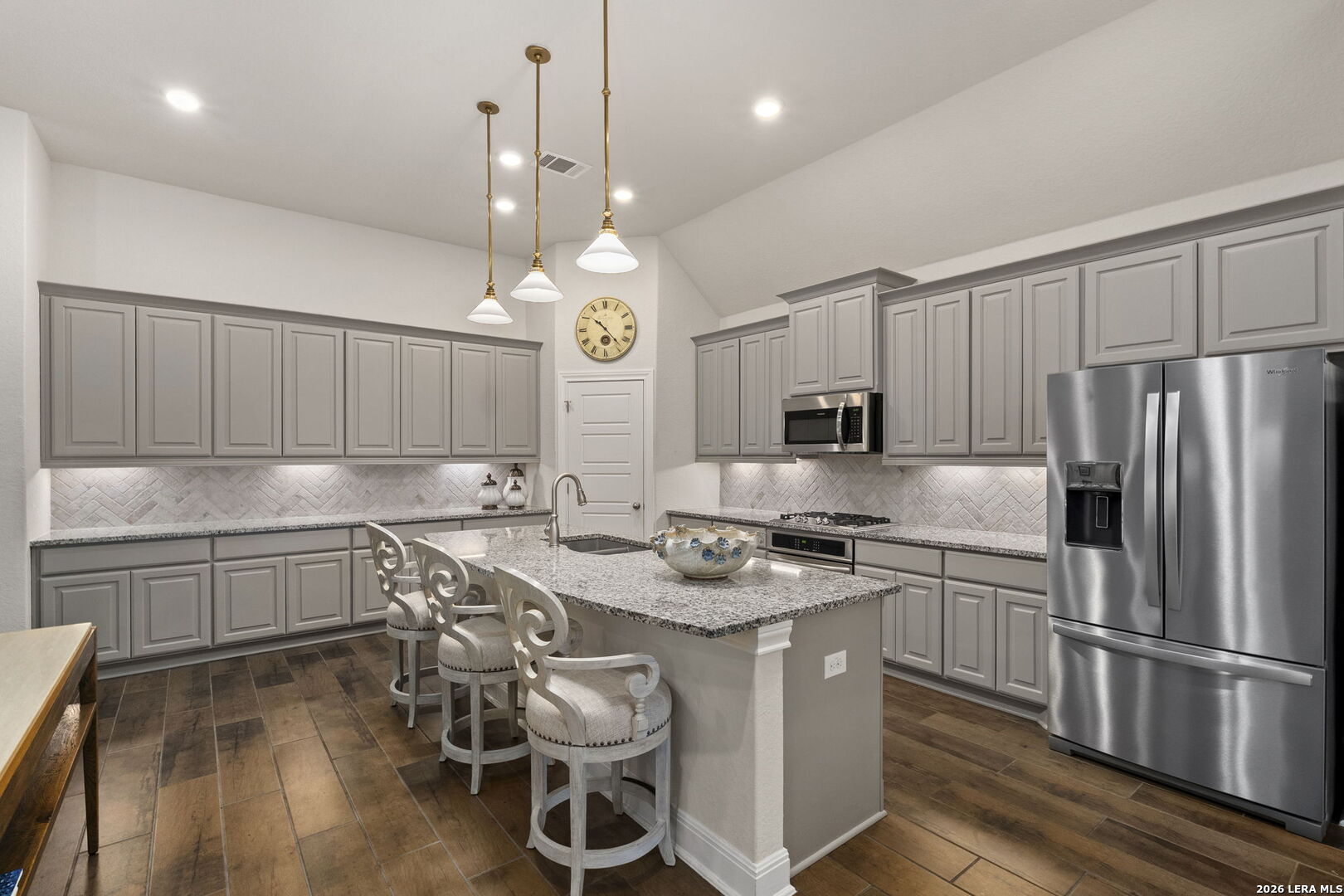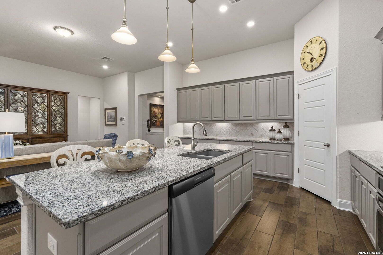 This stunning single story home in the desirable gated community of Fallbrook offers exceptional convenience with easy access to La Cantera and The Rim. Meticulously maintained by its original owner the home presents like a model and showcases a refined farmhouse-chic aesthetic throughout. From the moment you enter you're welcomed by a sprawling foyer that is perfect for displaying art and setting the tone for the home's elegant design. Striking designer, high end chandeliers, warm color palettes, wood-look tile flooring, detailed ceiling treatments and many more upgrades throughout come together to create a cohesive and inviting atmosphere. Expansive walls of windows fill the interior with natural lighting enhancing every space. At the heart of the home the great room impresses with a floor-to-ceiling stone fireplace and a seamless wall of glass windows, flowing effortlessly into the gourmet kitchen and dining area! The open flowing concept is ideal for both everyday living and entertaining. The chef's kitchen is thoughtfully designed with decorative pendant lighting, stainless steel appliances, gas cooking and an abundance of custom cabinetry. A dedicated buffet/bar area is perfect when hosting, while the sitting bar provides additional seating for guests. The private primary suite is filled with natural light and offers serene views of the backyard, along with a cozy sitting area. The spa-inspired en suite bath features separate vanities, a soaking tub, a seamless glass walk-in shower and a large walk-in closet. Three secondary bedrooms provide generous accommodations for family and guests. The versatile flex room, that is currently being used as a study with a tiffany chandelier, can easily function as a game room or playroom to suit your lifestyle. Step outside to enjoy year-round outdoor living on the covered patio, which extends to an open deck with ample seating space. The park-like backyard is adorned with mature trees and professional landscaping creating a peaceful setting for morning coffee or relaxing evenings. Residents of Fallbrook enjoy access to community amenities including a clubhouse and pool. With convenient proximity to Interstate 10 you're just minutes from premier shopping, dining and entertainment in San Antonio and the scenic Hill Country.