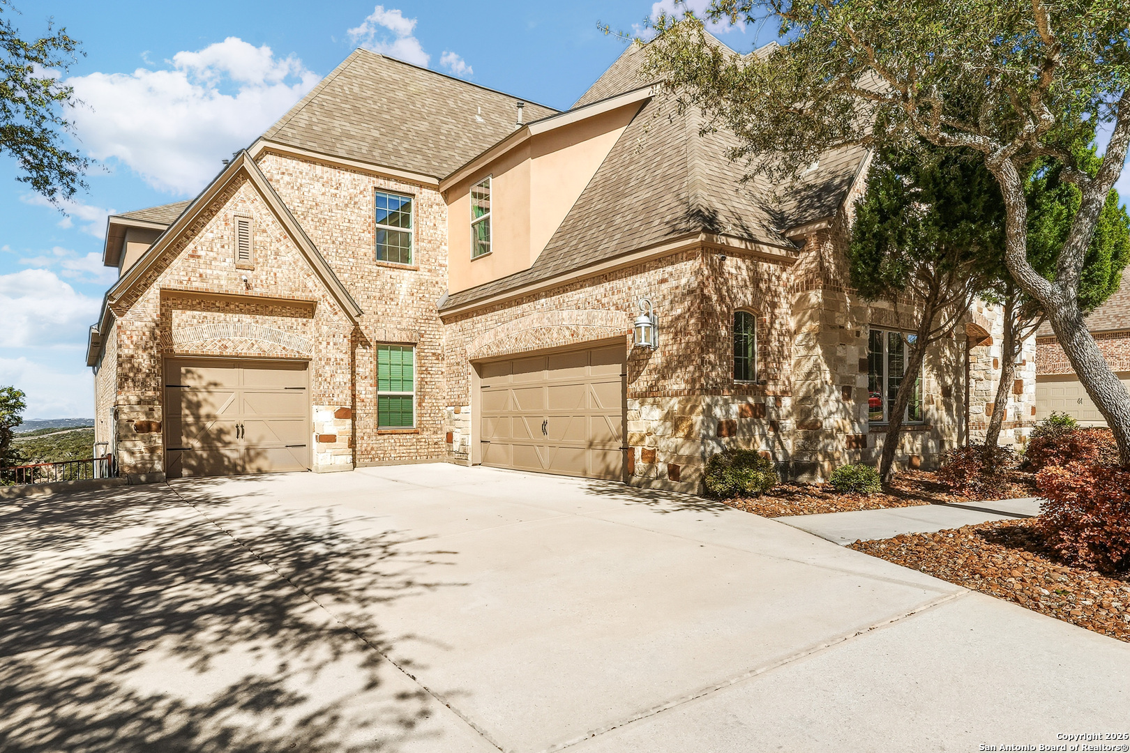 On Top of the World! This fabulous luxury home offers breathtaking Hill Country views from expansive covered outdoor living spaces-one off the main floor and another off the second story-perfect for relaxing or entertaining. Situated on over half an acre and backing to a greenbelt, the property provides exceptional privacy in the highly sought-after Stonewall Estates community, located within North East ISD. Enjoy convenient access to IH-10 and Stonewall Parkway, with premier shopping, dining, and entertainment at The Rim and La Cantera just minutes away, along with UTSA and Six Flags Fiesta Texas. Inside, the thoughtfully designed floor plan features five spacious bedrooms, each with its own private en-suite bathroom, plus a guest half bath. The luxurious primary suite as well as a secondary bedroom is located on the main level for added comfort and convenience. The gourmet kitchen is a chef's dream, complete with a 5-burner gas cooktop, double ovens, granite countertops, and beautiful wood flooring. Additional highlights include three living areas, a dedicated media room, and two separate garages (2-car plus 1-car), offering ample space for vehicles, storage, and entertaining. This exceptional home combines luxury, privacy, and convenience in one of the area's most desirable communities