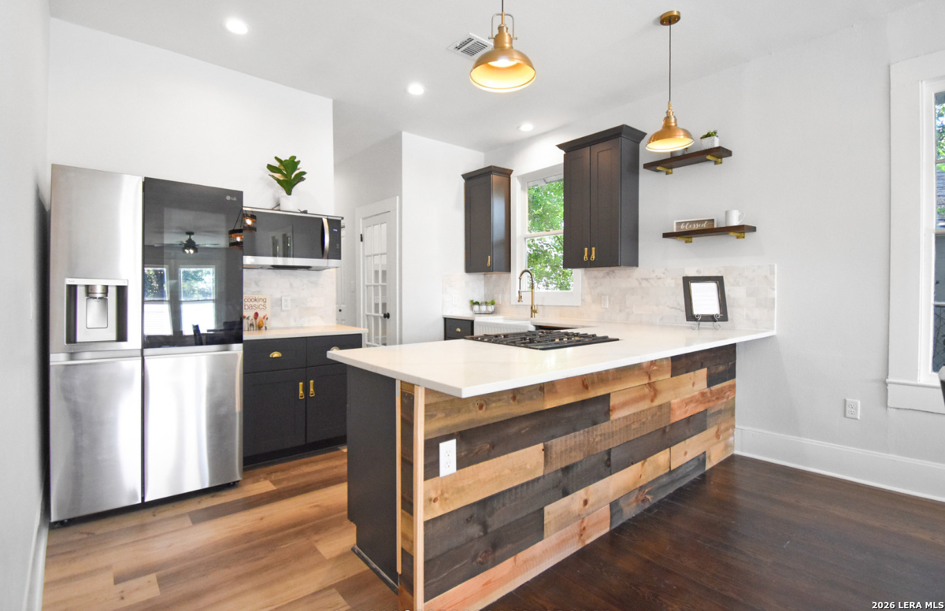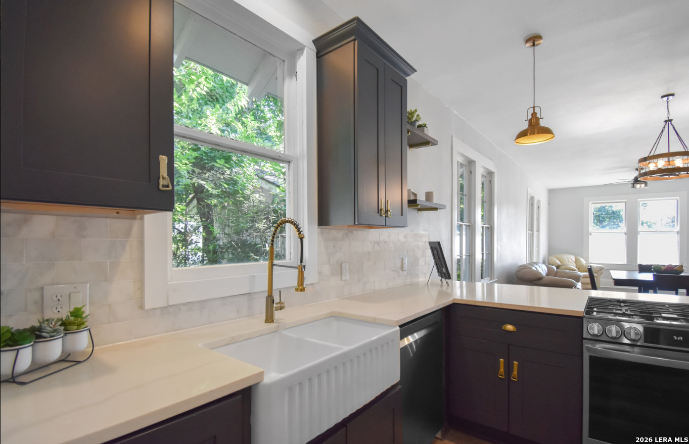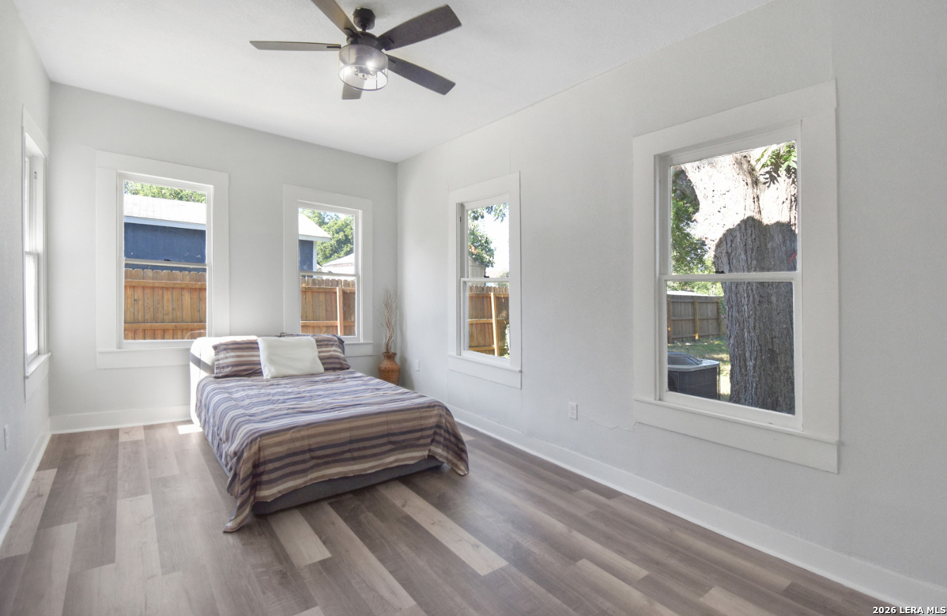 Nestled in the heart of Historic Dignowity Hill, this charming home features three spacious bedrooms and two pristine bathrooms. Impeccably maintained, the home boasts fresh, contemporary paint throughout, reflecting a super clean and modern aesthetic, Quartz counters, Luxury Vinyl Plank flooring, TANKLESS WATER HEATER, No carpet, REFRIGERATOR included, farmhouse sink, LG Appliances, Original Hardwood, marbled tile backsplash. Step outside to discover an oversized backyard oasis, perfect for relaxation and entertainment, while the amazing gated front yard offers a grand, inviting entrance. This residence seamlessly blends comfort and style, creating a perfect sanctuary for anyone!