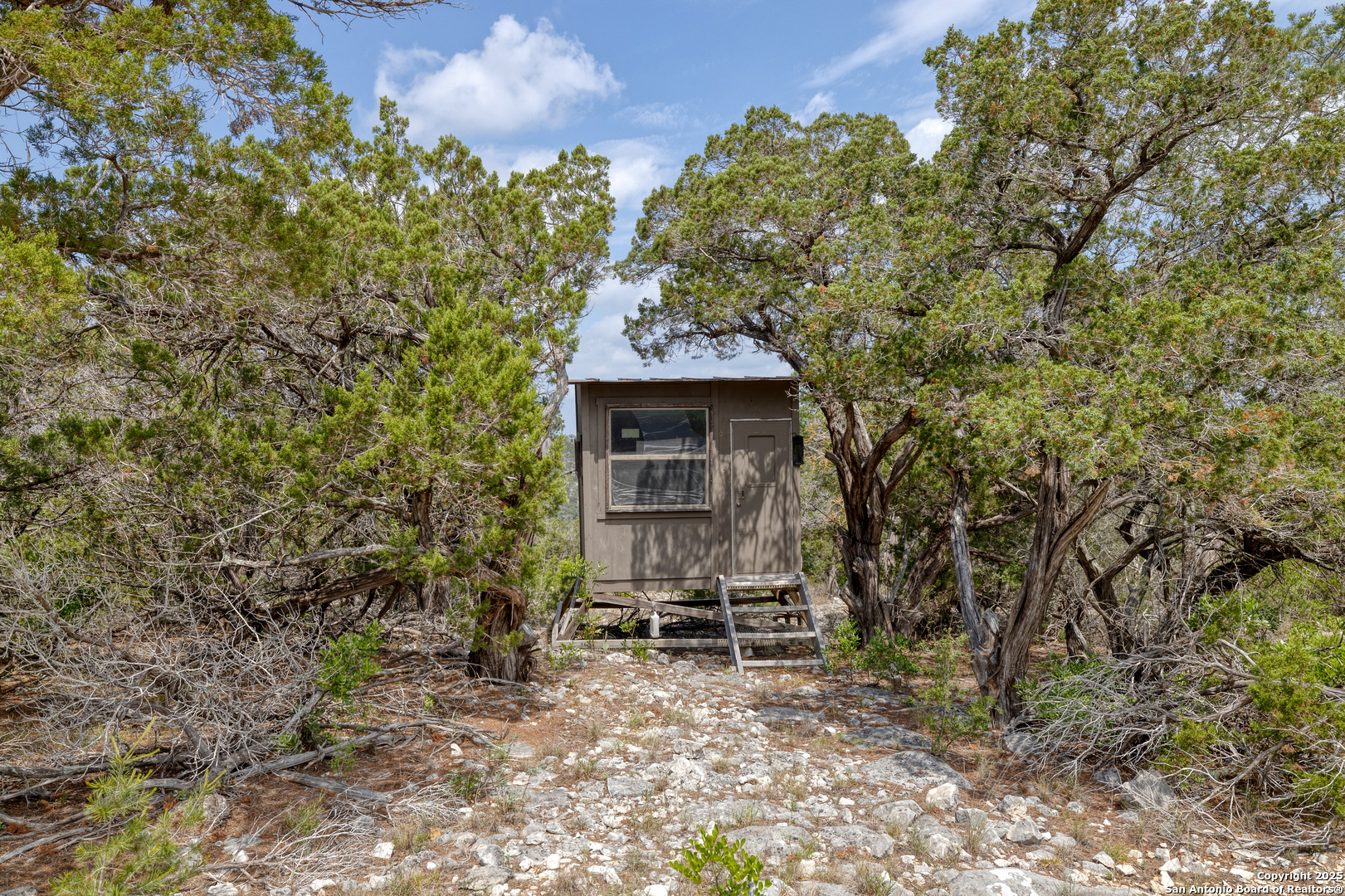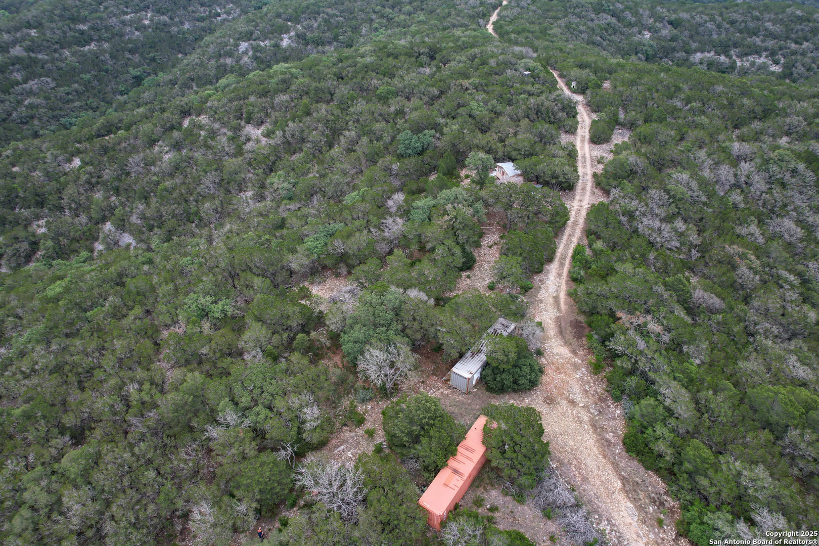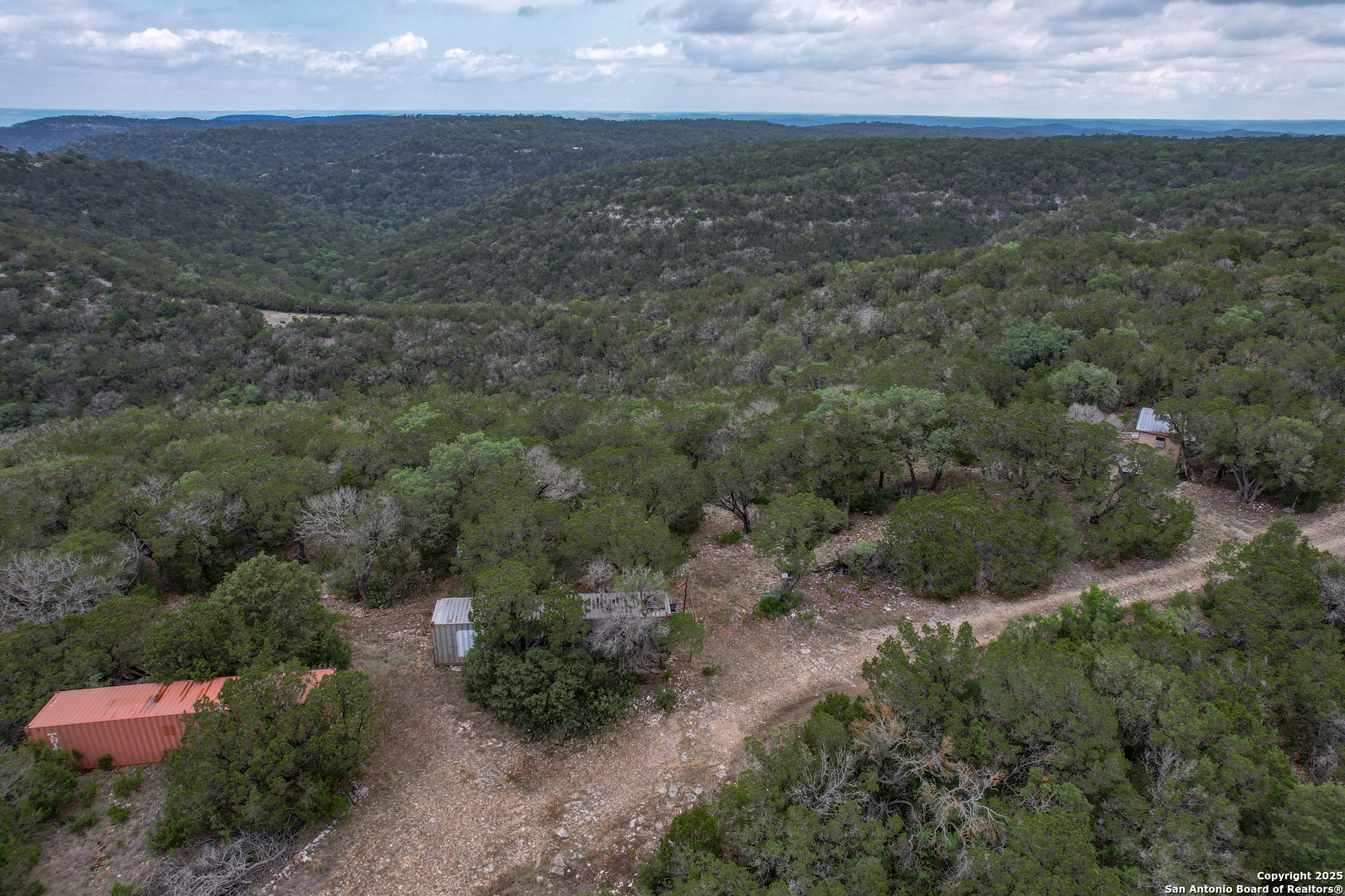 This 94.97 acres is not for just anyone! An active, adventurous person that loves to explore and appreciates seclusion and long beautiful views and has a love for wildlife would appreciate this unique property. It is located approx. 12 miles west of Leakey, off Hwy. 337, then a county- maintained road before a private road to the property. Approaching base camp at the southern border of the property you will have a considerable amount of flat tree covered land. There you will find two large shipping containers with ample storage, a small sleeping cabin and septic, with room left over for some RV's. From base camp there is an easy walk to a cave big enough to stand up in with several drop-down caverns that could be opened up for further exploration. From there the land cascades into a massive canyon replete with a wet weather creek and at least one spring that appears to be permanent, furnishing the wildlife, (including white tail, aoudad, wild hogs and turkey) with plenty of water. This particular spring is rock bottom and could possibly be dammed. Blinds, feeders, hog trap convey and if you are the person described above, you will not be disappointed!