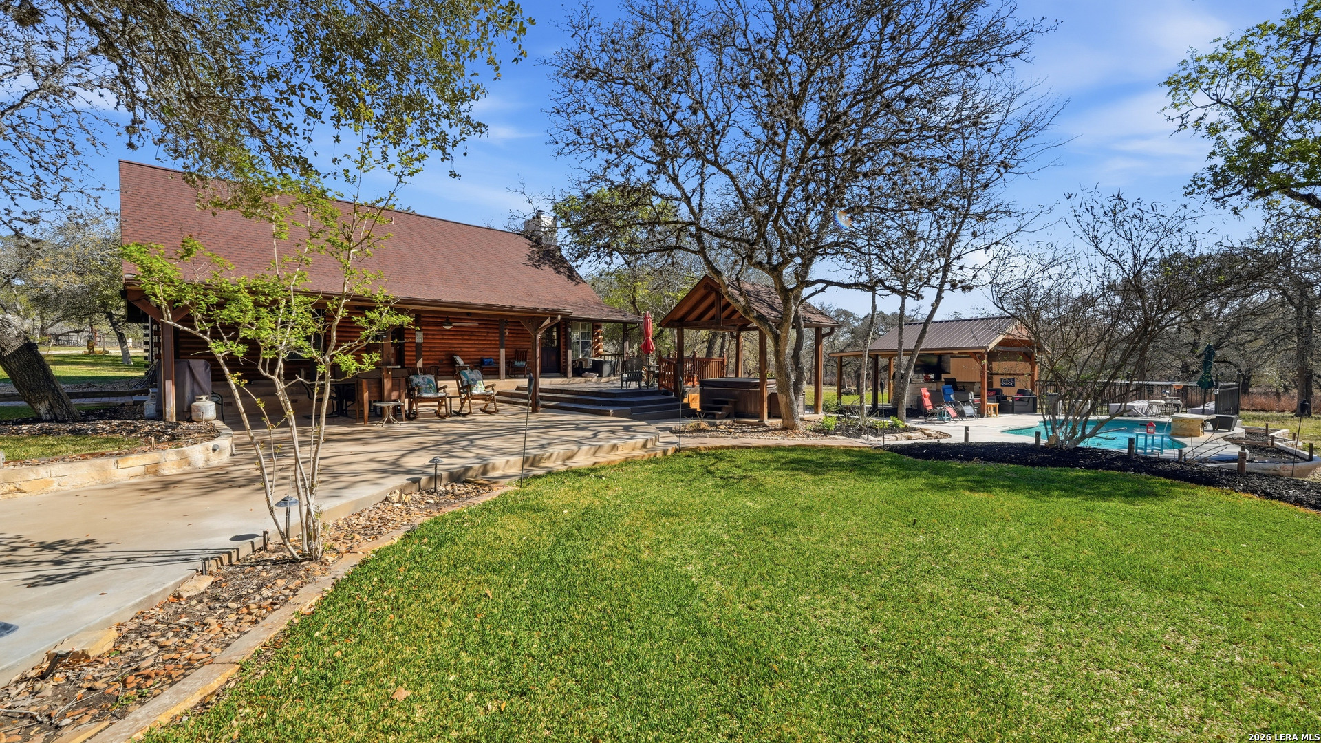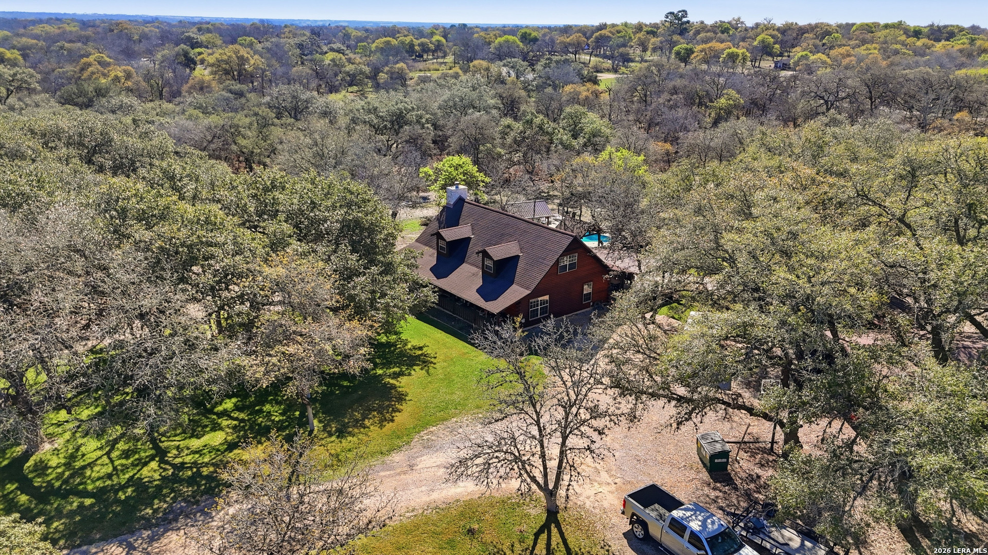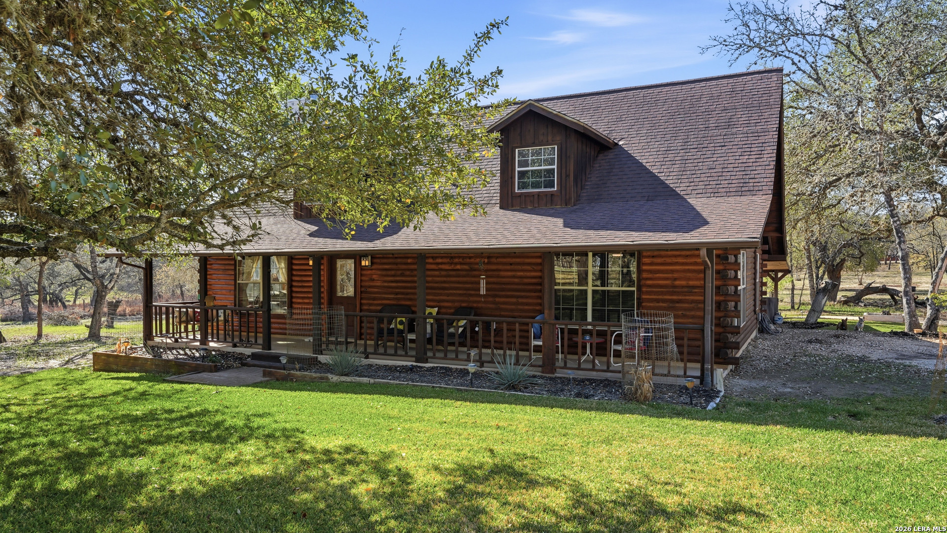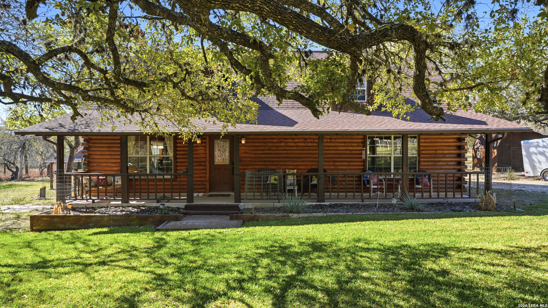 Gorgeous Custom Log Cabin on just over 5 acres with road frontage on both sides. Horses welcome! This home is shaded by mature oak trees. The backyard is built for entertaining with several covered patio areas, inground pool with water feature, landscaping, BBQ grill area with TV and bar. Water well for all irrigation outside. Detached 2 car carport with additional storage and a separate storage shed. The house has tall ceilings with an open floorplan. Downstairs has 2 bedrooms with a full bathroom and upstairs has 1 bedroom and 1 bathroom. The living room features a floor to ceiling fireplace and lots of windows for natural lighting. Kitchen has an open floorplan with wrap around breakfast bar. This is a one of a kind property!! LVISD