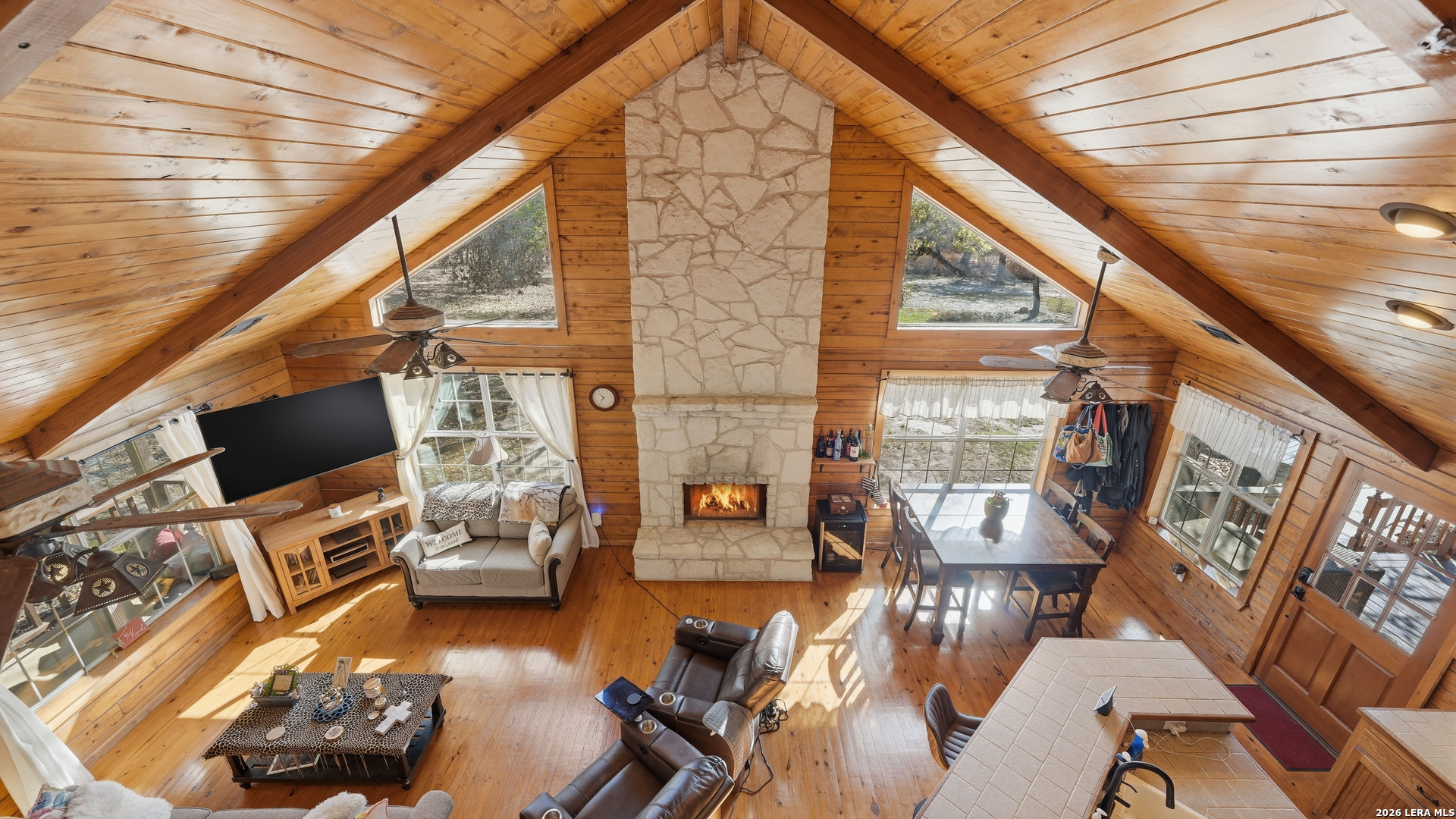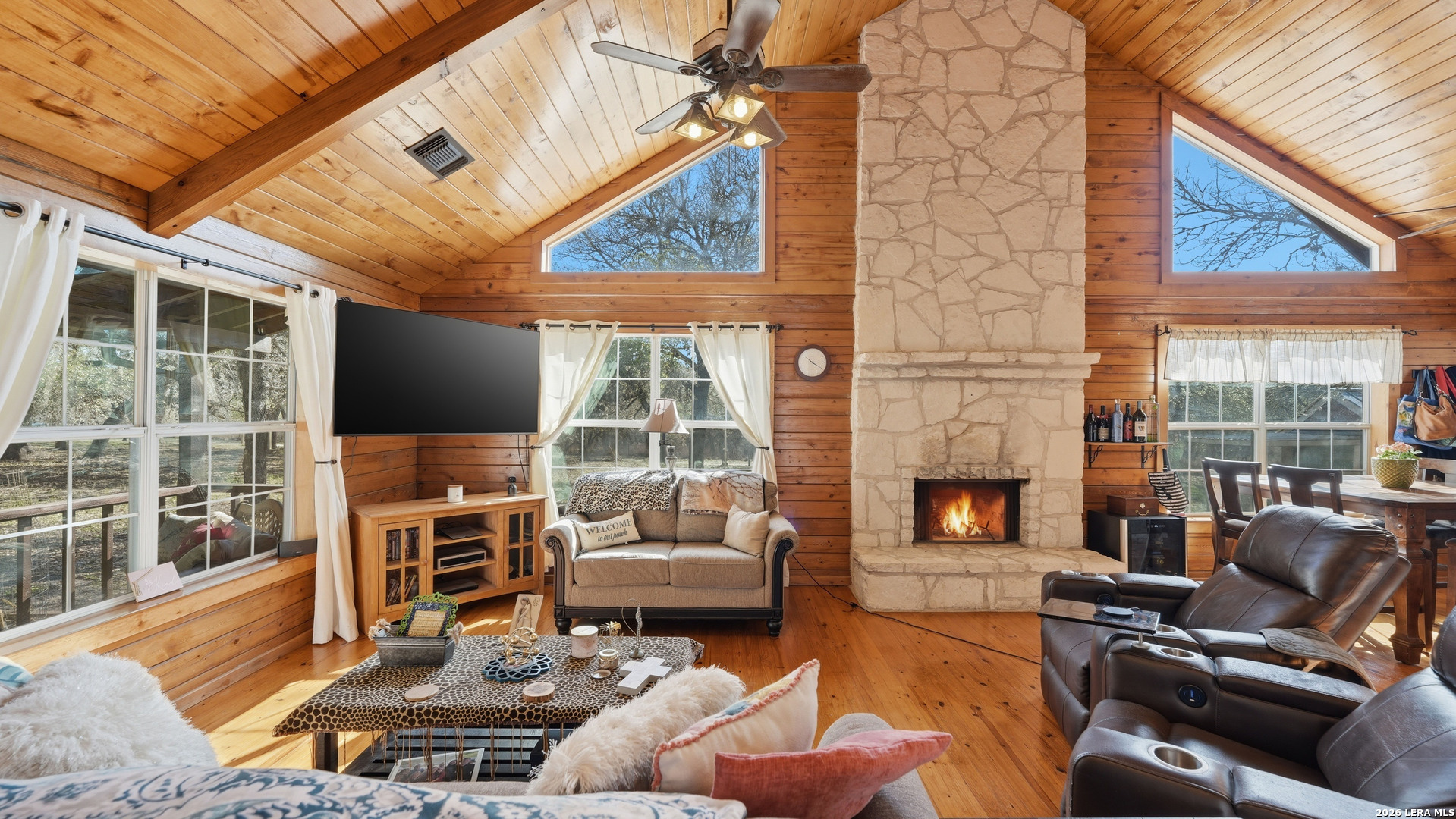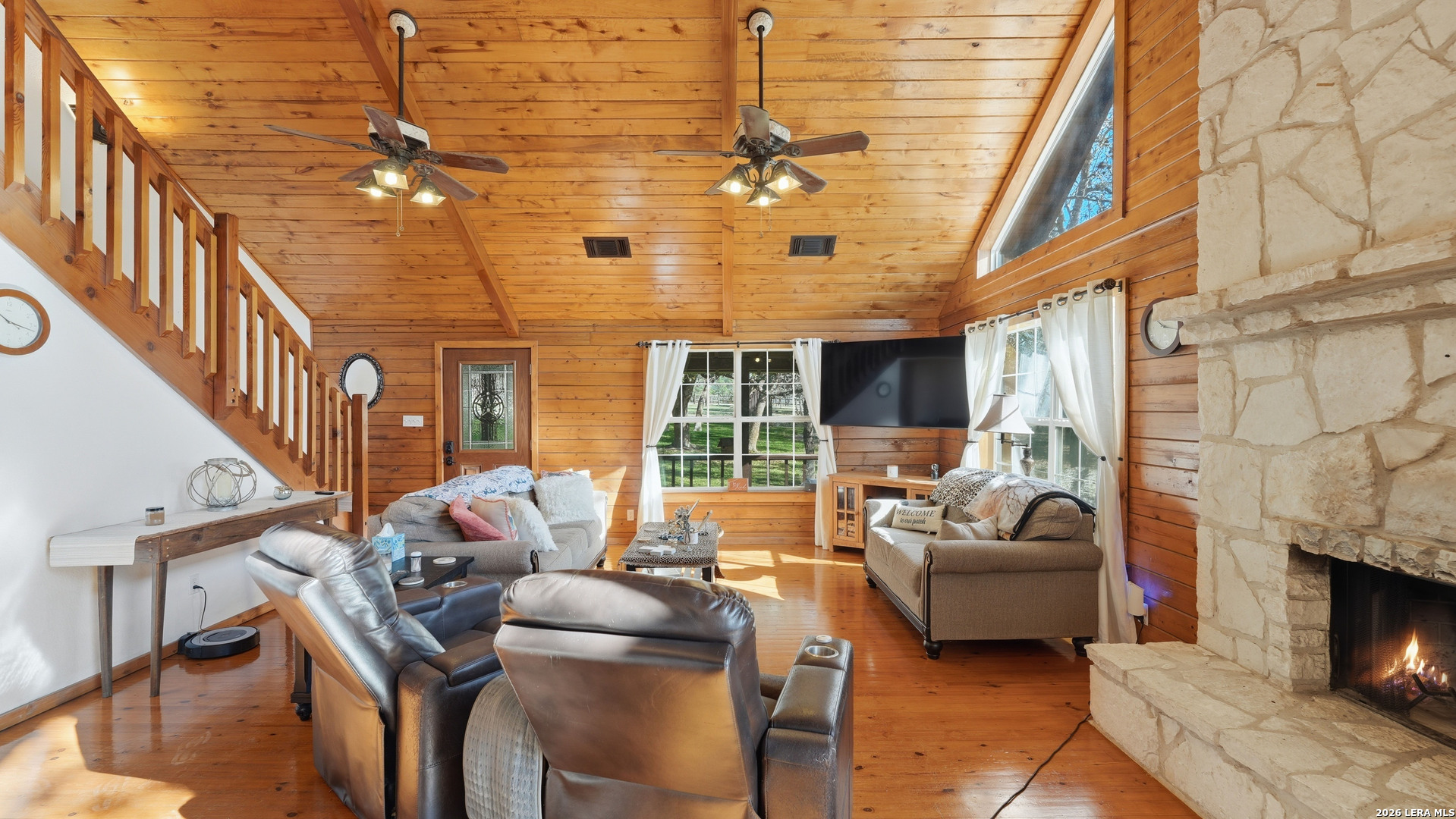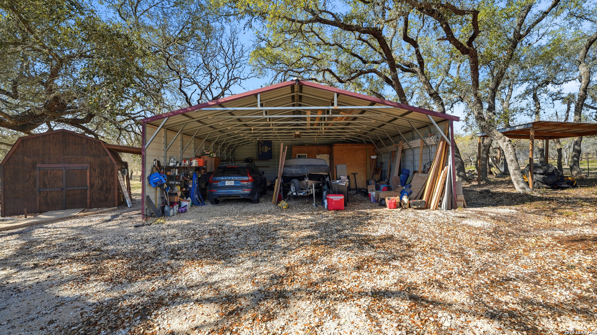 Gorgeous Custom Log Cabin on just over 5 acres with road frontage on both sides. Horses welcome! This home is shaded by mature oak trees. The backyard is built for entertaining with several covered patio areas, inground pool with water feature, landscaping, BBQ grill area with TV and bar. Water well for all irrigation outside. Detached 2 car carport with additional storage and a separate storage shed. The house has tall ceilings with an open floorplan. Downstairs has 2 bedrooms with a full bathroom and upstairs has 1 bedroom and 1 bathroom. The living room features a floor to ceiling fireplace and lots of windows for natural lighting. Kitchen has an open floorplan with wrap around breakfast bar. This is a one of a kind property!! LVISD