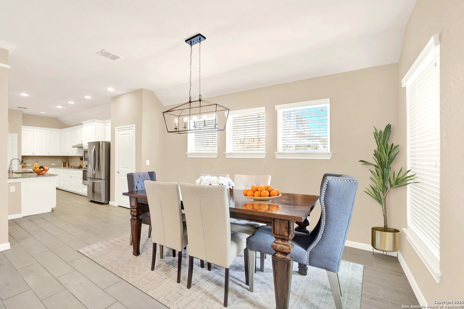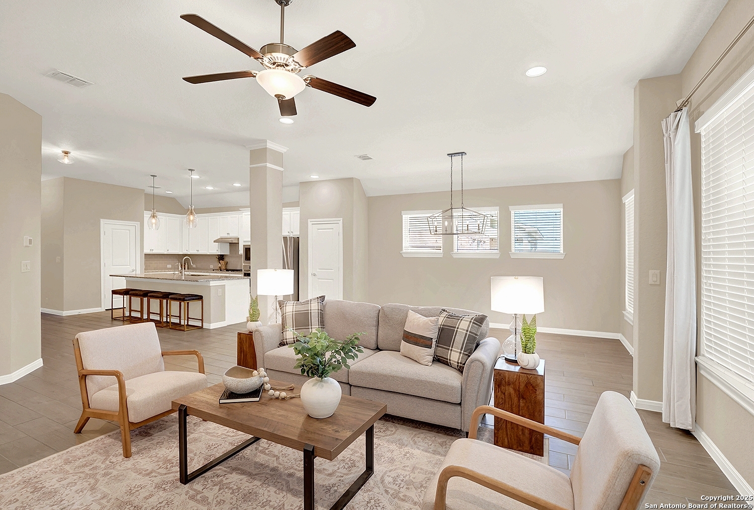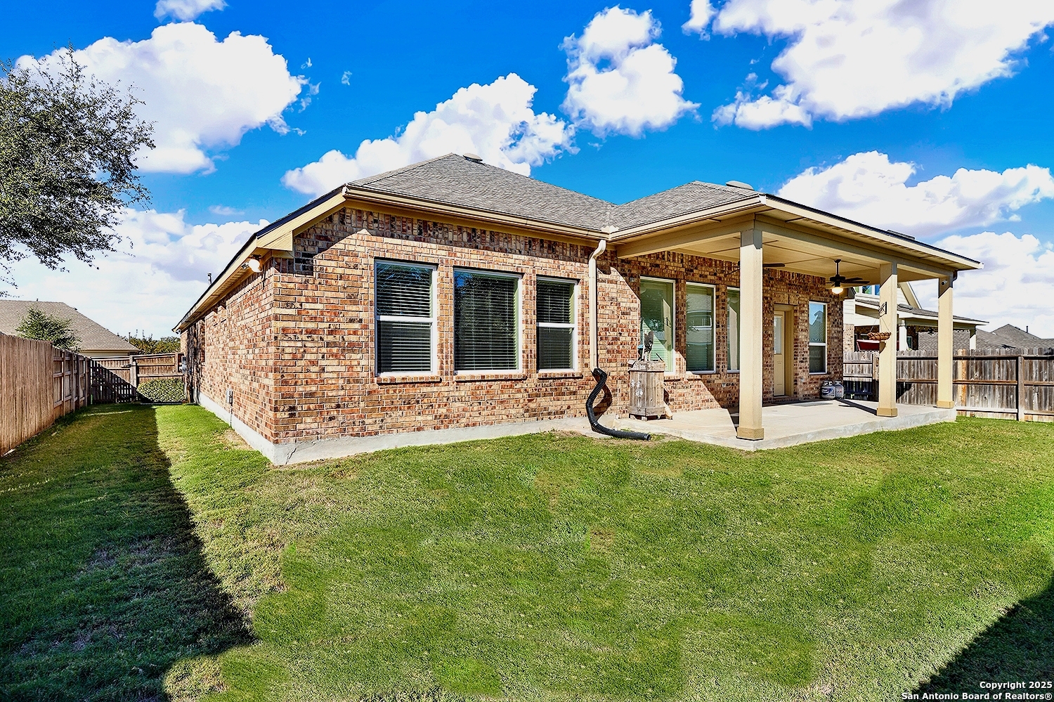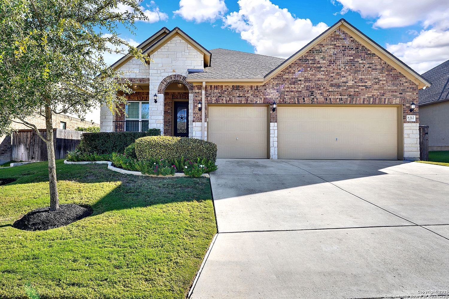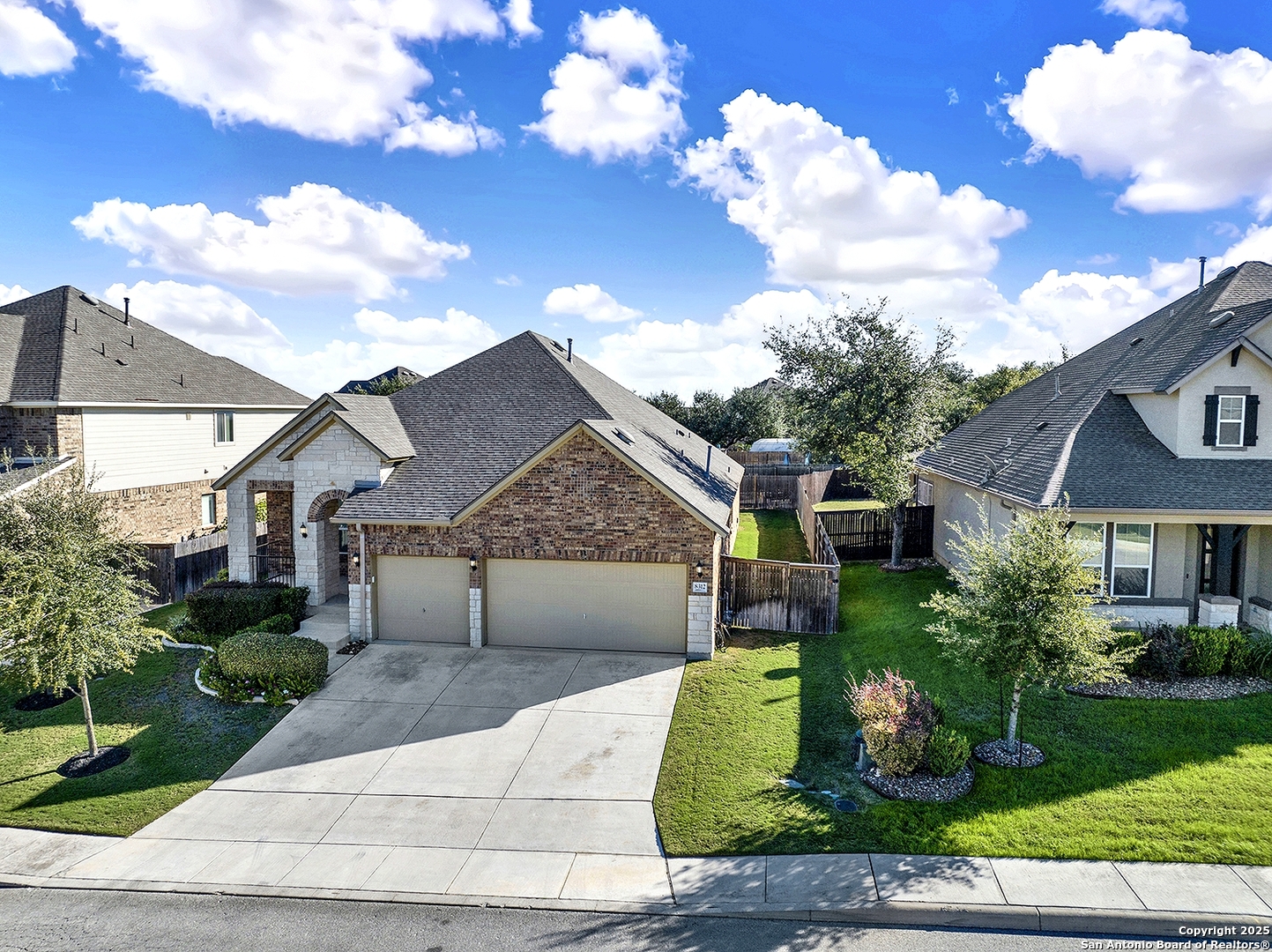 Single Story, 3 bedrooms plus a study that can be converted into a fourth bedroom, 2 full baths, and a 3-car garage across 2,255 square feet of thoughtfully designed living space. Welcome to 8312 Merchants Lodge, a meticulously maintained David Weekley Home built in 2018 that feels brand new. Located within the gated community of The Heights of Two Creeks, this home combines privacy, security, and convenience. Residents enjoy access to jogging and walking trails, a resort-style community pool, clubhouse, and sports center, creating an ideal setting for both recreation and relaxation. The location is truly unbeatable, just 2 minutes from I-10 and 10 minutes from Loop 1604, offering quick commutes to major employers, downtown San Antonio, and the Texas Hill Country. Everyday conveniences and entertainment are only minutes away, with The Rim Shopping Center just 8 minutes out and The Shops at La Cantera about 10 minutes away. Enjoy premier dining, shopping, and entertainment including popular spots like Bob's Steak & Chop House, The Rustic, and Signature, Inspired by Chefs, all within easy reach. Inside, you'll find high ceilings, abundant natural light, and an open-concept layout perfect for modern living. The spacious kitchen features granite countertops, a large island with bar seating, gas cooking, and plenty of storage, opening seamlessly to the dining and living areas. The primary suite offers an oversized walk-in closet, large walk-in shower, and double vanity. Each secondary bedroom includes its own walk-in closet, and there is a large coat closet near the entry for added convenience. Finishes include ceramic tile in wet areas, hardwood flooring in all bedrooms, faux wood blinds throughout, and a stone-and-brick exterior that enhances curb appeal. The covered patio with ceiling fans overlooks beautifully maintained landscaping, providing the perfect space for outdoor entertaining. The roof is just six years old, and the home's energy-efficient construction adds to its lasting value. This property offers the perfect blend of comfort, convenience, and community in one of San Antonio's most desirable neighborhoods, an ideal retreat for those seeking luxury living with everyday practicality.