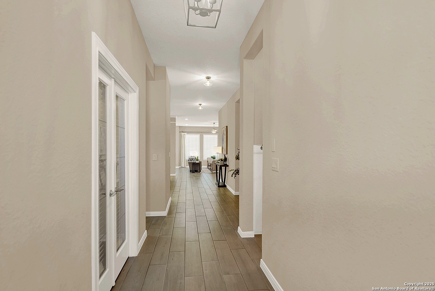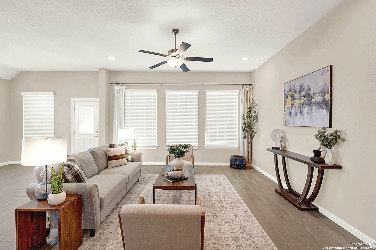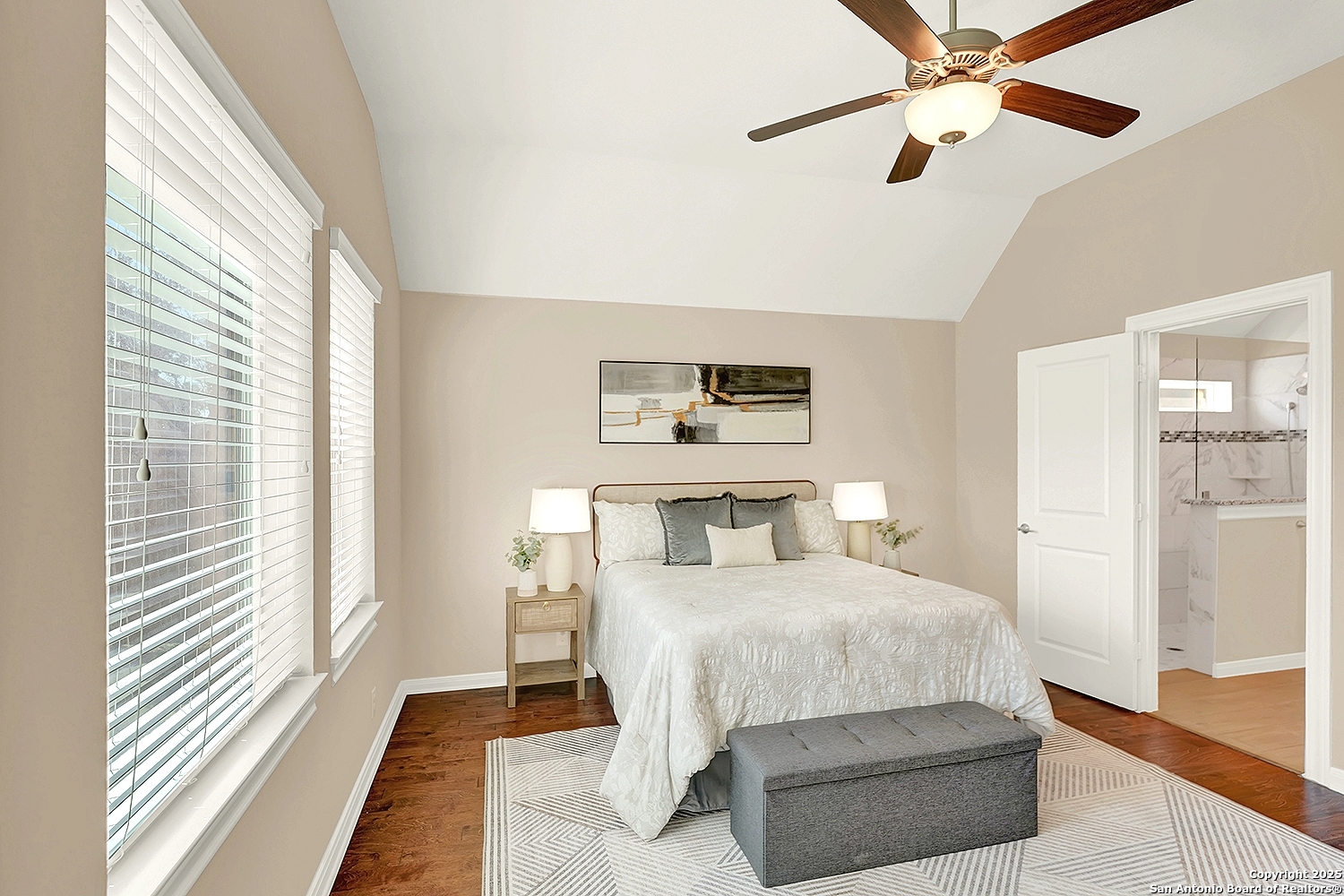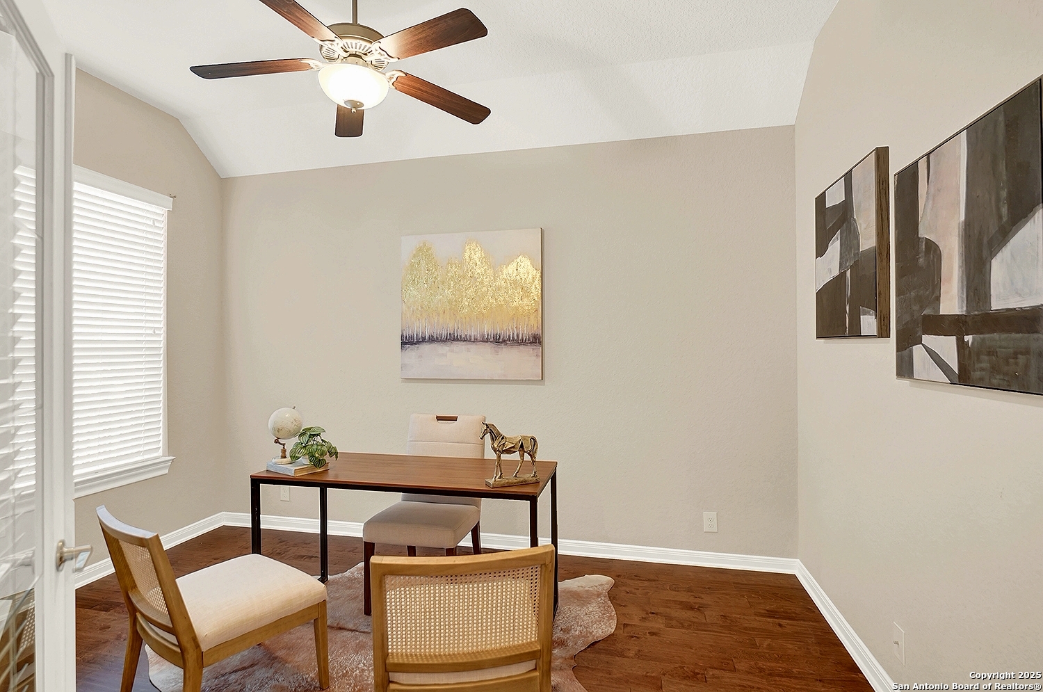 Single Story, 3 bedrooms plus a study that can be converted into a fourth bedroom, 2 full baths, and a 3-car garage across 2,255 square feet of thoughtfully designed living space. Welcome to 8312 Merchants Lodge, a meticulously maintained David Weekley Home built in 2018 that feels brand new. Located within the gated community of The Heights of Two Creeks, this home combines privacy, security, and convenience. Residents enjoy access to jogging and walking trails, a resort-style community pool, clubhouse, and sports center, creating an ideal setting for both recreation and relaxation. The location is truly unbeatable, just 2 minutes from I-10 and 10 minutes from Loop 1604, offering quick commutes to major employers, downtown San Antonio, and the Texas Hill Country. Everyday conveniences and entertainment are only minutes away, with The Rim Shopping Center just 8 minutes out and The Shops at La Cantera about 10 minutes away. Enjoy premier dining, shopping, and entertainment including popular spots like Bob's Steak & Chop House, The Rustic, and Signature, Inspired by Chefs, all within easy reach. Inside, you'll find high ceilings, abundant natural light, and an open-concept layout perfect for modern living. The spacious kitchen features granite countertops, a large island with bar seating, gas cooking, and plenty of storage, opening seamlessly to the dining and living areas. The primary suite offers an oversized walk-in closet, large walk-in shower, and double vanity. Each secondary bedroom includes its own walk-in closet, and there is a large coat closet near the entry for added convenience. Finishes include ceramic tile in wet areas, hardwood flooring in all bedrooms, faux wood blinds throughout, and a stone-and-brick exterior that enhances curb appeal. The covered patio with ceiling fans overlooks beautifully maintained landscaping, providing the perfect space for outdoor entertaining. The roof is just six years old, and the home's energy-efficient construction adds to its lasting value. This property offers the perfect blend of comfort, convenience, and community in one of San Antonio's most desirable neighborhoods, an ideal retreat for those seeking luxury living with everyday practicality.