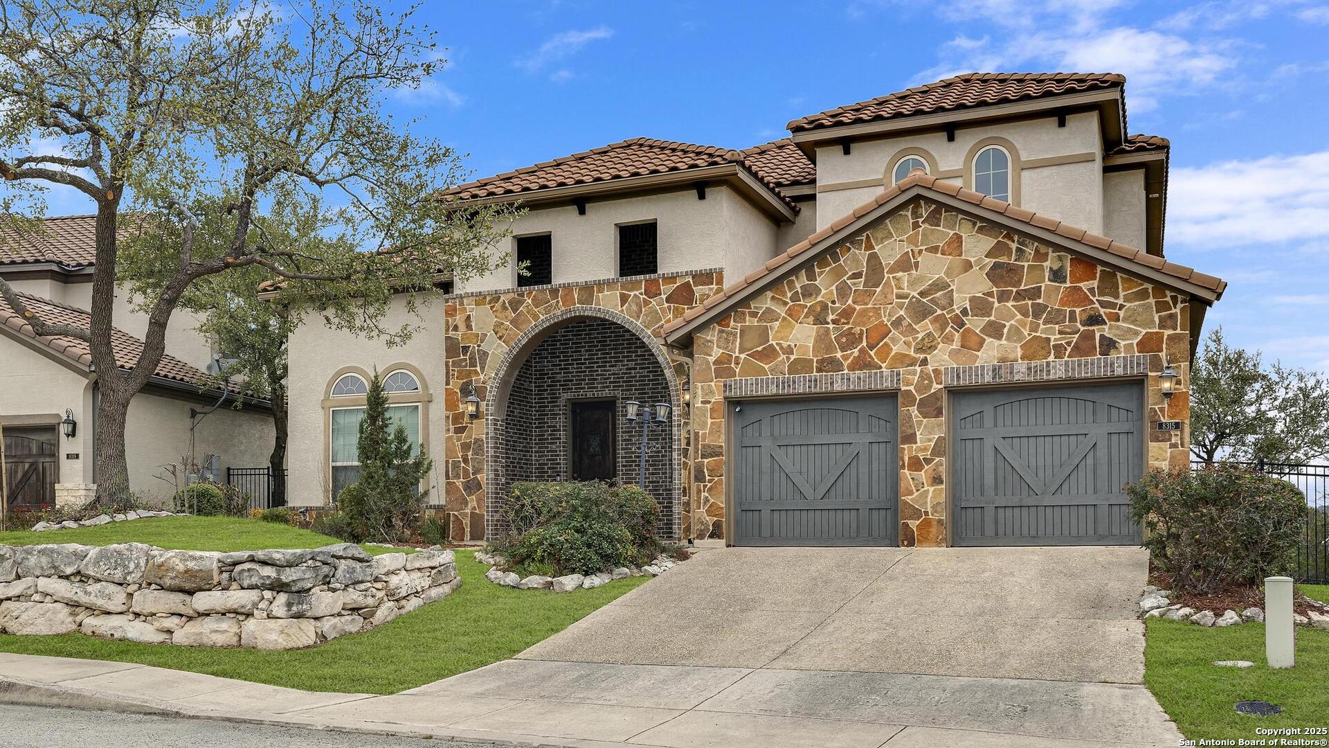 This stunning 2-story Panoramic Hill Country view home offers 4386 sq. ft. of luxurious living space, including 5 bedrooms, 4 full baths, and 3 tandem car garages. Covered patio and upstairs balcony with fantastic views. As you step through the door you are greeted with a grand entry, highlighted by a spiral staircase, soaring high ceilings, and crown molding throughout. Immaculate wood flooring and an open floor plan seamlessly connect the living spaces. The family room is bathed in natural light from its expansive windows. A large granite island in the kitchen, gas cooking. Upstairs boasts a generously sized game room and a dedicated media room perfect for entertaining or relaxing. The home also includes an office and a formal dining area. The covered backyard patio and sprinkler system make for easy outdoor living. Ideally located just minutes from UTSA, The Shops at La Cantera, and within the highly sought-after Northside ISD.