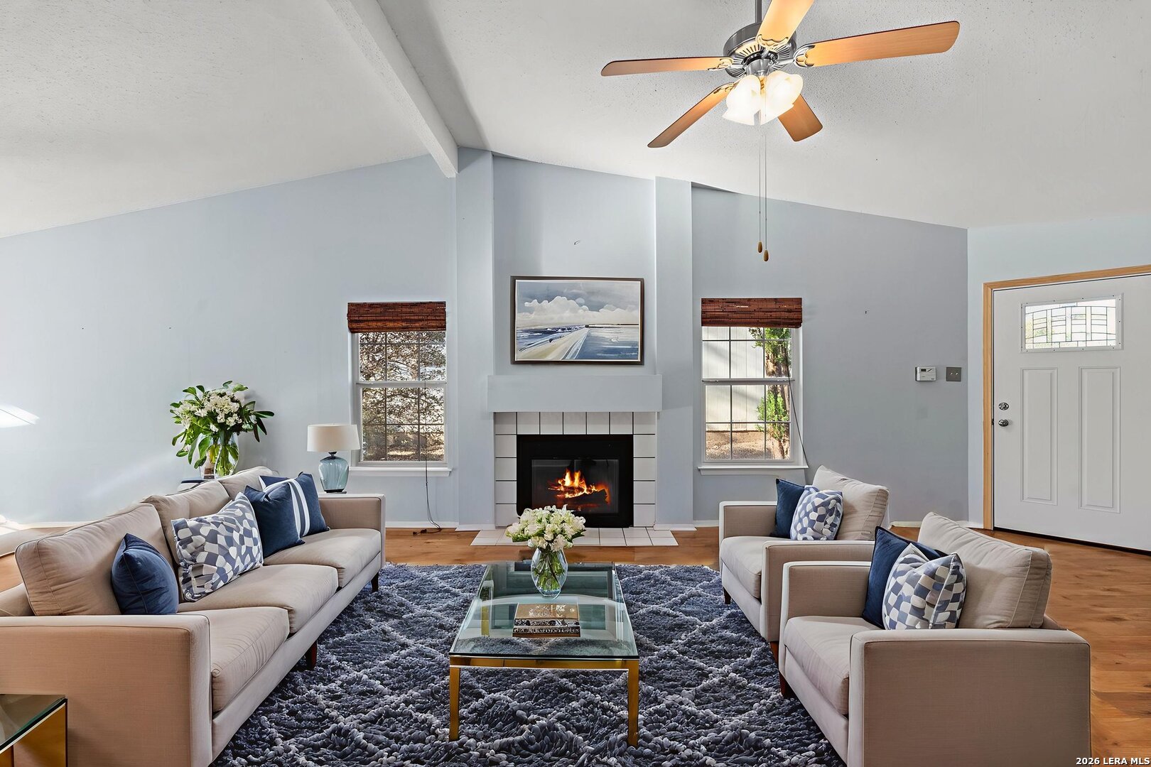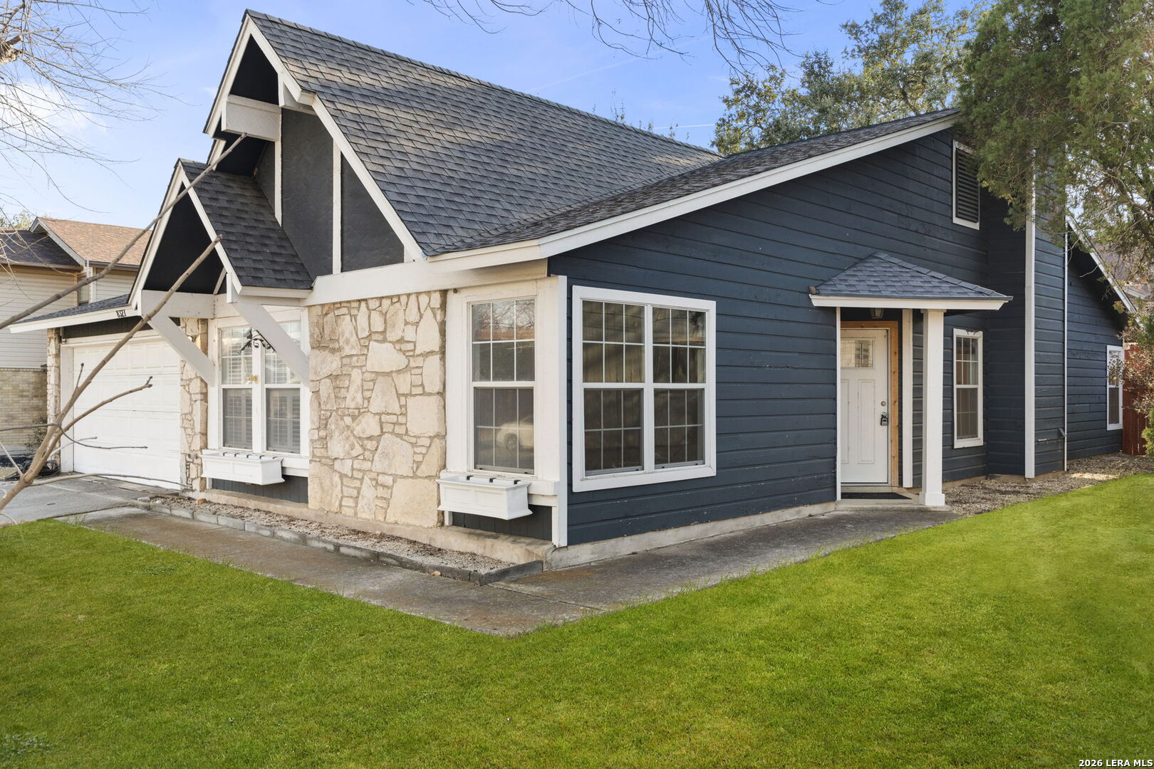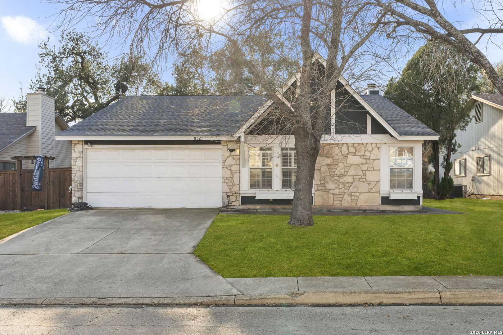 Welcome home to this charming single-story gem offering 3 bedrooms, 2 baths, and a 2-car attached garage-all designed for comfortable, easy living. Step inside to a spacious living and dining room combination featuring high ceilings and a cozy fireplace that creates the perfect focal point for gatherings or quiet evenings at home. The kitchen is both stylish and functional, showcasing granite countertops, ample cabinetry, and an additional eating area ideal for casual meals or morning coffee. The open layout keeps everyone connected while still providing defined spaces. The private primary suite offers a relaxing retreat with a full bath that includes a double vanity and an oversized walk-in shower. A thoughtfully designed walk-through laundry area connects the primary bedroom to the kitchen, adding everyday convenience right where you need it most. Wood-look flooring and tile flows throughout the home-no carpet, just a clean, cohesive look that's both modern and low maintenance. Conveniently located with quick access to Highway 151 and Loop 410, this home makes commuting, shopping, and dining a breeze.