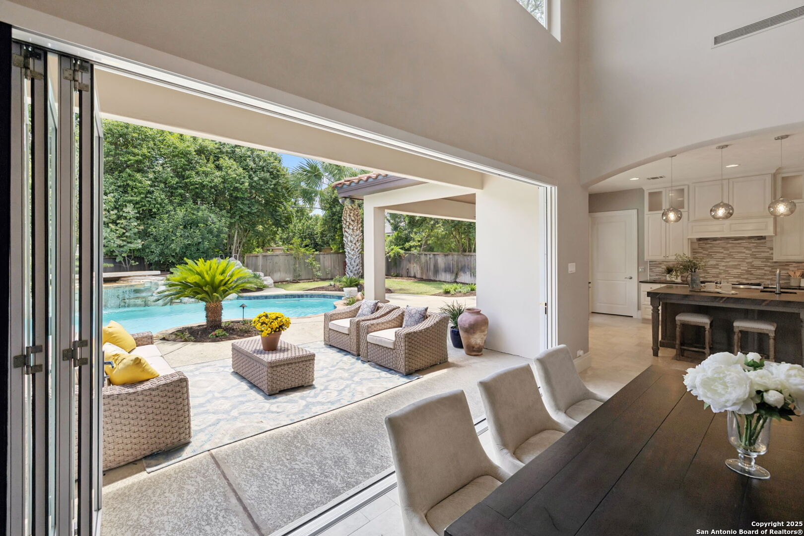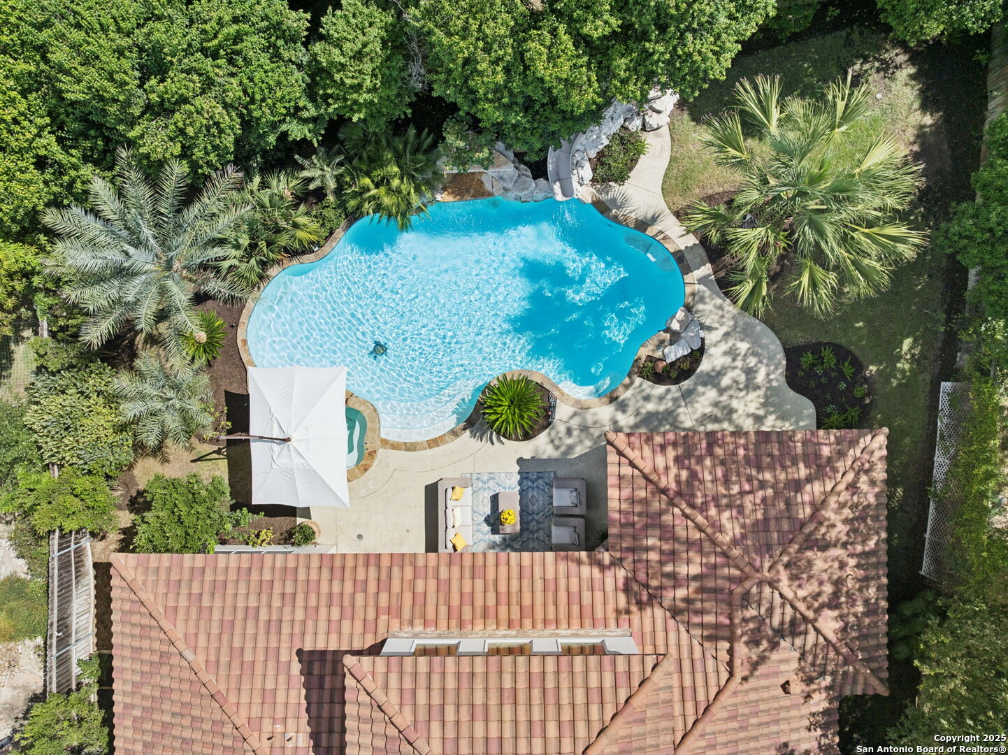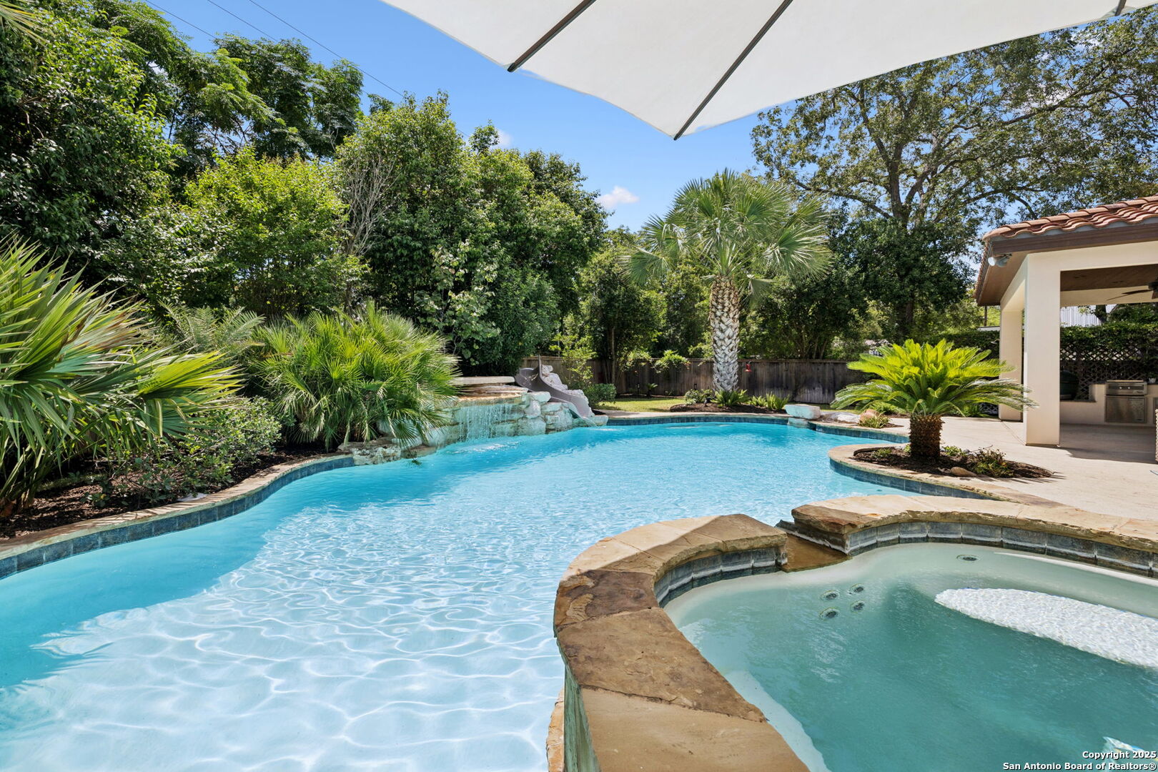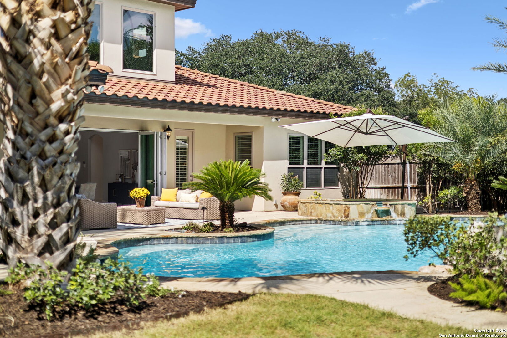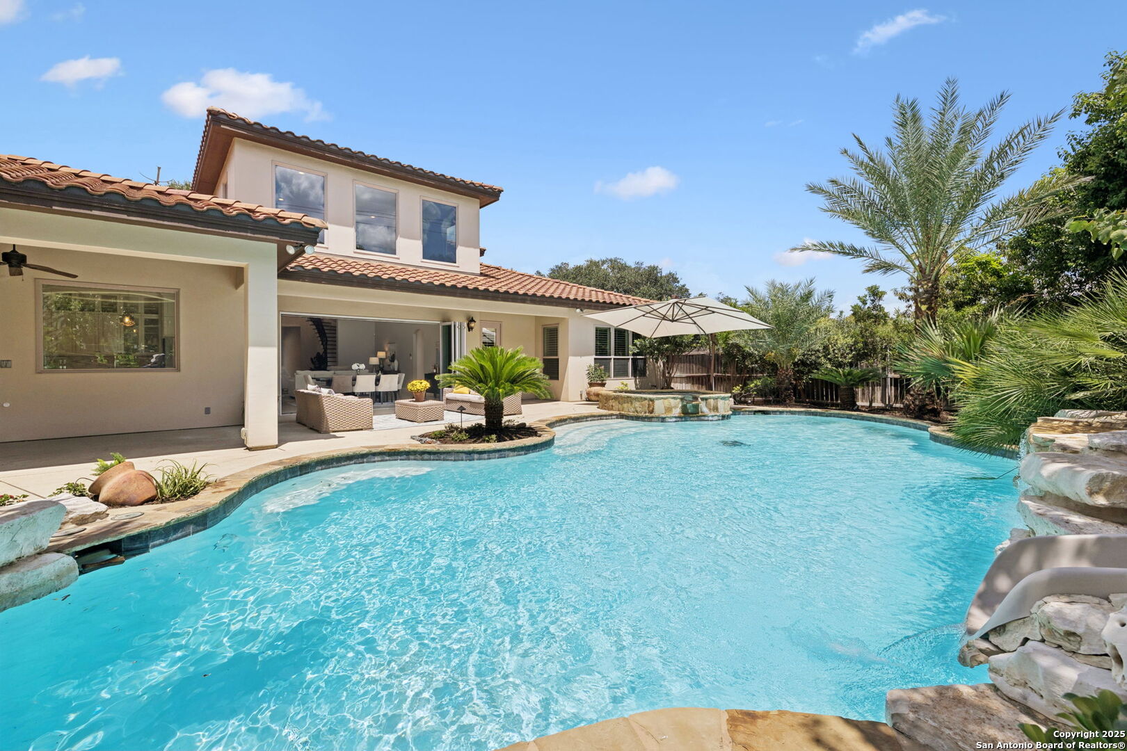 In one of San Antonio's most coveted ultra-luxury communities, this Burdick custom home pairs beautifully finished interiors with a year-round resort atmosphere. Hardwood and travertine floors lead through open, light-filled spaces with 25-foot ceilings, where quartzite and honed granite surfaces and striking light fixtures set an elevated tone. Two bedrooms, including the primary suite, are on the main level along with a private office and media room. The kitchen is anchored by a handsome stainless Wolf gas range and custom cabinetry. The primary suite features an incredible walk-in closet and a bath with a steam shower and a dramatic marble wall above the tub. Upstairs, a generous flex space adapts for storage, fitness, or a second office. Glass accordion doors open to a Keith Zars pool and spa with natural rock waterfall and slide, an outdoor kitchen with built-in grill and Green Egg, and an outdoor shower surrounded by lush landscaping and shaded terraces. 4 bed 4 bath 4258 sq ft .32 acre 25 ft ceilings Private study Media room Flex room Pool + spa w outdoor shower 3 car garage